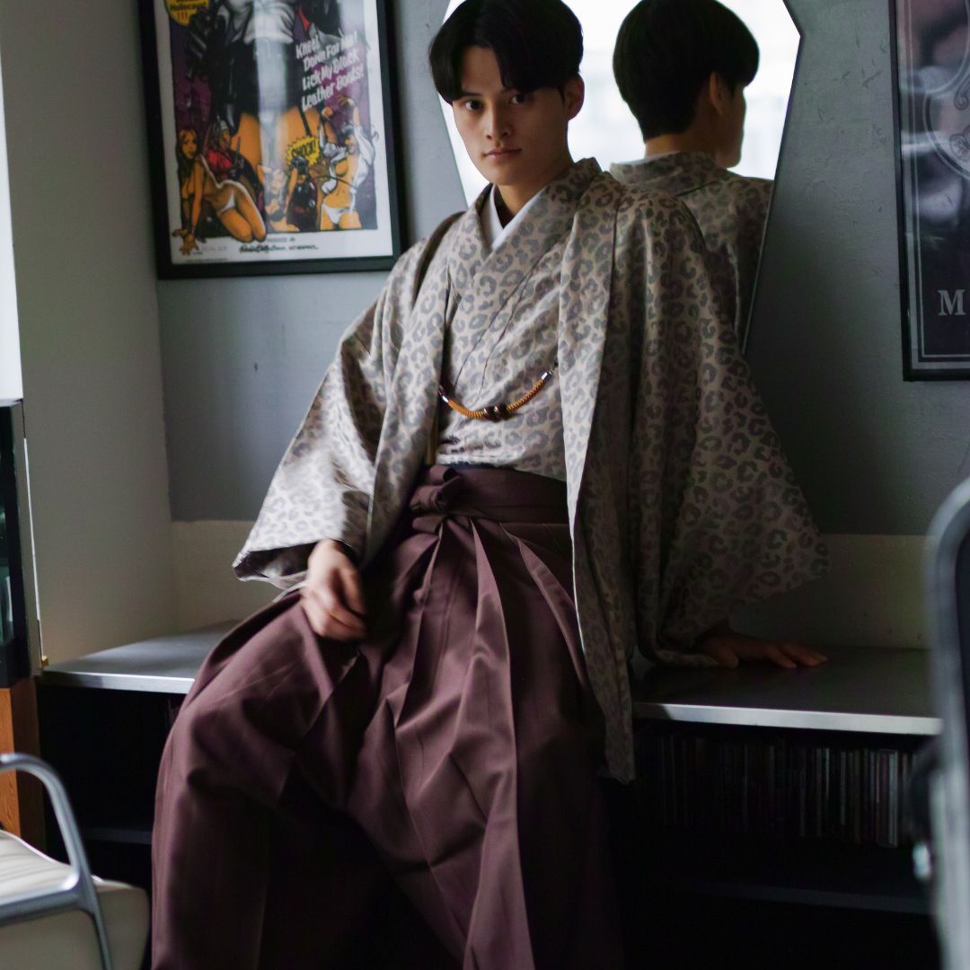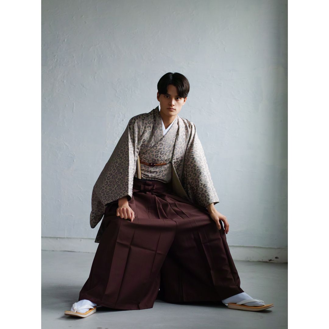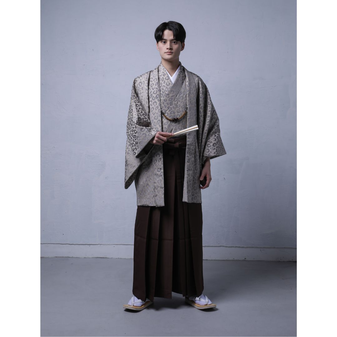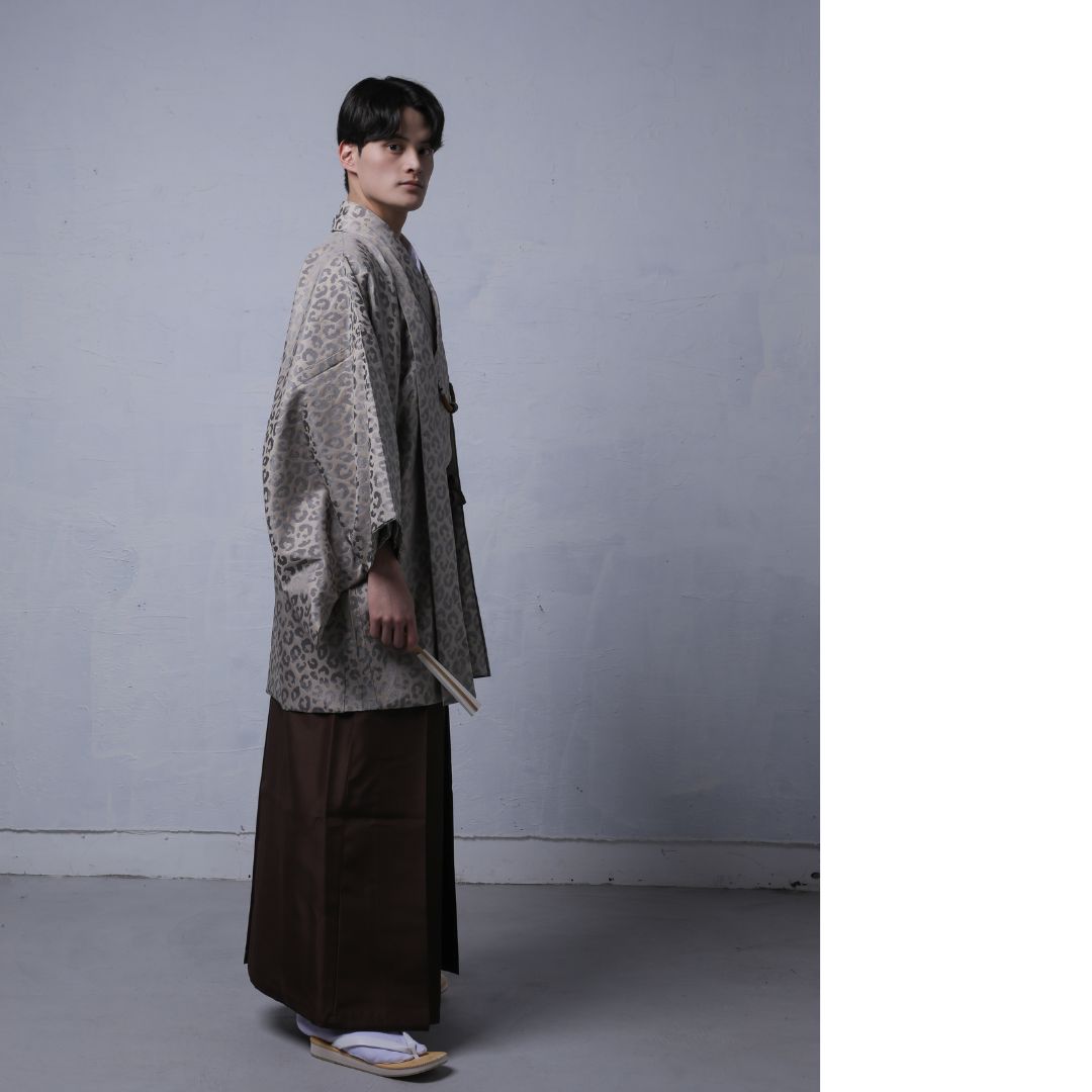 【対応身長170cm-180cm】男性用レンタル紋付き袴フルセットremhs-6001-95| 夢助|ベージュ豹柄着物|ベージュ豹柄羽織|ブラウン馬乗り袴|