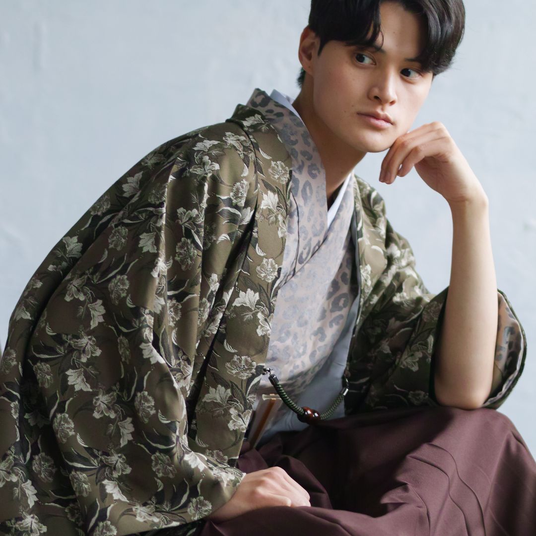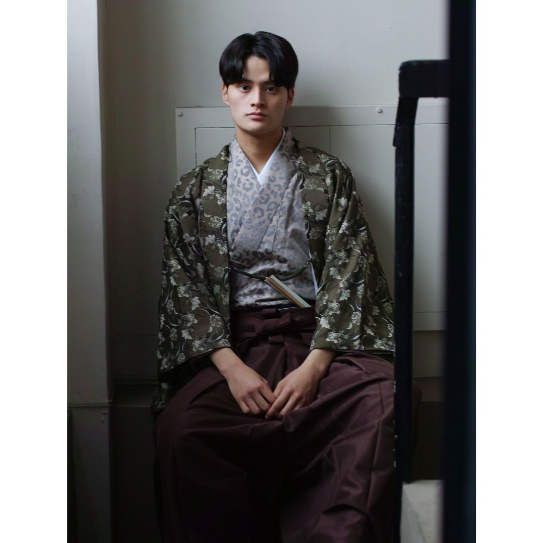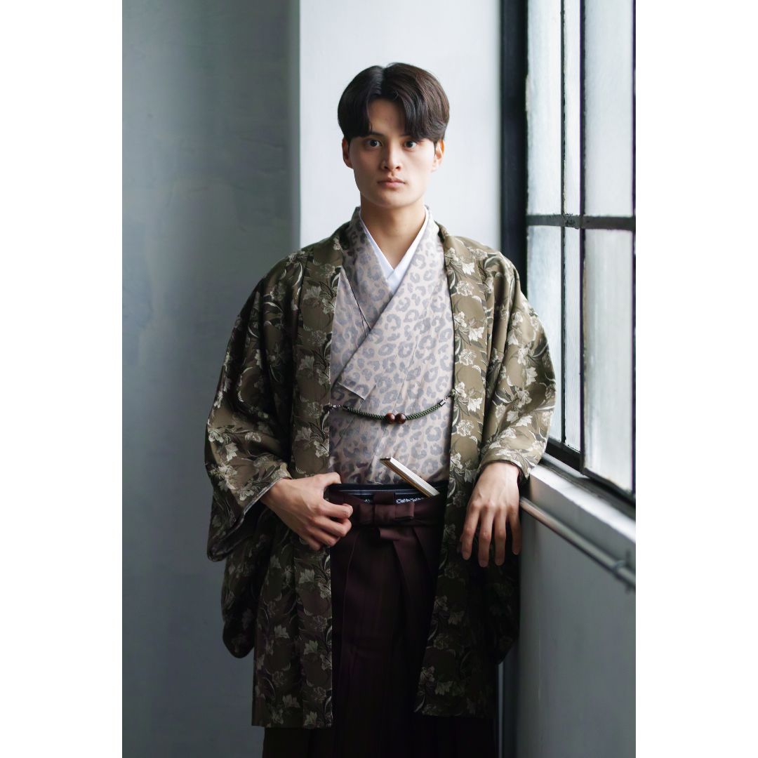 【対応身長170cm-180cm】男性用レンタル紋付き袴フルセットremhs-6002-95| 夢助|ベージュ豹柄着物|緑ボタニカル柄羽織|ブラウン馬乗り袴|