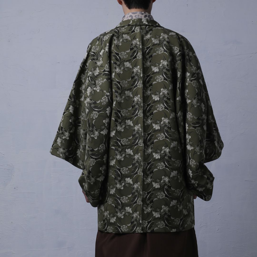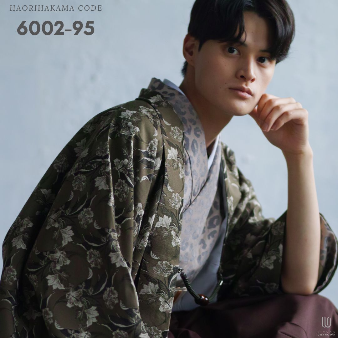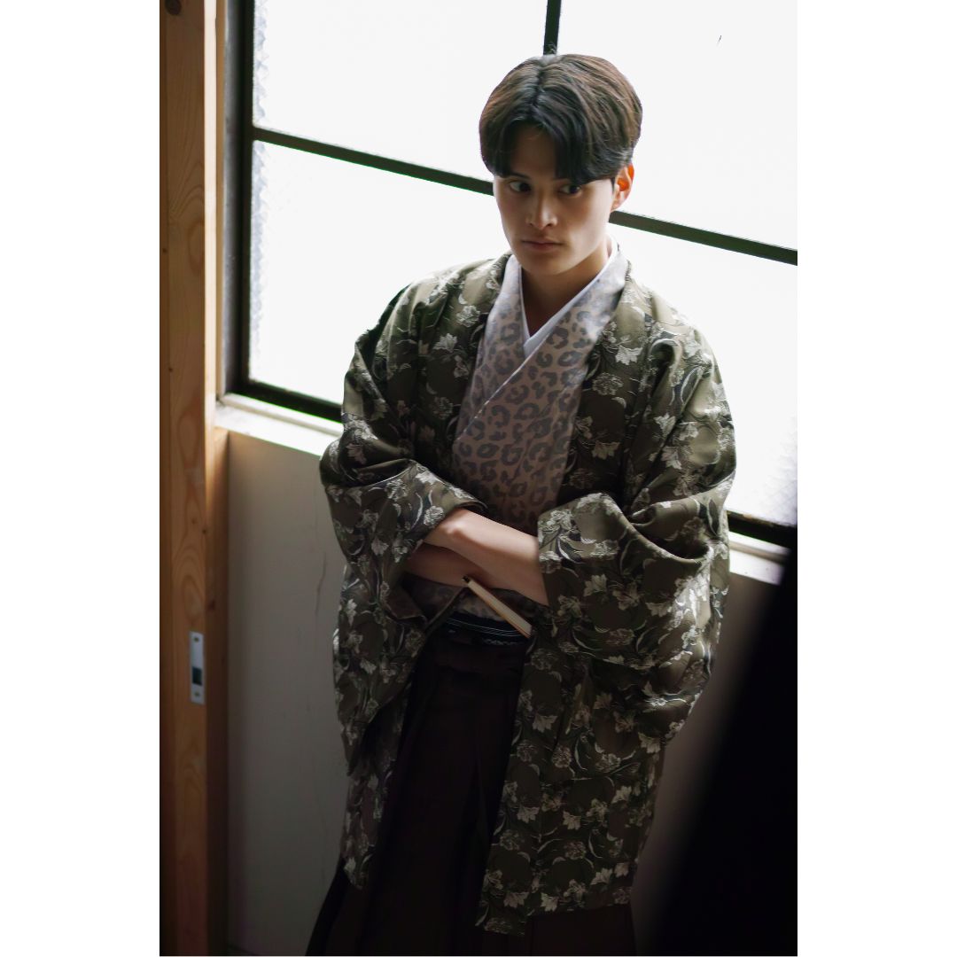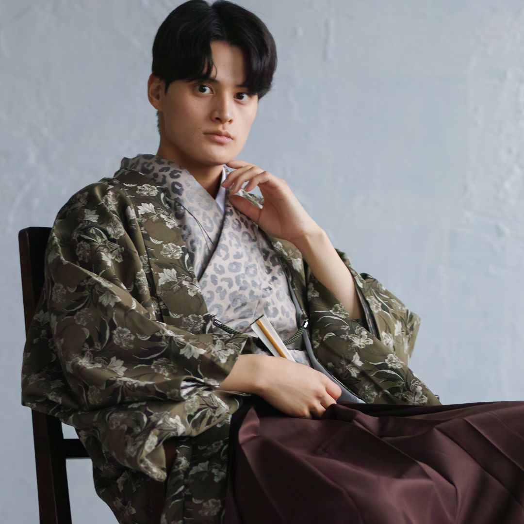 【対応身長170cm-180cm】男性用レンタル紋付き袴フルセットremhs-6002-95| 夢助|ベージュ豹柄着物|緑ボタニカル柄羽織|ブラウン馬乗り袴|