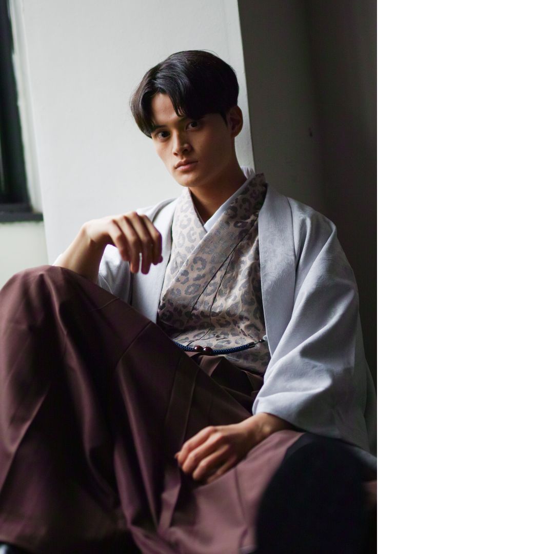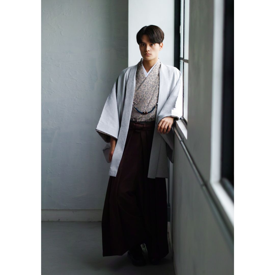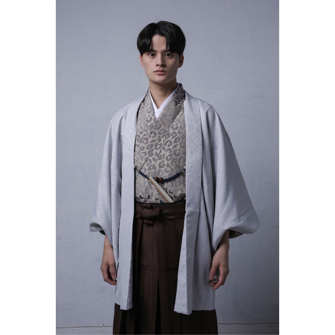 【対応身長160cm-170cm】男性用レンタル紋付き袴フルセットremhs-6003-87| 夢助|ベージュ豹柄着物|グレーボタニカル柄羽織|ブラウン馬乗り袴|