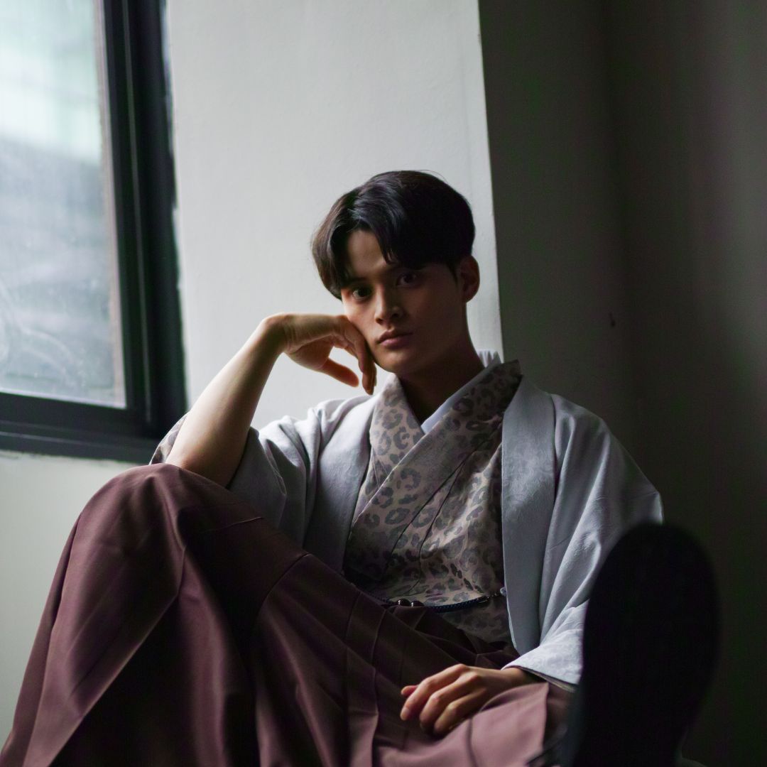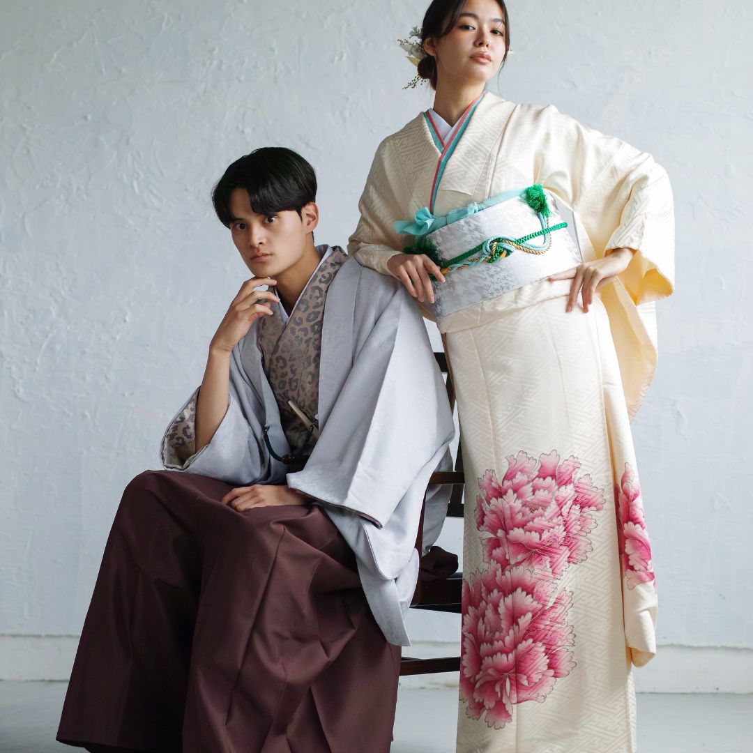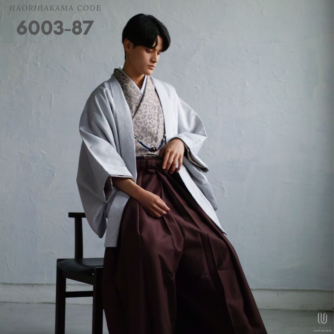 【対応身長160cm-170cm】男性用レンタル紋付き袴フルセットremhs-6003-87| 夢助|ベージュ豹柄着物|グレーボタニカル柄羽織|ブラウン馬乗り袴|