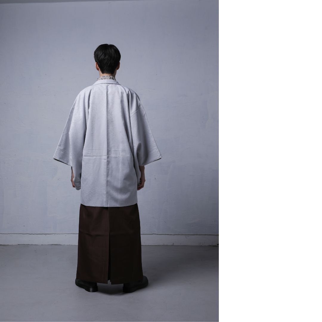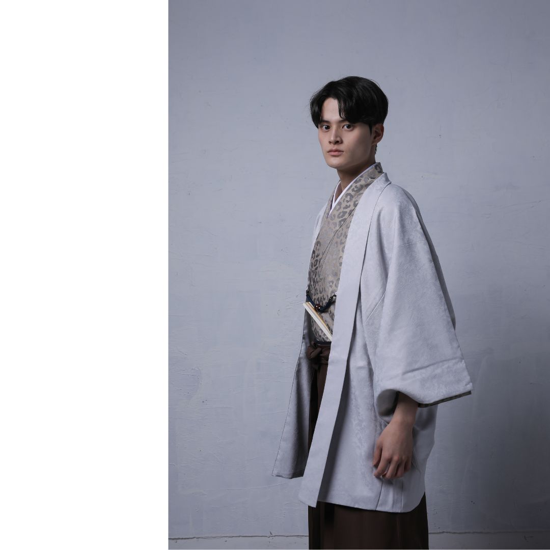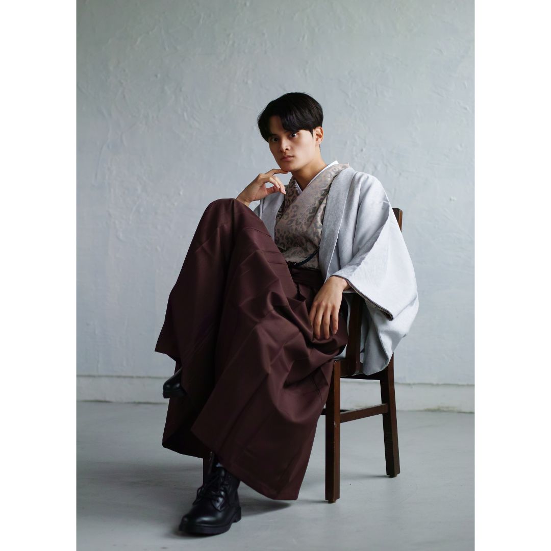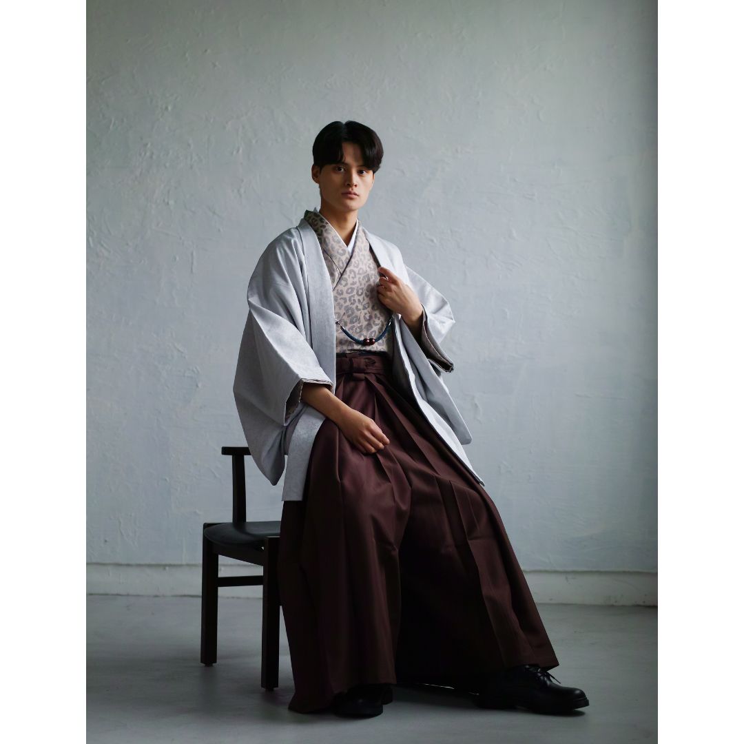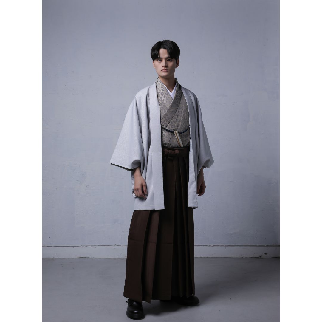 【対応身長170cm-180cm】男性用レンタル紋付き袴フルセットremhs-6003-95| 夢助|ベージュ豹柄着物|グレーボタニカル柄羽織|ブラウン馬乗り袴|