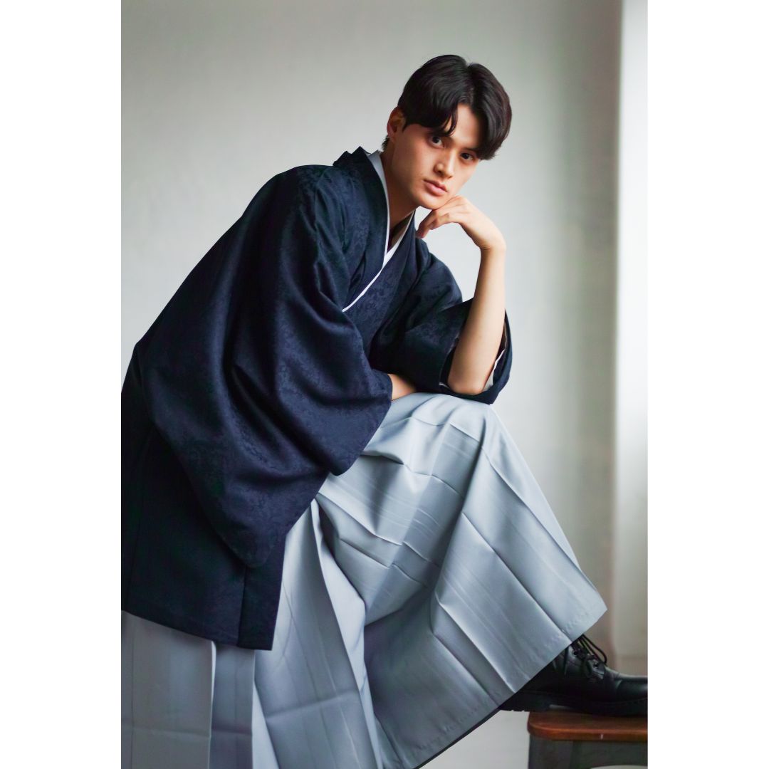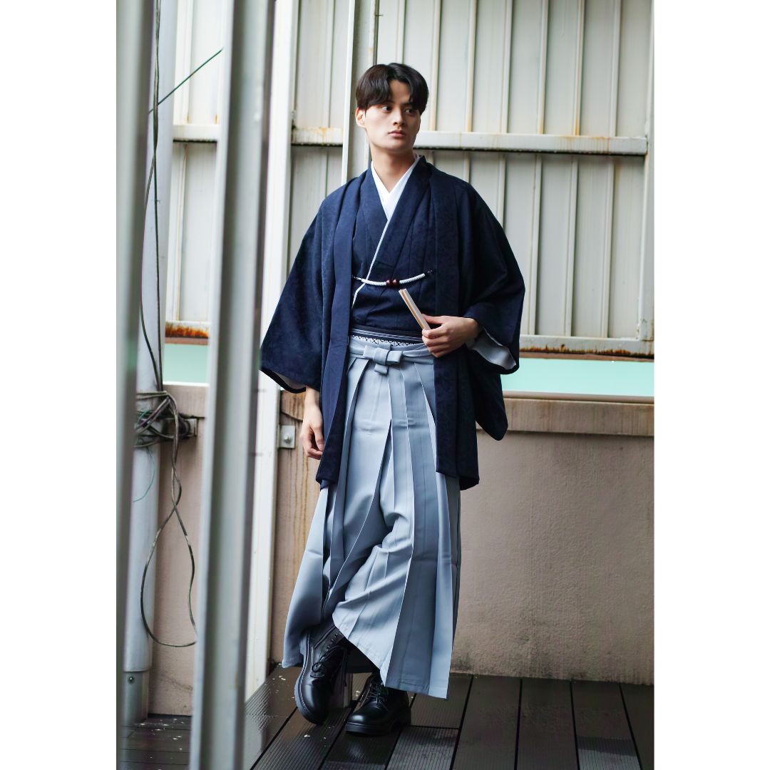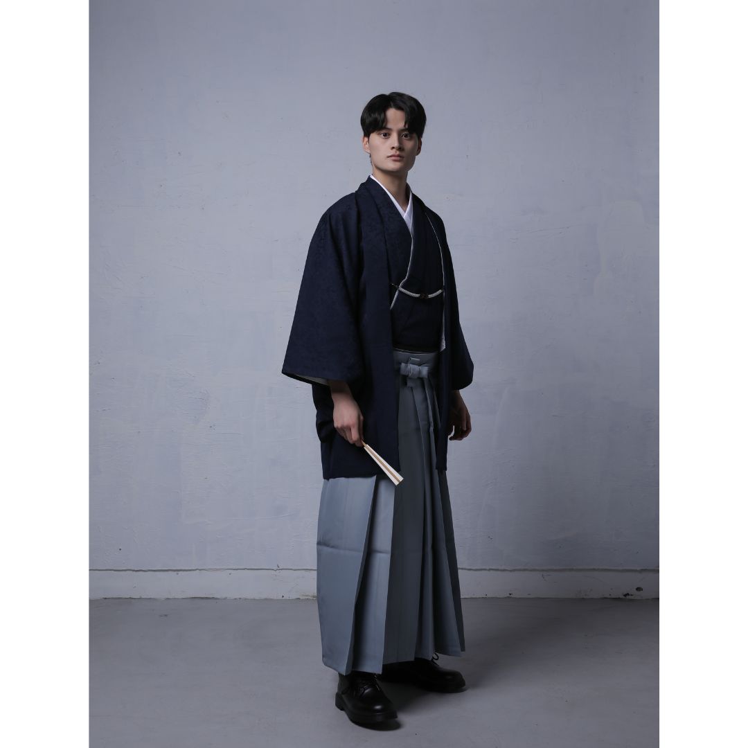 【対応身長170cm-180cm】男性用レンタル紋付き袴フルセットremhs-6004-95| 夢助|ネイビーボタニカル柄着物|ネイビーボタニカル柄羽織|グレー馬乗り袴|