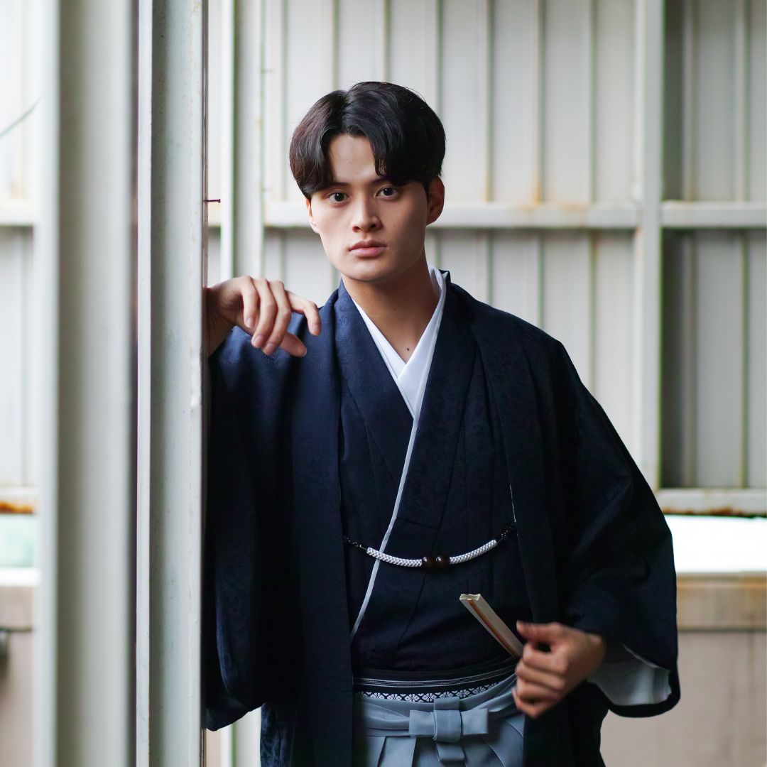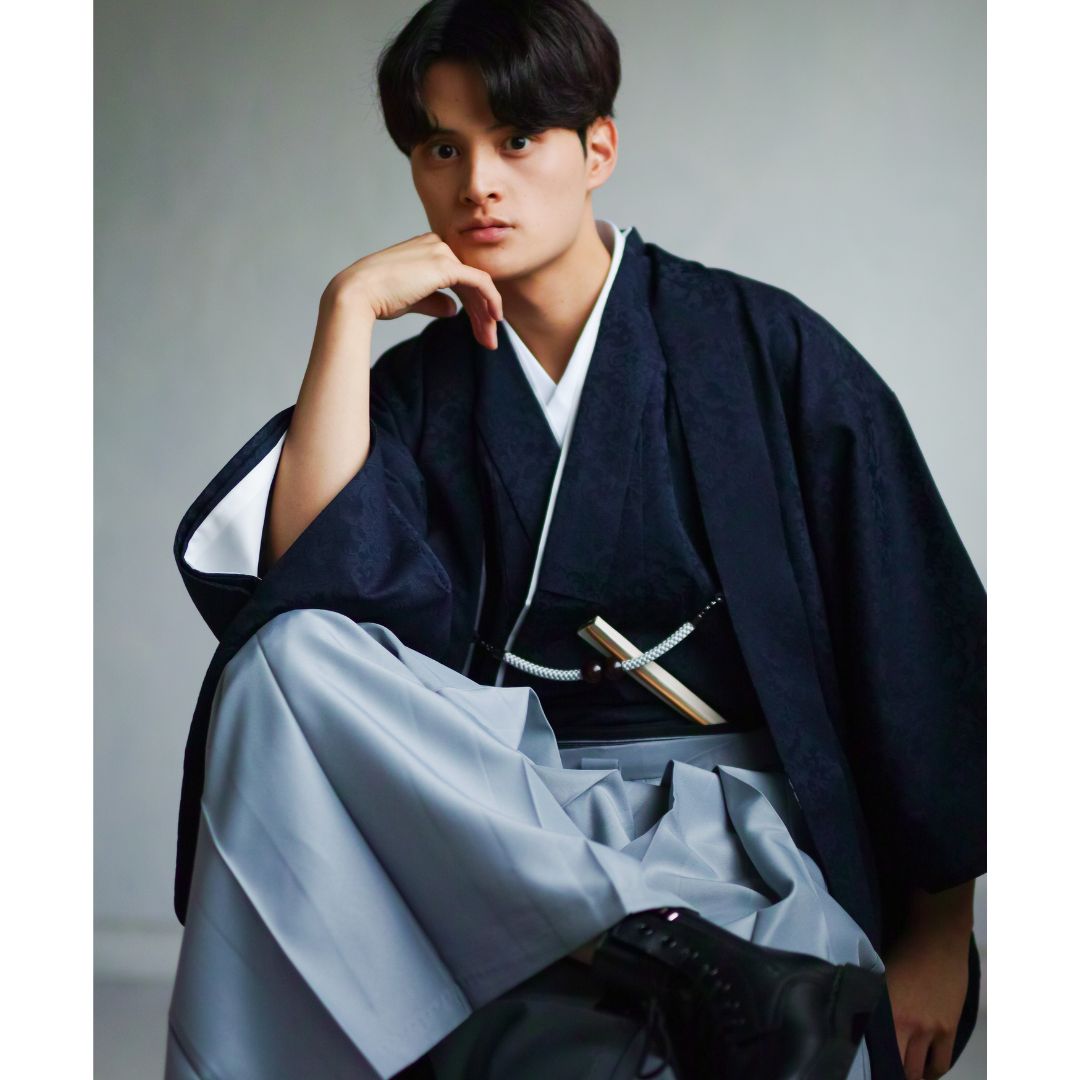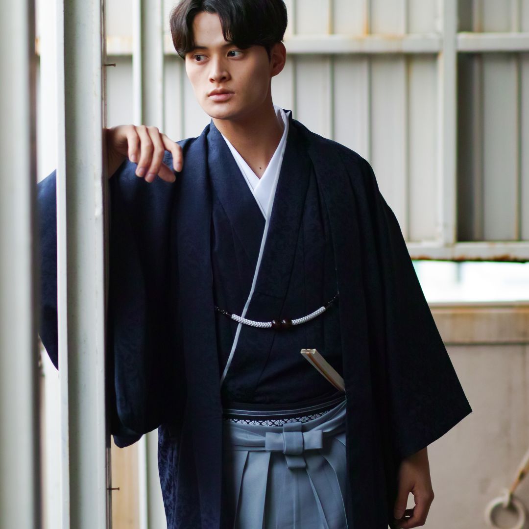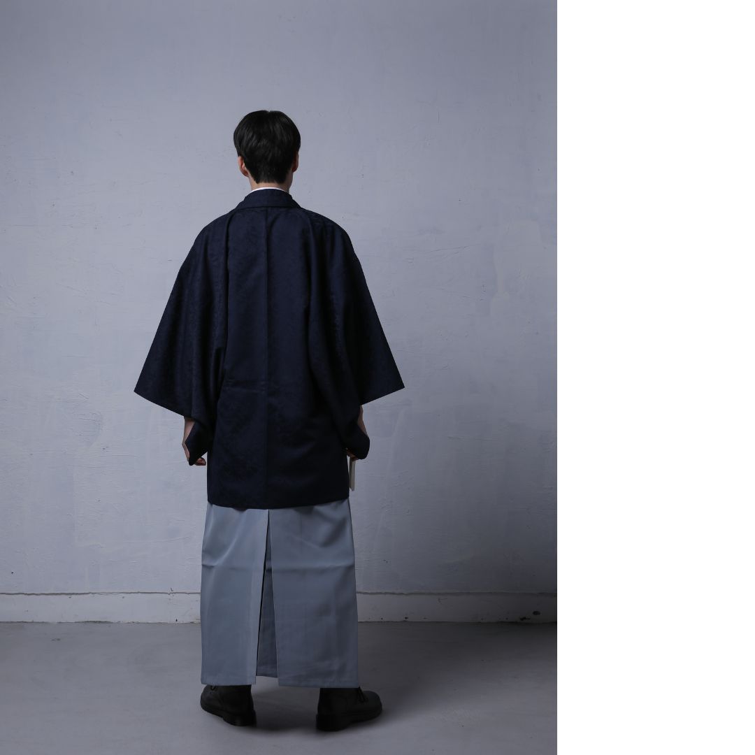 【対応身長170cm-180cm】男性用レンタル紋付き袴フルセットremhs-6004-95| 夢助|ネイビーボタニカル柄着物|ネイビーボタニカル柄羽織|グレー馬乗り袴|