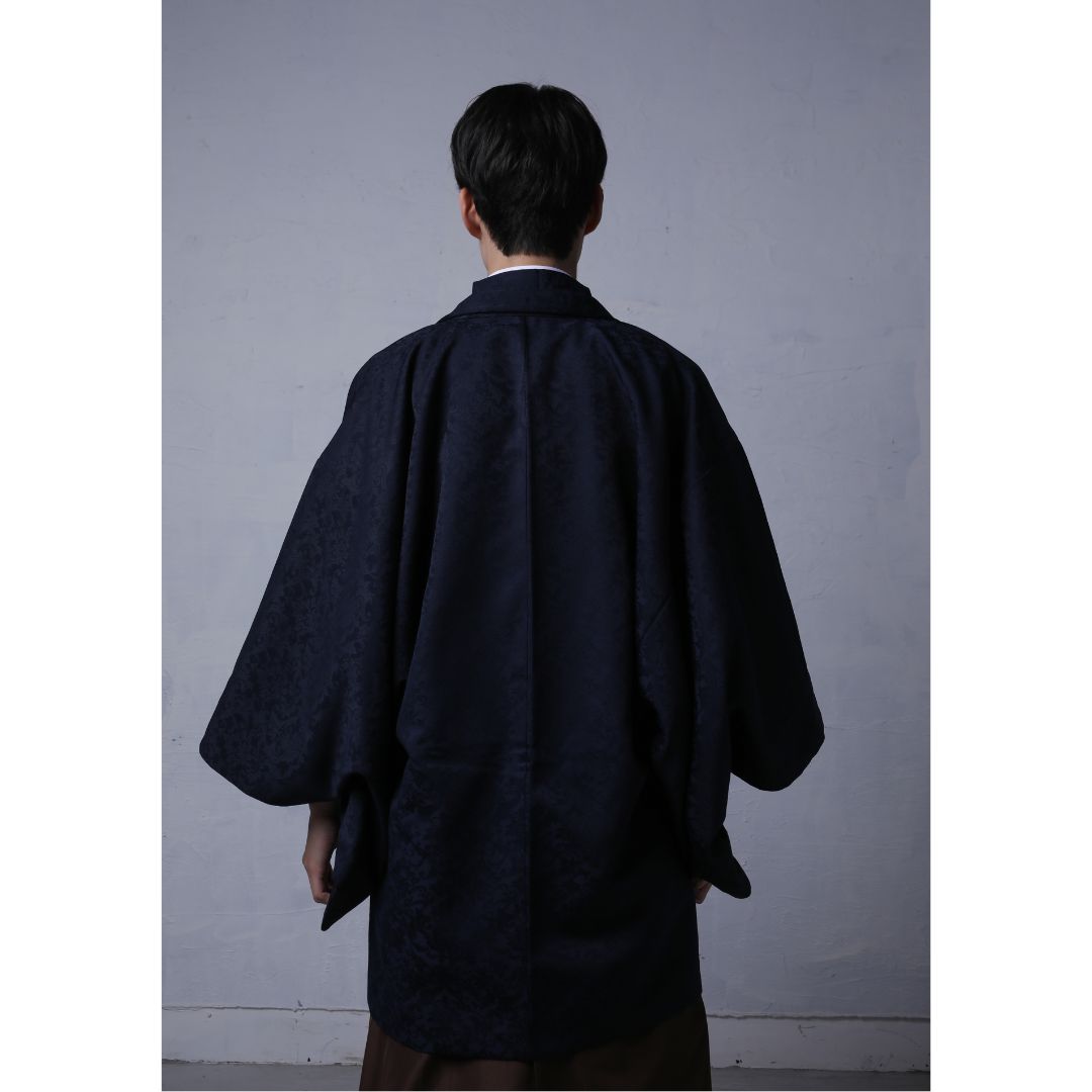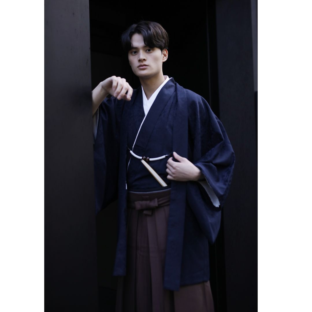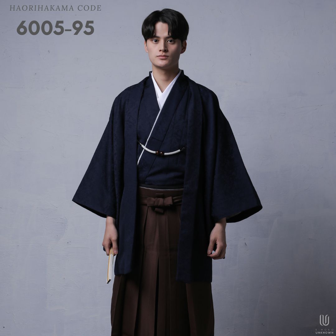 【対応身長170cm-180cm】男性用レンタル紋付き袴フルセットremhs-6005-95| 夢助|ネイビーボタニカル柄着物|ネイビーボタニカル柄羽織|ブラウン馬乗り袴|