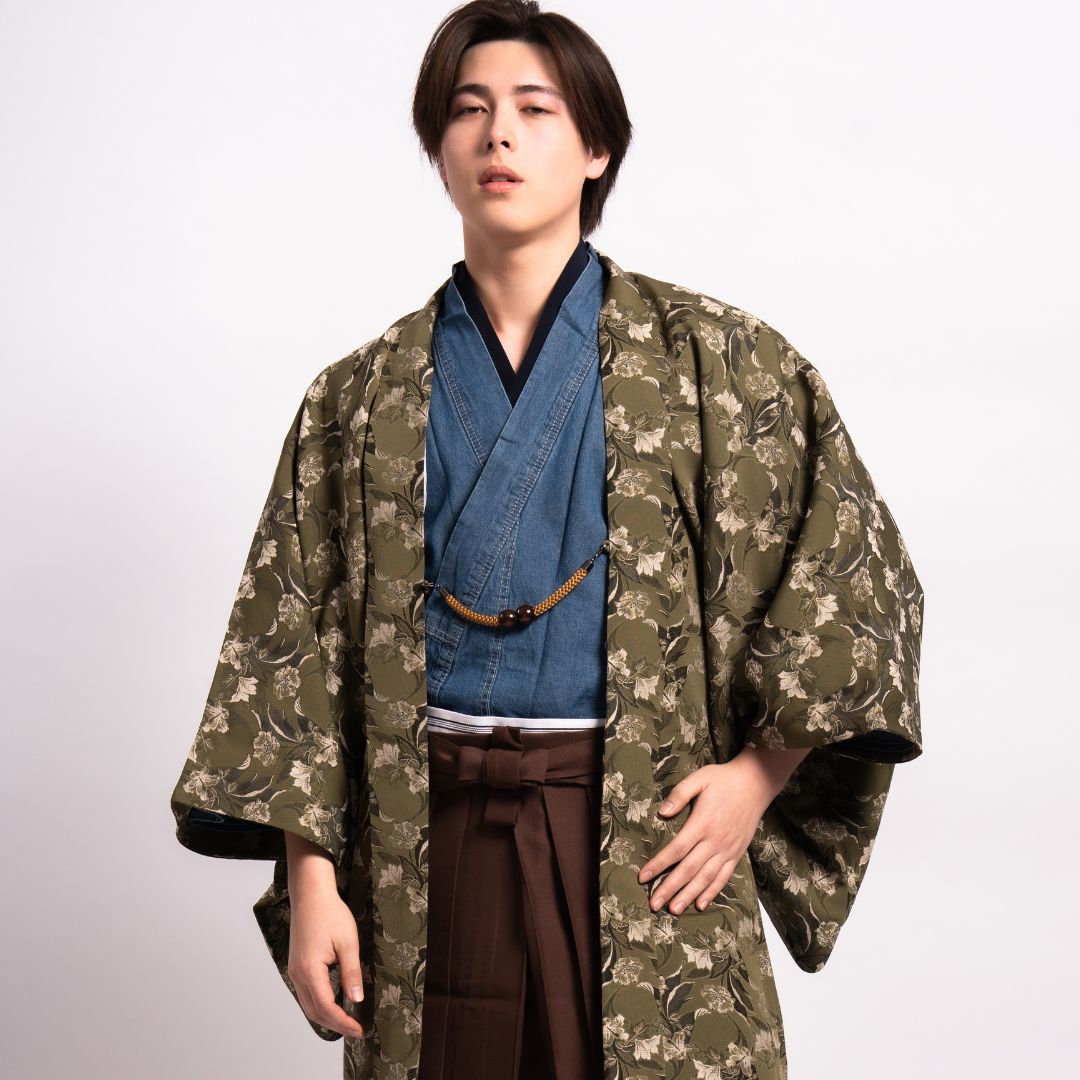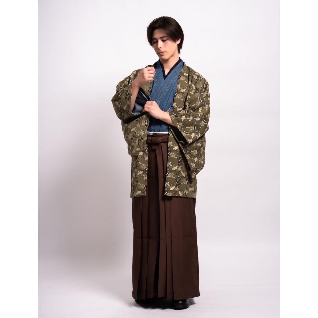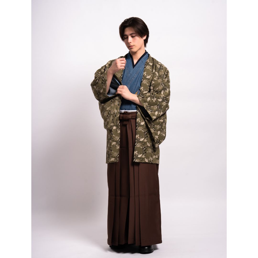 【対応身長170cm-180cm】男性用レンタル紋付き袴フルセットremhs-6006-95| 夢助|インディゴダメージデニム着物|グリーンボタニカル柄羽織|ブラウン馬乗り袴|