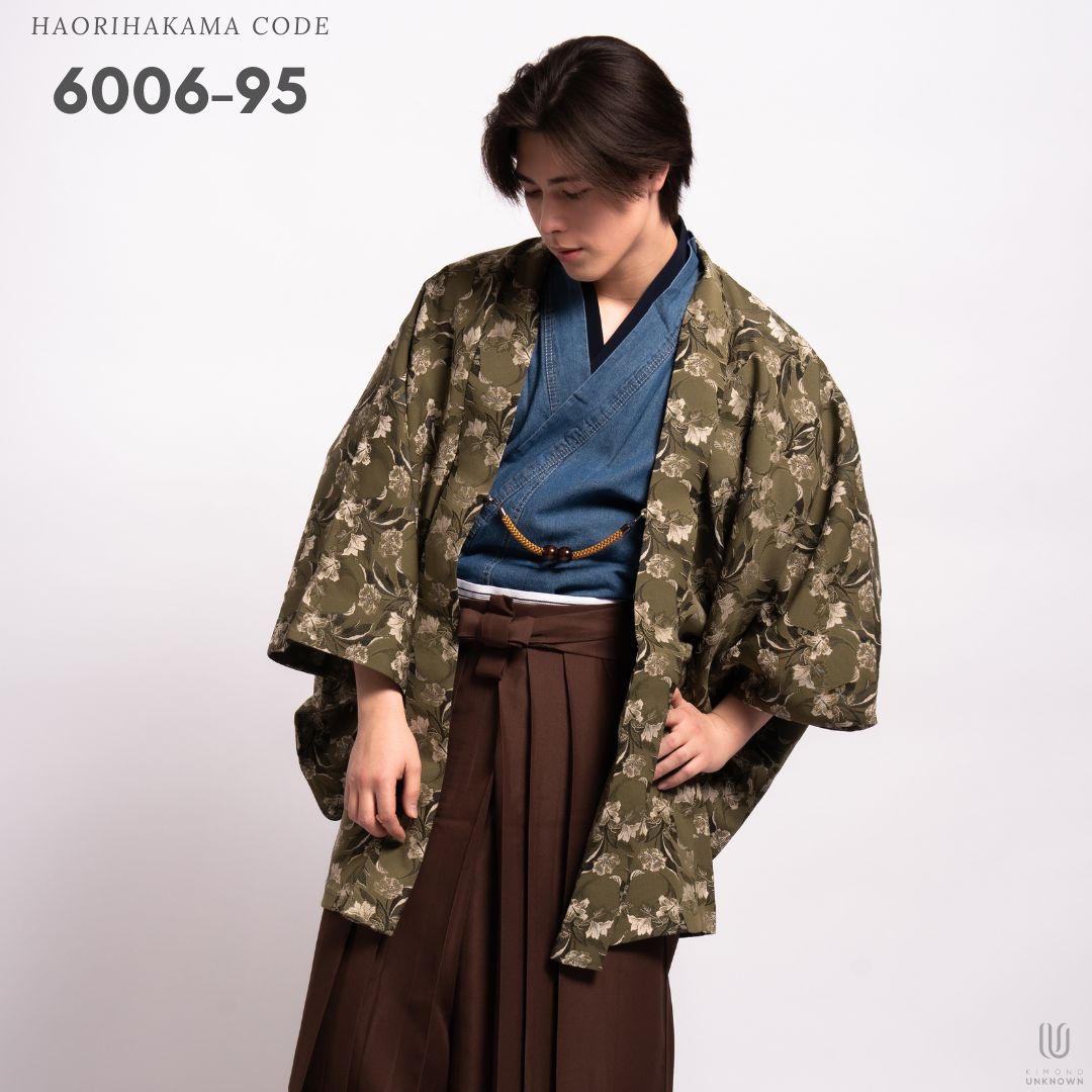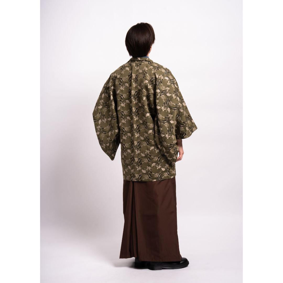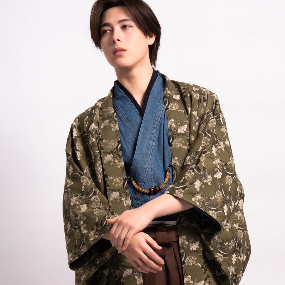 【対応身長170cm-180cm】男性用レンタル紋付き袴フルセットremhs-6006-95| 夢助|インディゴダメージデニム着物|グリーンボタニカル柄羽織|ブラウン馬乗り袴|