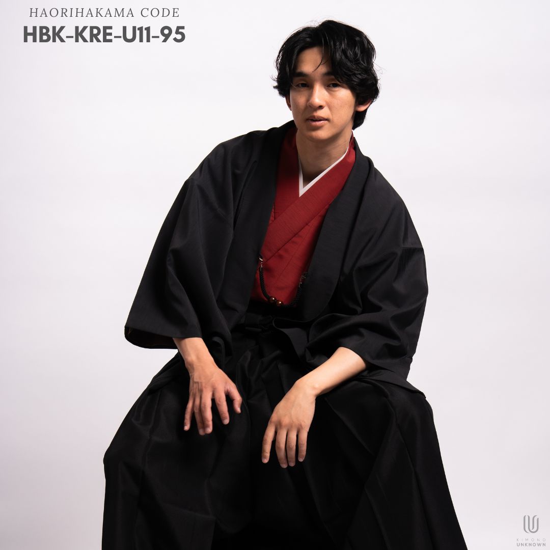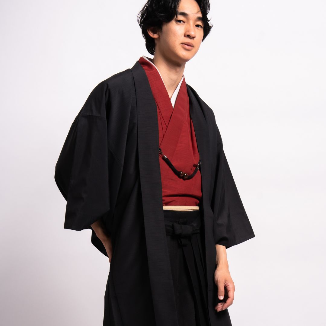 【対応身長170cm-180cm】男性用レンタル紋付き袴フルセットremhs-hbk-kre-u11-95|レッド無地着物|ブラック無地羽織|ブラック馬乗り袴|