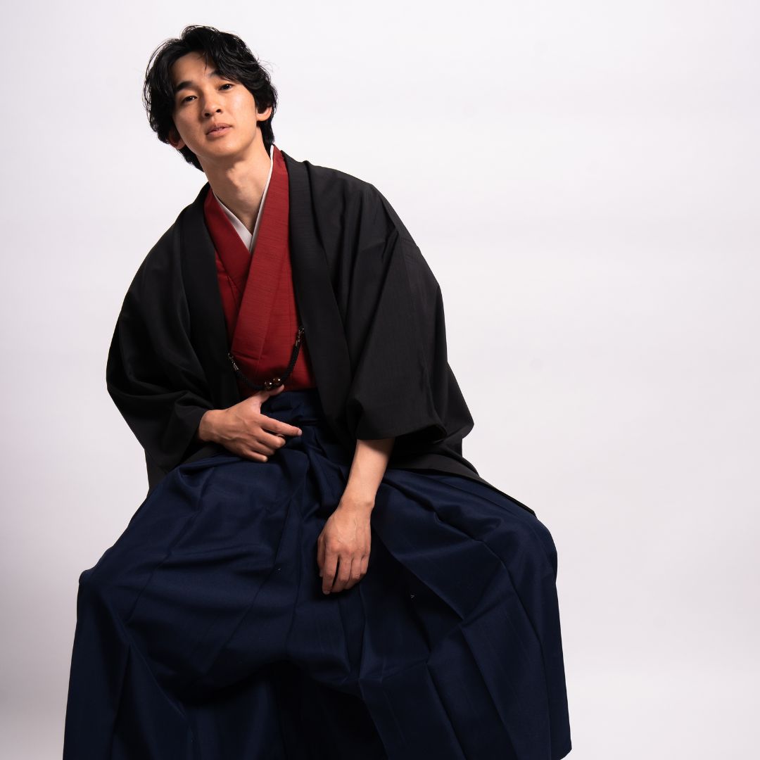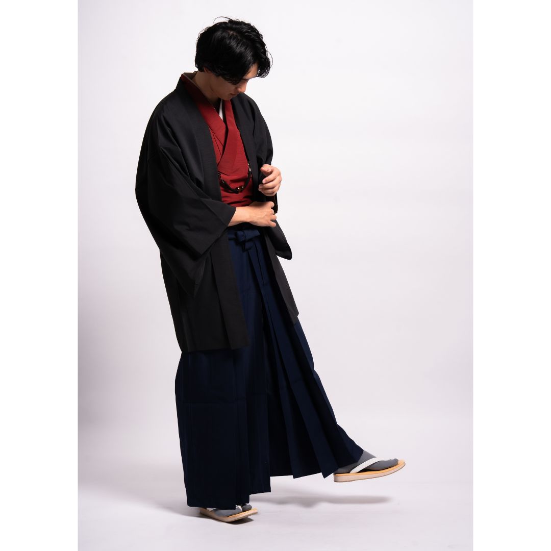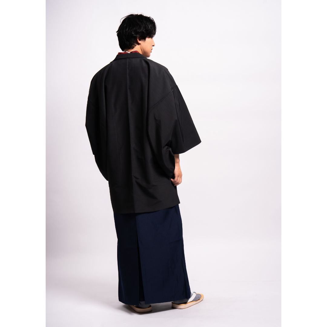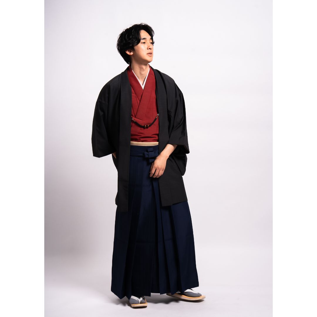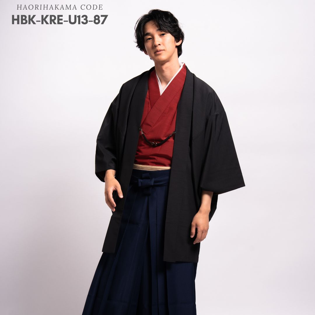【対応身長160cm-170cm】男性用レンタル紋付き袴フルセットremhs-hbk-kre-u13-87|レッド無地着物|ブラック無地羽織|ネイビー馬乗り袴|