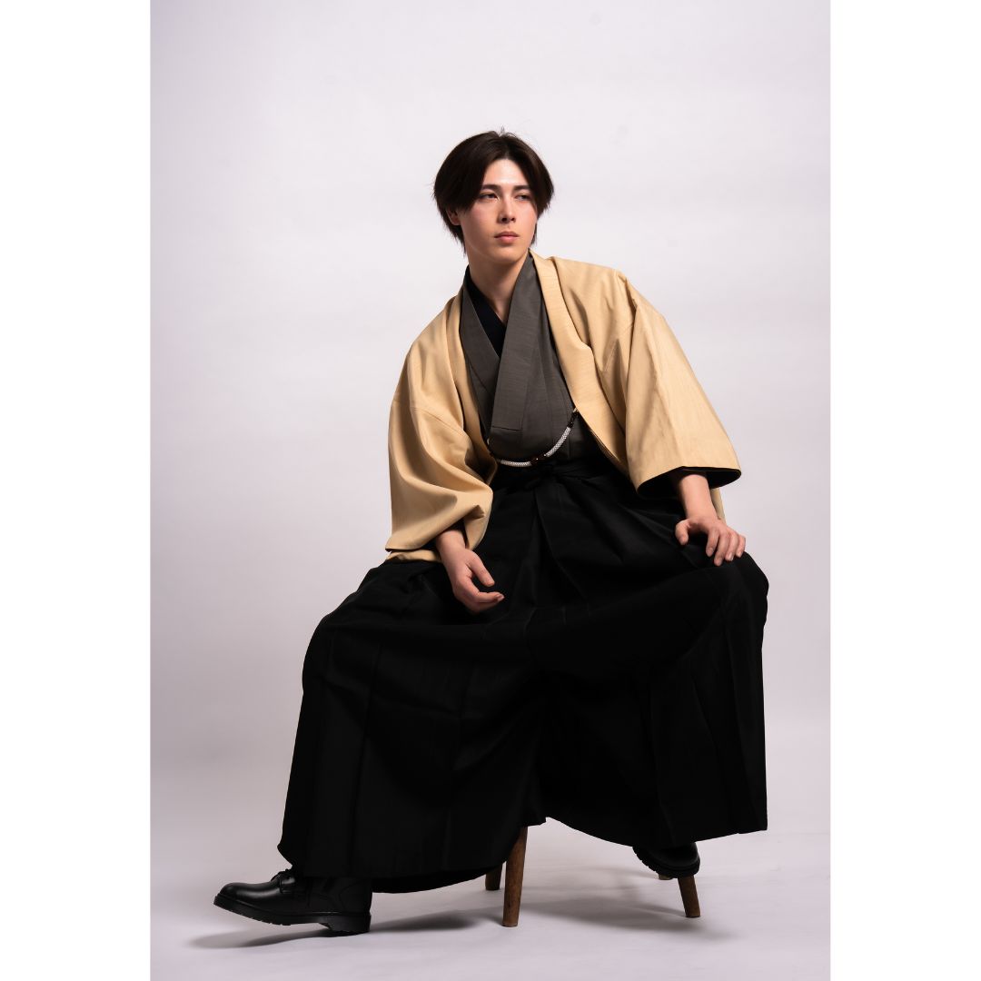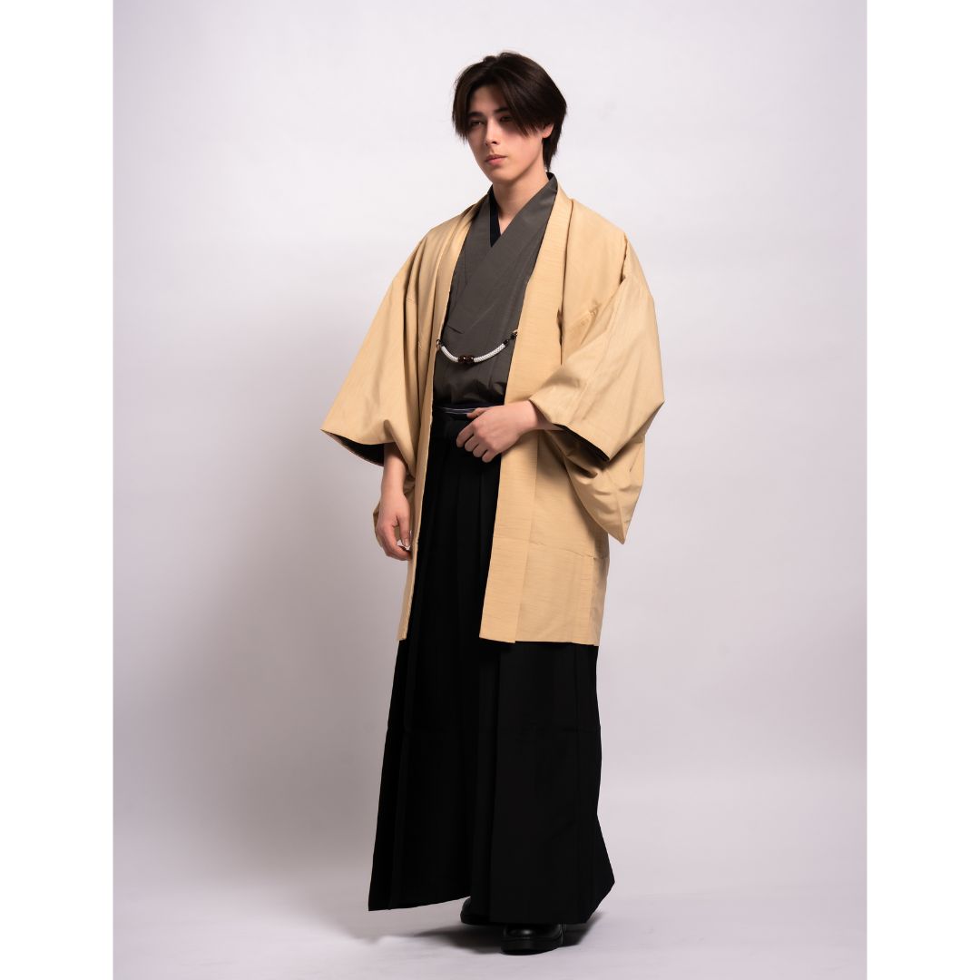 【対応身長160cm-170cm】男性用レンタル紋付き袴フルセットremhs-hiv-kgy-u11-87|グレー無地着物|アイボリー無地羽織|ブラック馬乗り袴|