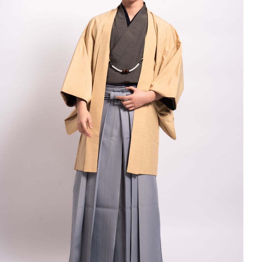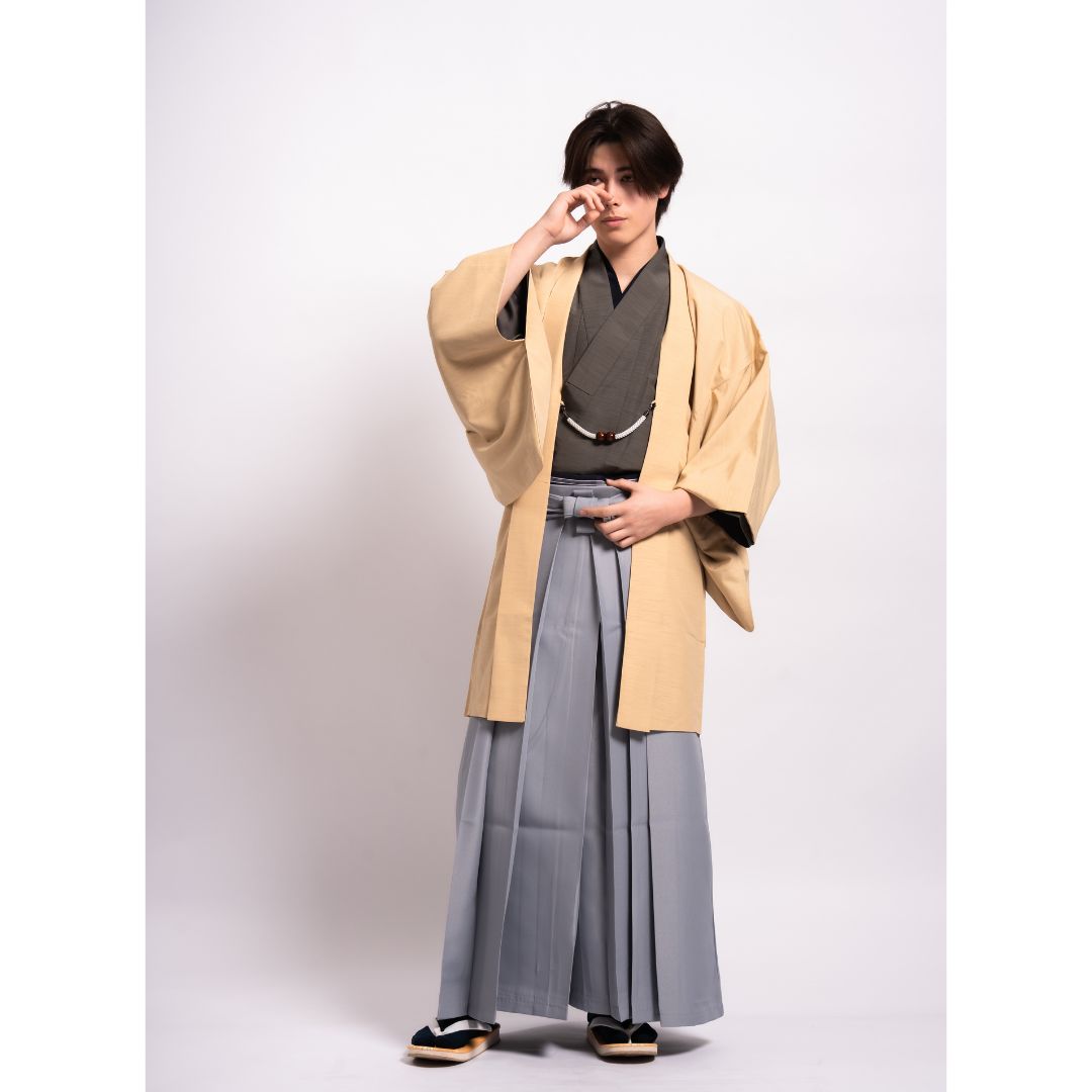【対応身長160cm-170cm】男性用レンタル紋付き袴フルセットremhs-hiv-kgy-u12-87|グレー無地着物|アイボリー無地羽織|グレー馬乗り袴|