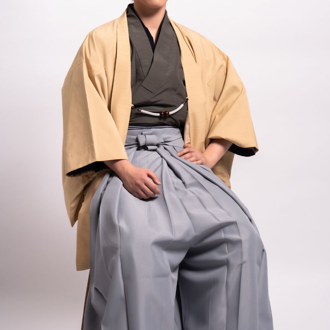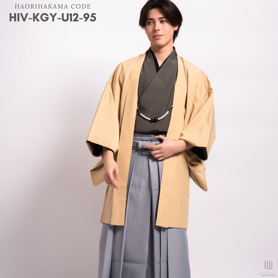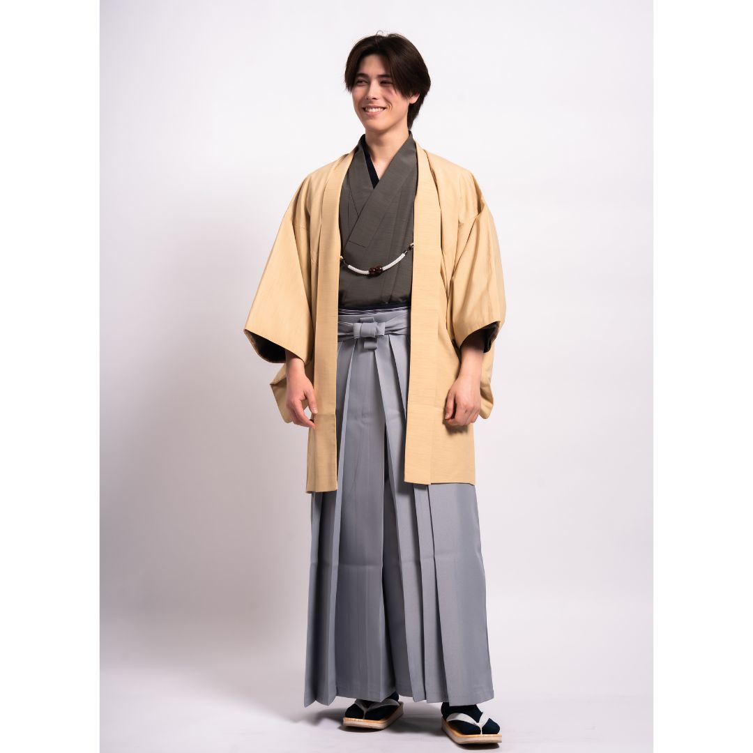 【対応身長170cm-180cm】男性用レンタル紋付き袴フルセットremhs-hiv-kgy-u12-95|グレー無地着物|アイボリー無地羽織|グレー馬乗り袴|