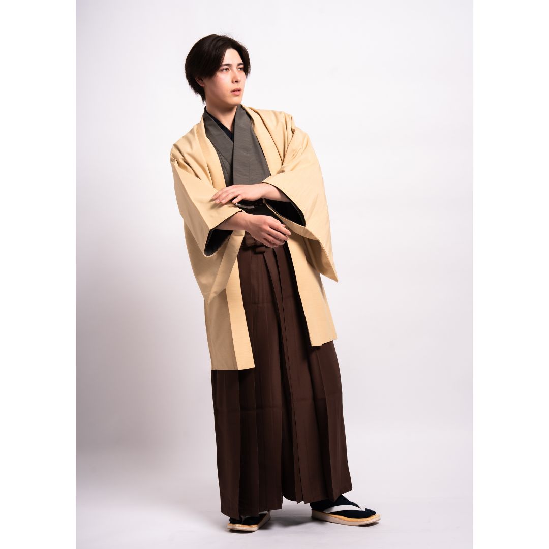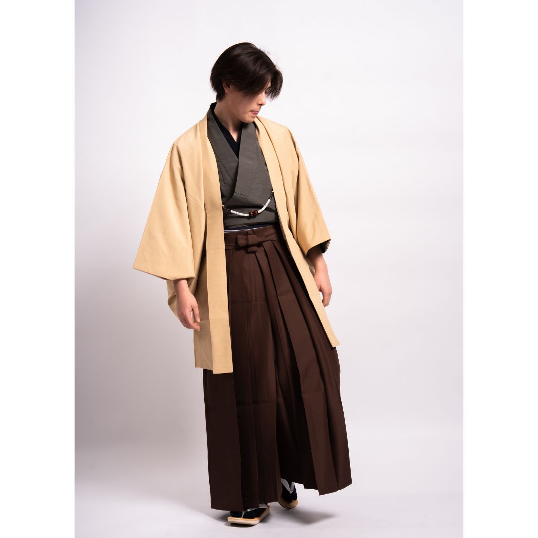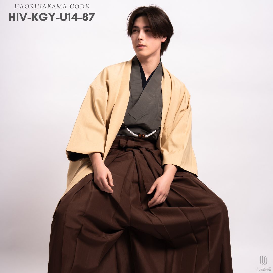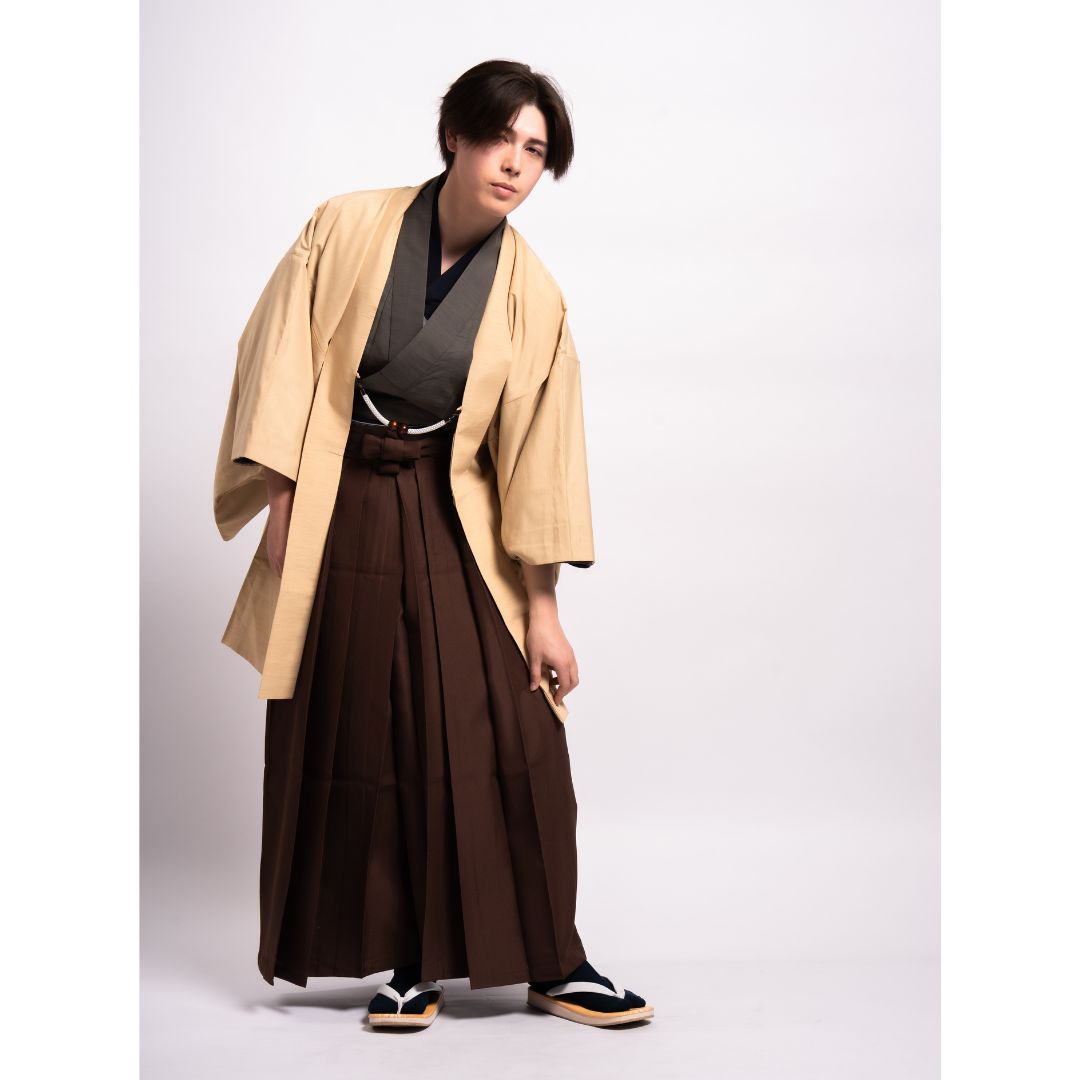【対応身長160cm-170cm】男性用レンタル紋付き袴フルセットremhs-hiv-kgy-u14-87|グレー無地着物|アイボリー無地羽織|ブラウン馬乗り袴|