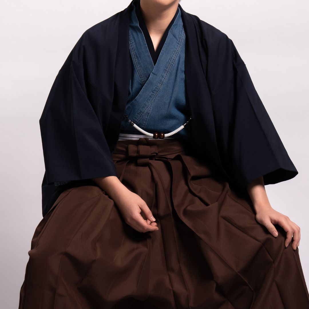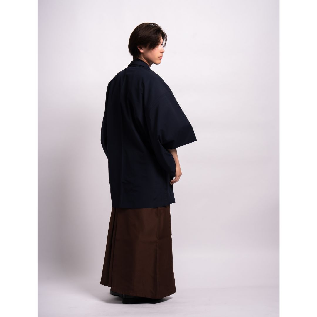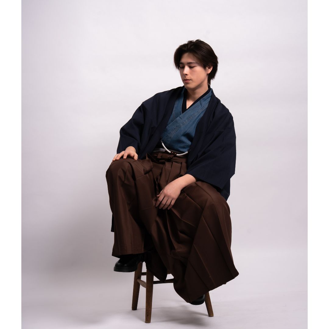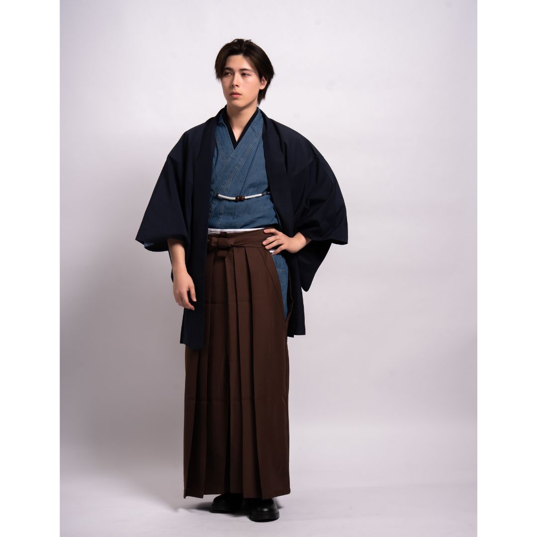 【対応身長170cm-180cm】男性用レンタル紋付き袴フルセットremhs-hnv-k78d-u14-95|インディゴダメージデニム着物|ネイビー無地羽織|ブラウン馬乗り袴|