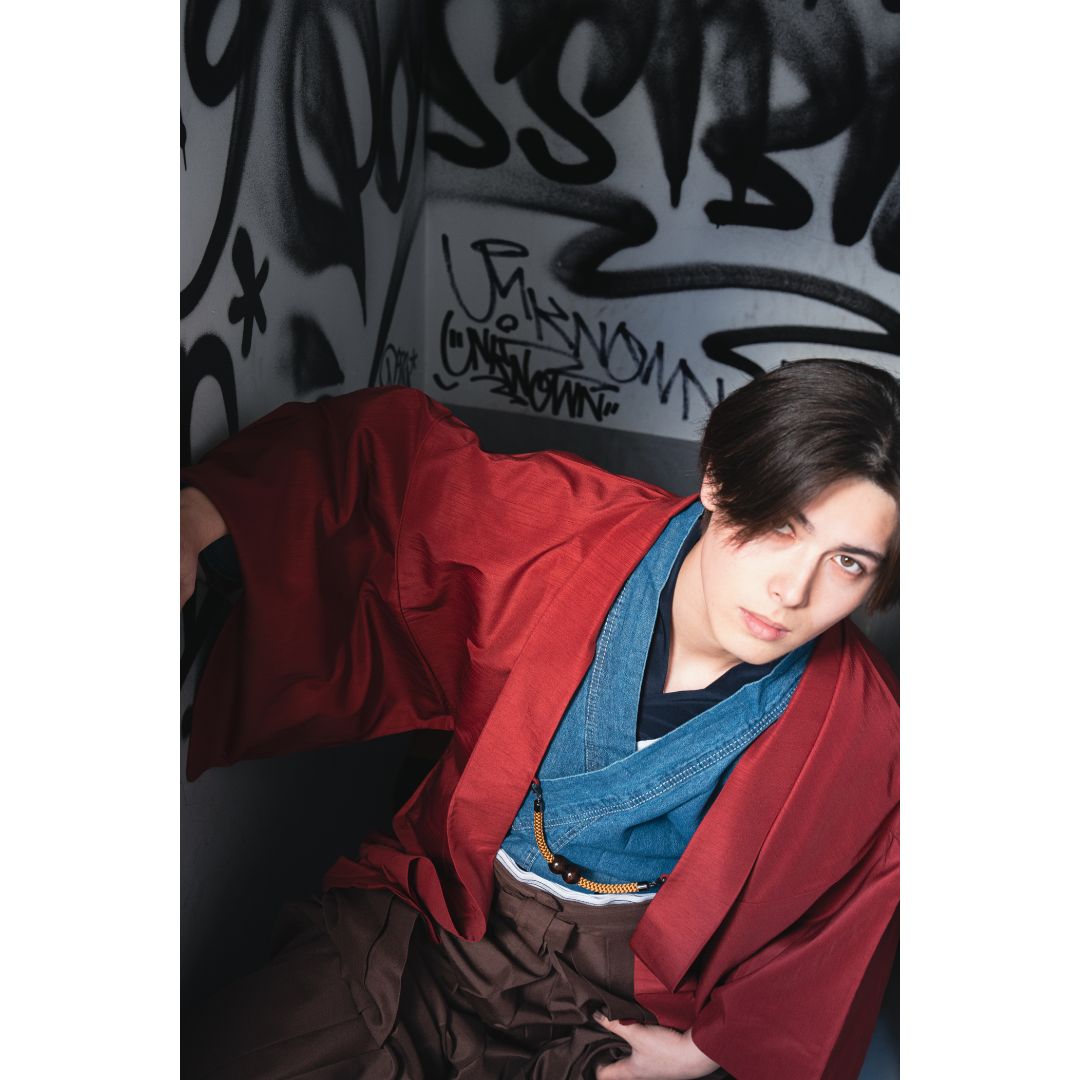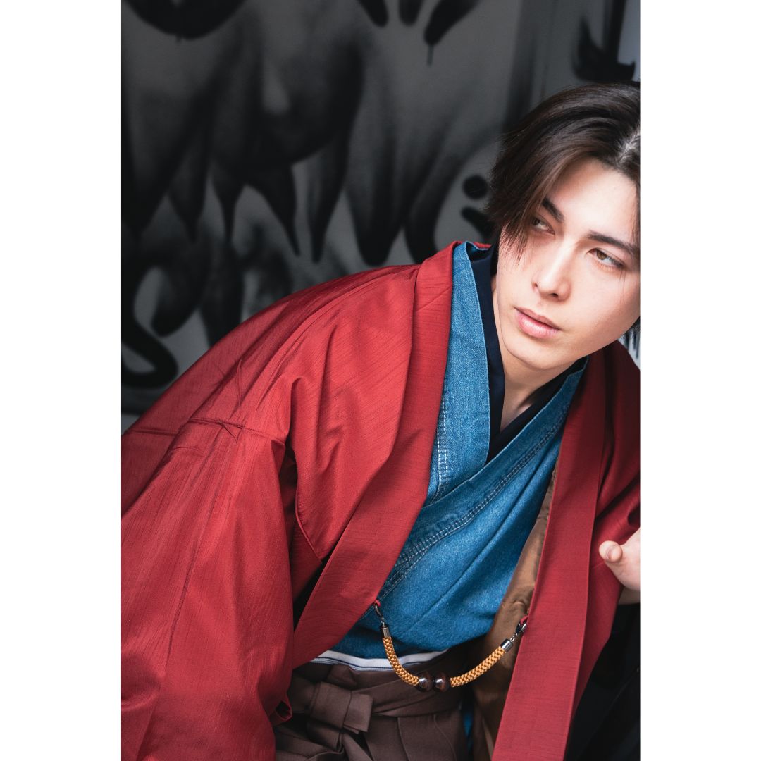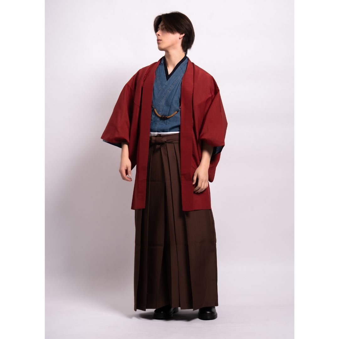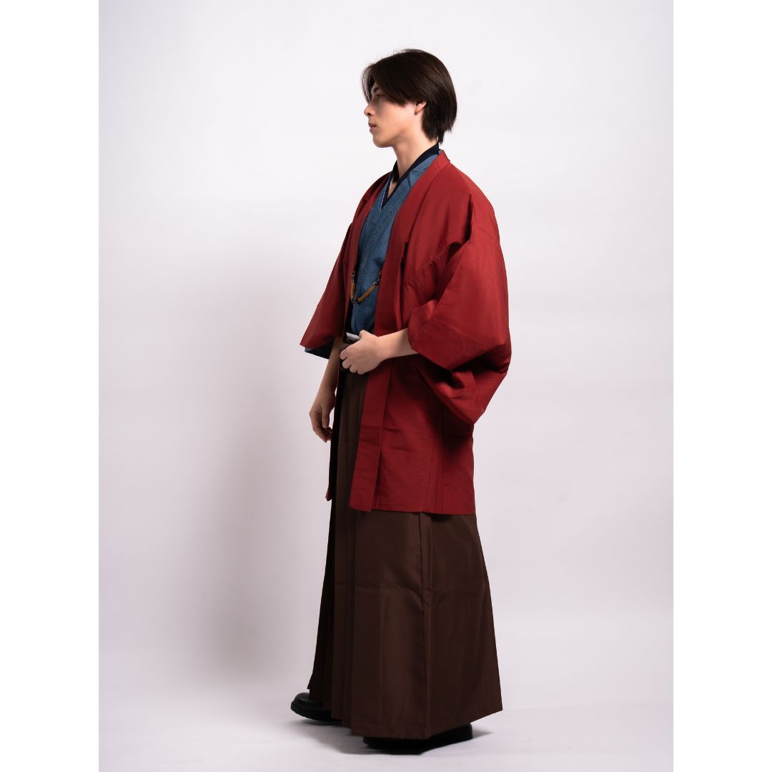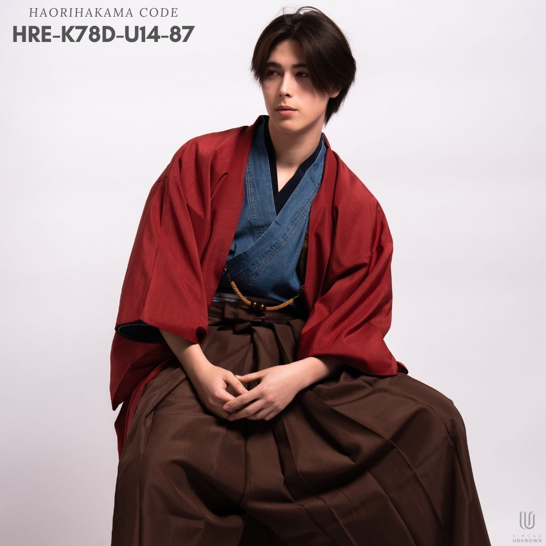 【対応身長160cm-170cm】男性用レンタル紋付き袴フルセットremhs-hre-k78d-u14-87|インディゴダメージデニム着物|レッド無地羽織|ブラウン馬乗り袴|