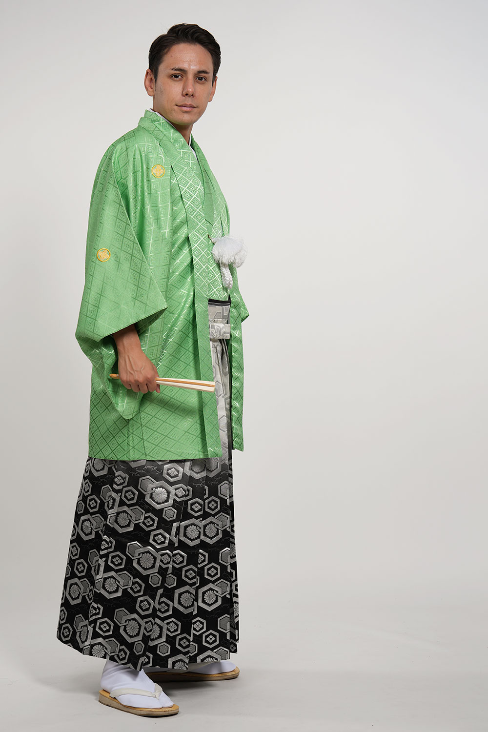 - 着物・羽織・袴・羽織紐・長襦袢・角帯・伊達締め・腰紐4本・衿芯・白扇・足袋・雪駄