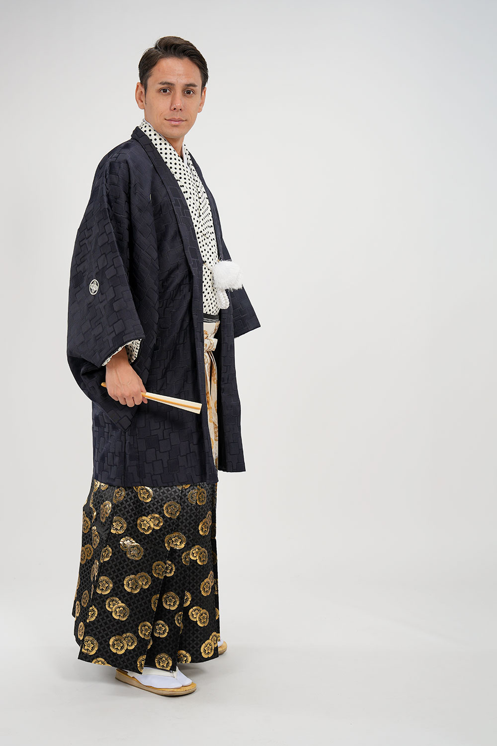 - 着物・羽織・袴・羽織紐・長襦袢・角帯・伊達締め・腰紐4本・衿芯・白扇・足袋・雪駄