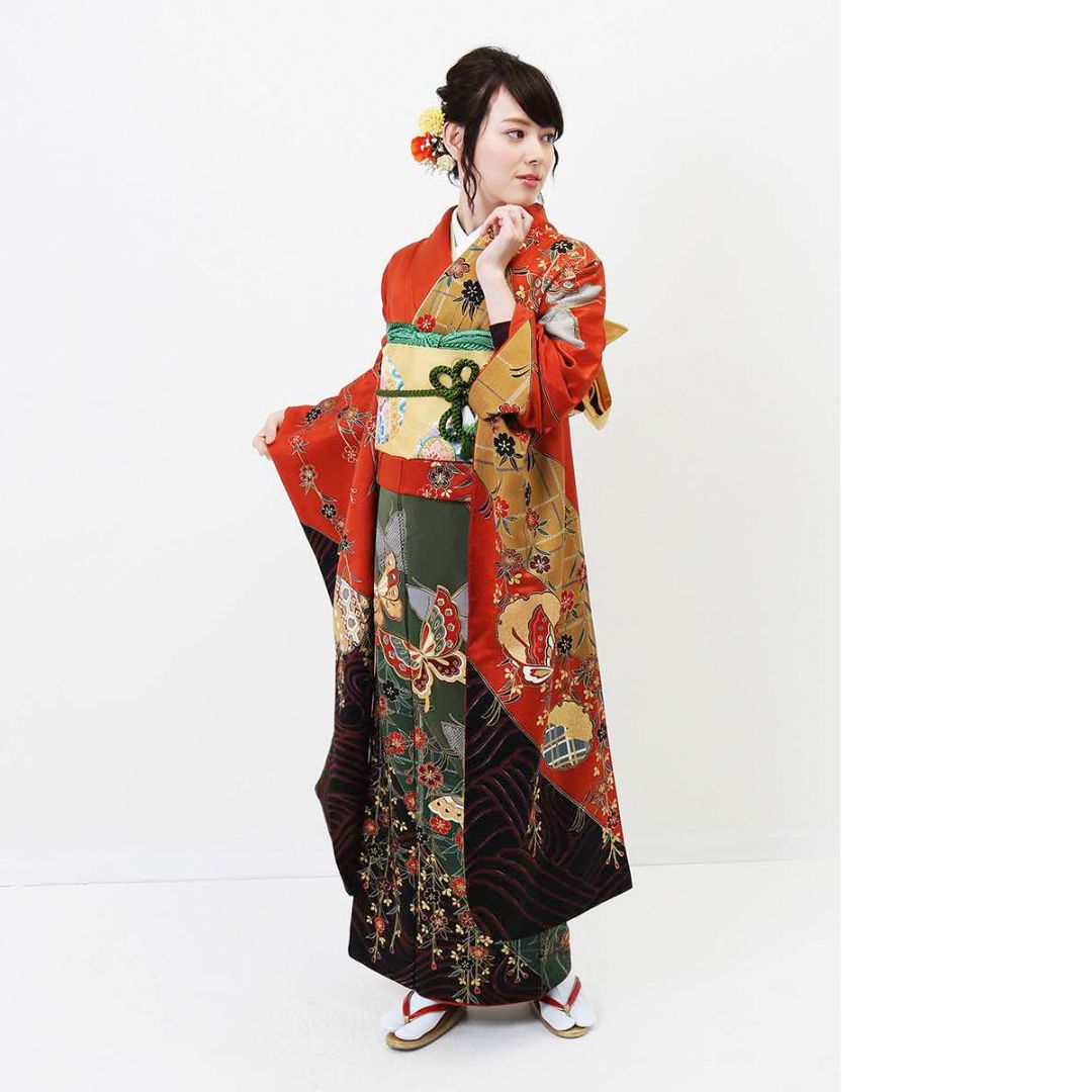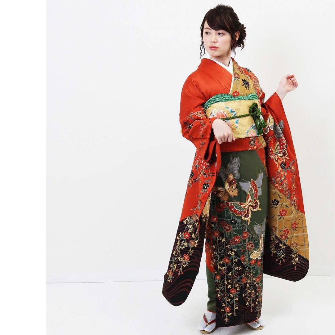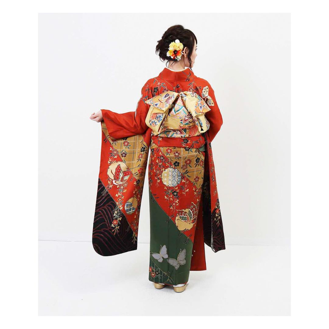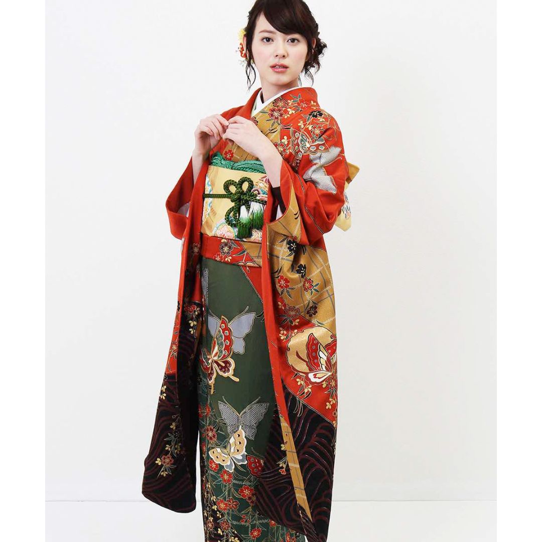 【対応身長155cm~170cm】【古典・正統派】【正絹】成人式レンタル振袖フルセット-004 花柄 レトロ クール系 古典 緑系 オレンジ系 黄色系 蝶 桜 豪華 可憐