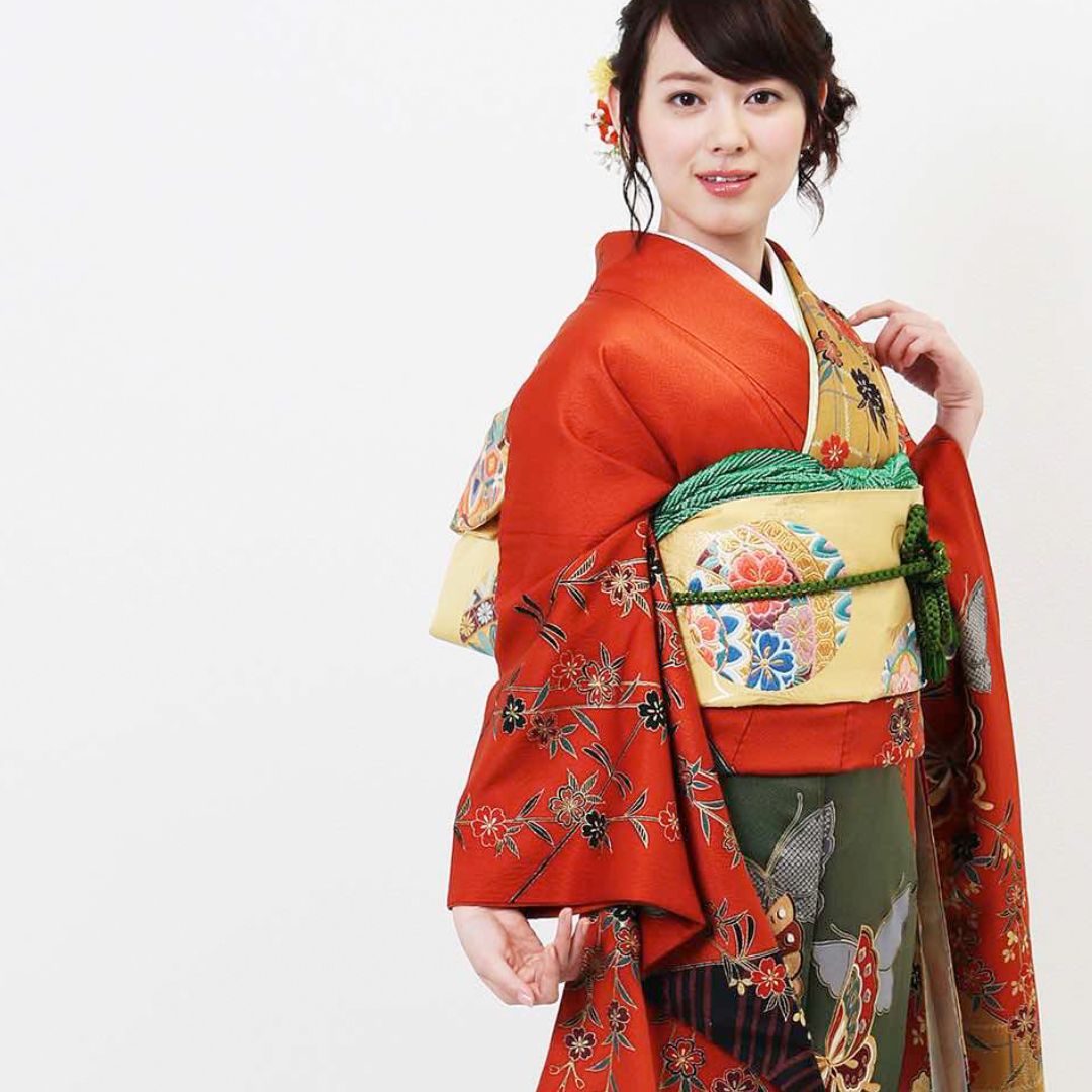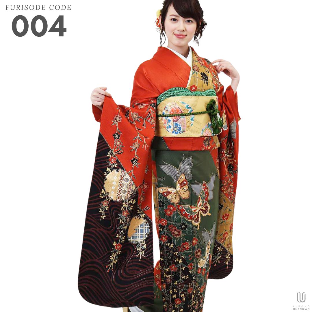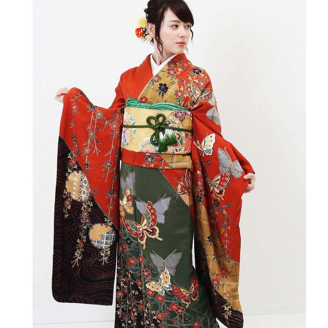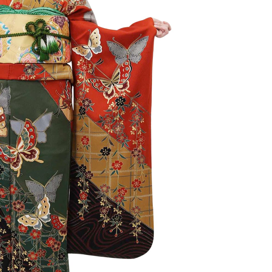 【対応身長155cm~170cm】【古典・正統派】【正絹】成人式レンタル振袖フルセット-004 花柄 レトロ クール系 古典 緑系 オレンジ系 黄色系 蝶 桜 豪華 可憐