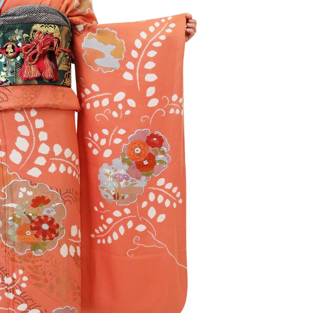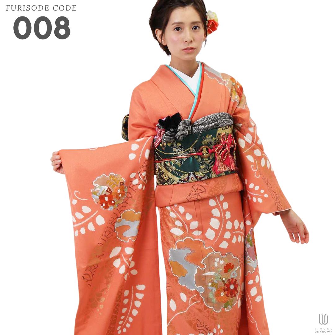 【対応身長160cm~175cm】【レトロ・アンティーク風】【正絹】成人式レンタル振袖フルセット-008 花柄 レトロ ポップキュート 古典 オレンジ系 雪輪 青海波