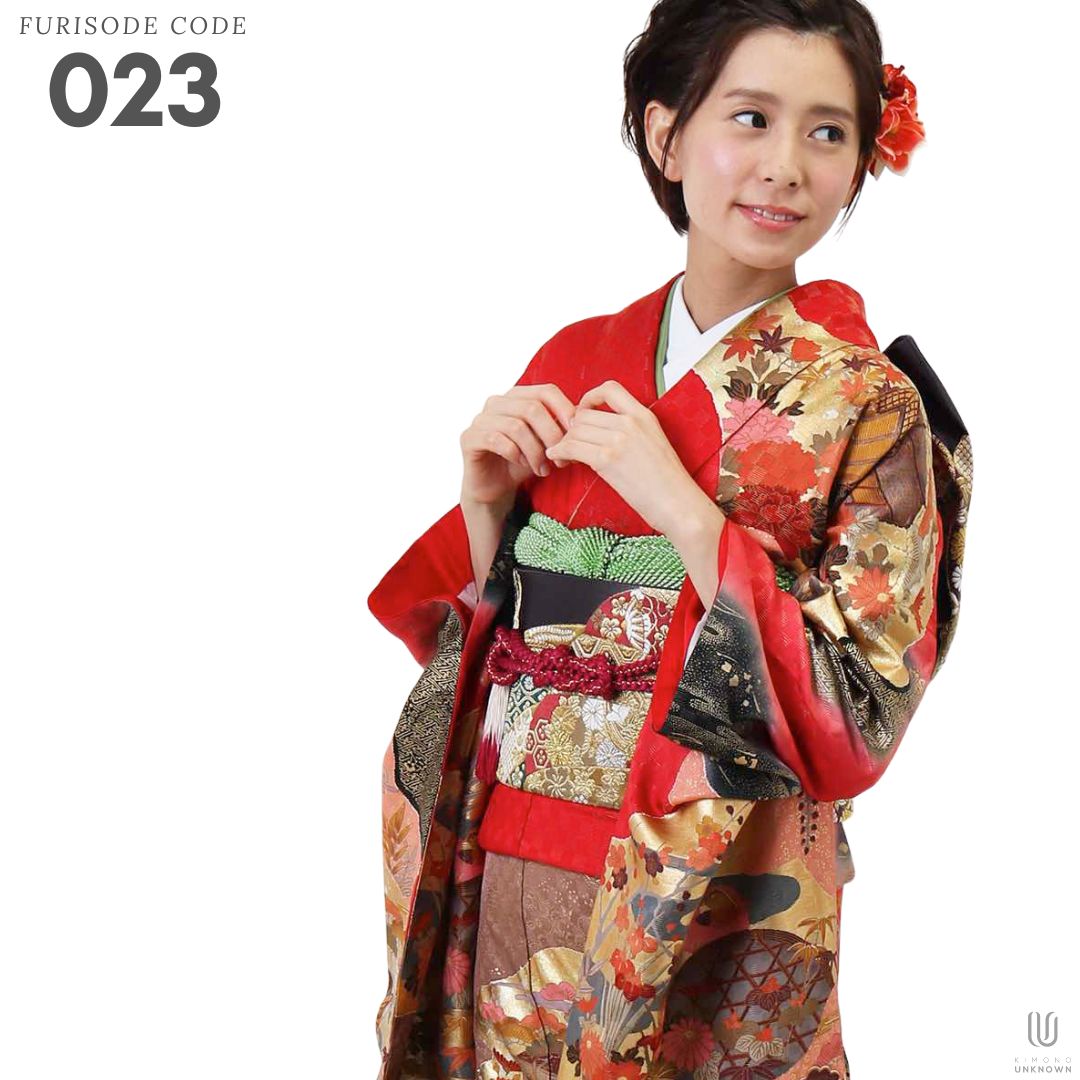 【対応身長155cm~170cm】【古典・正統派】【正絹】成人式レンタル振袖フルセット-023 花柄 レトロ 定番 古典 赤系 花車 牡丹 金彩 雲取
