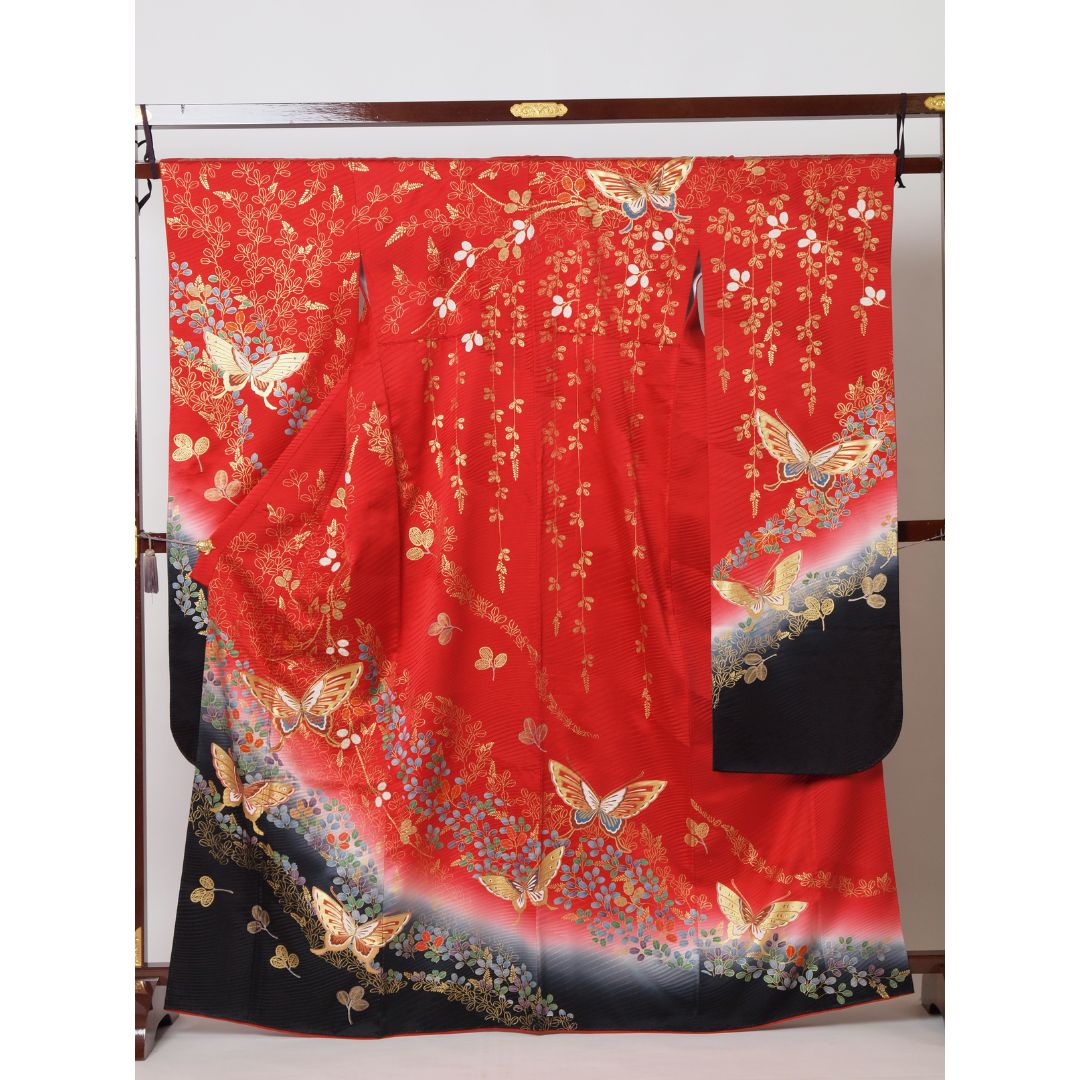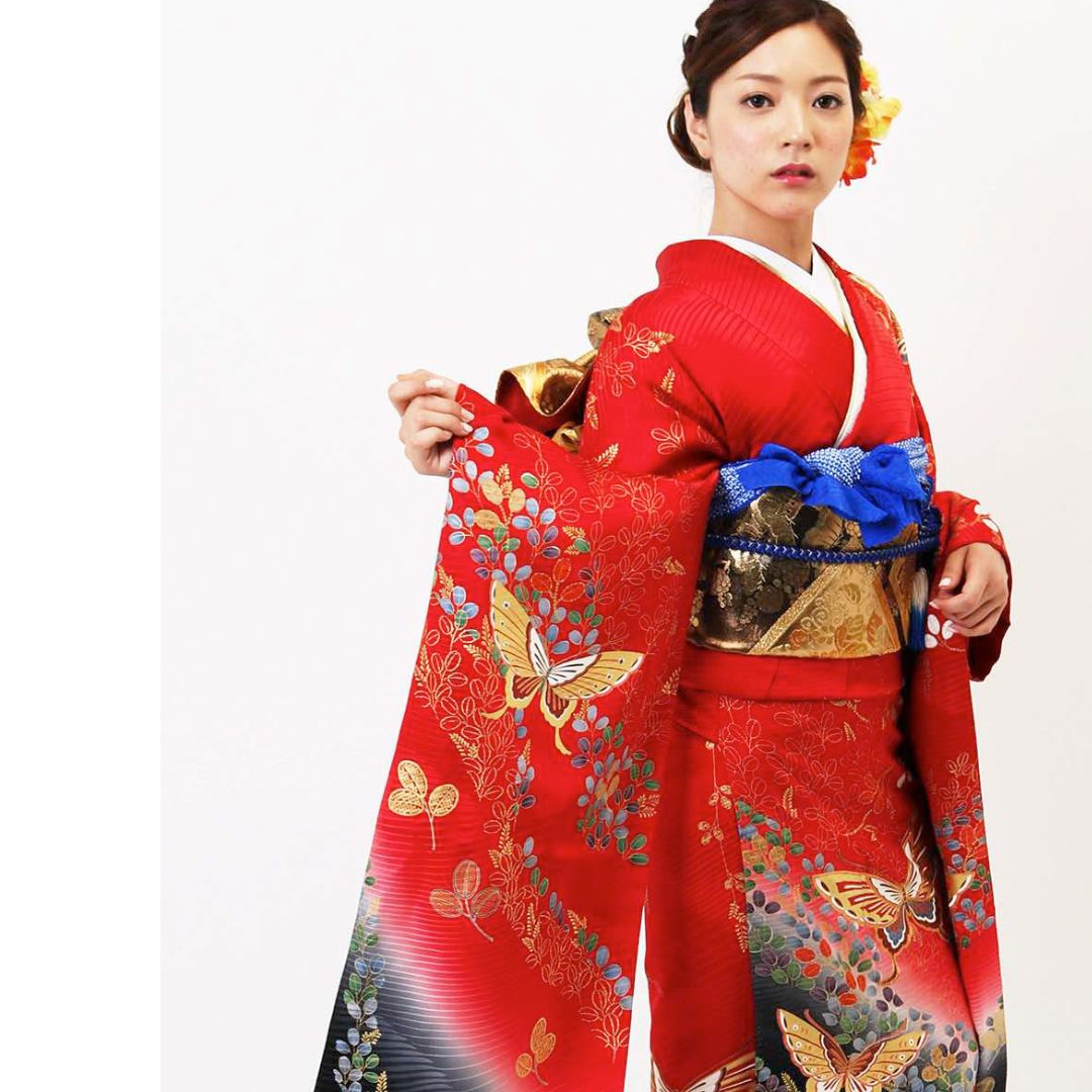 【対応身長145cm~160cm】【古典・正統派】【正絹】成人式レンタル振袖フルセット-041 花柄 レトロ 定番 古典 ポップキュート 赤系 金彩 蝶 柳