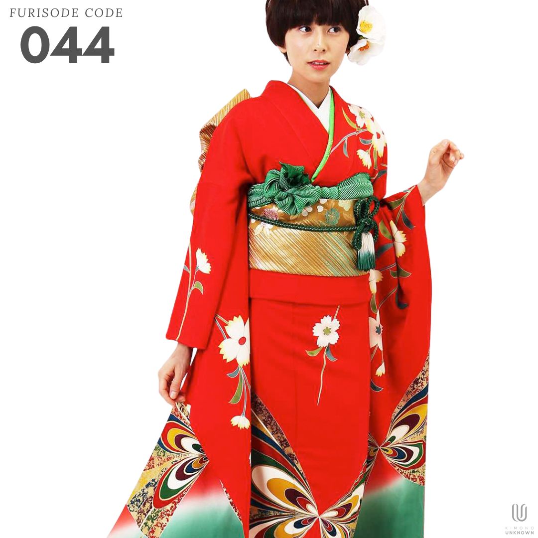 【対応身長155cm~170cm】【ポップ・キュート】【正絹】成人式レンタル振袖フルセット-044 花柄 レトロ 定番 古典 ポップキュート 赤系 蝶 桜 金彩 可憐