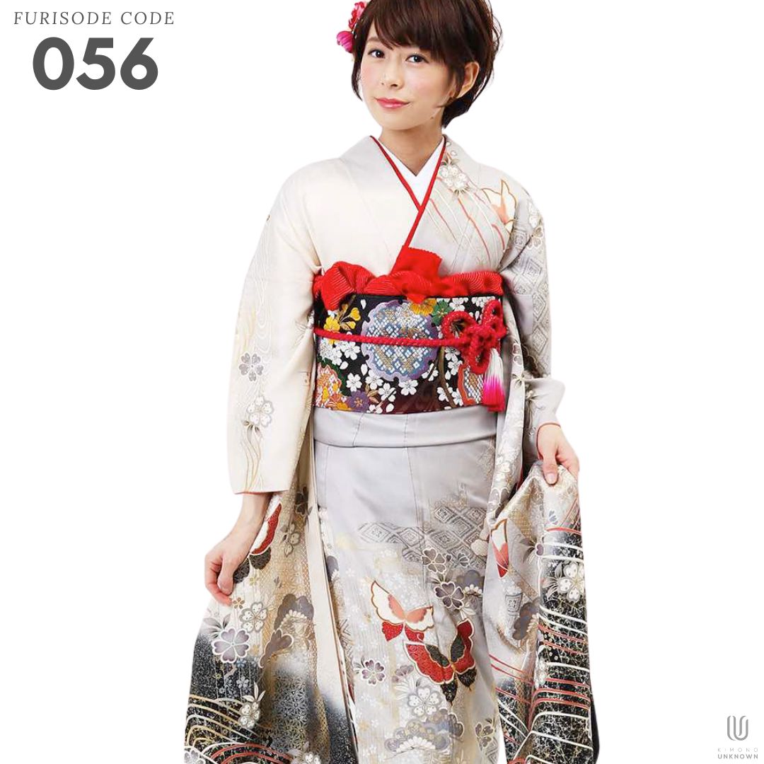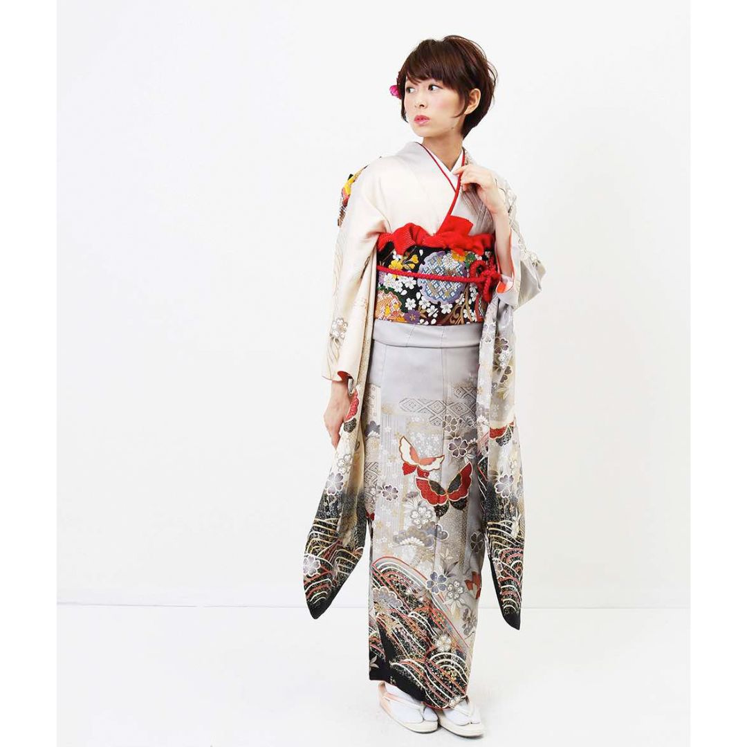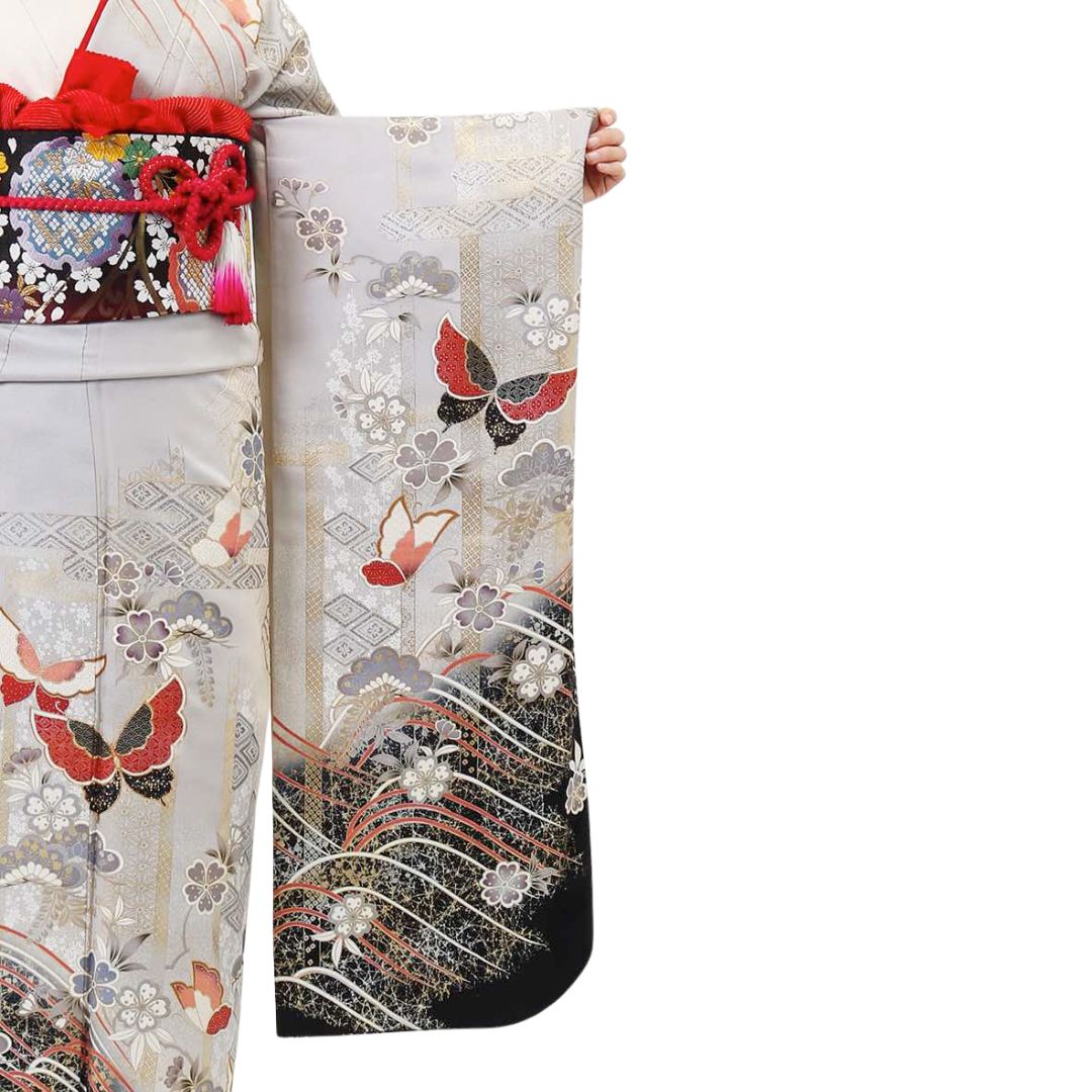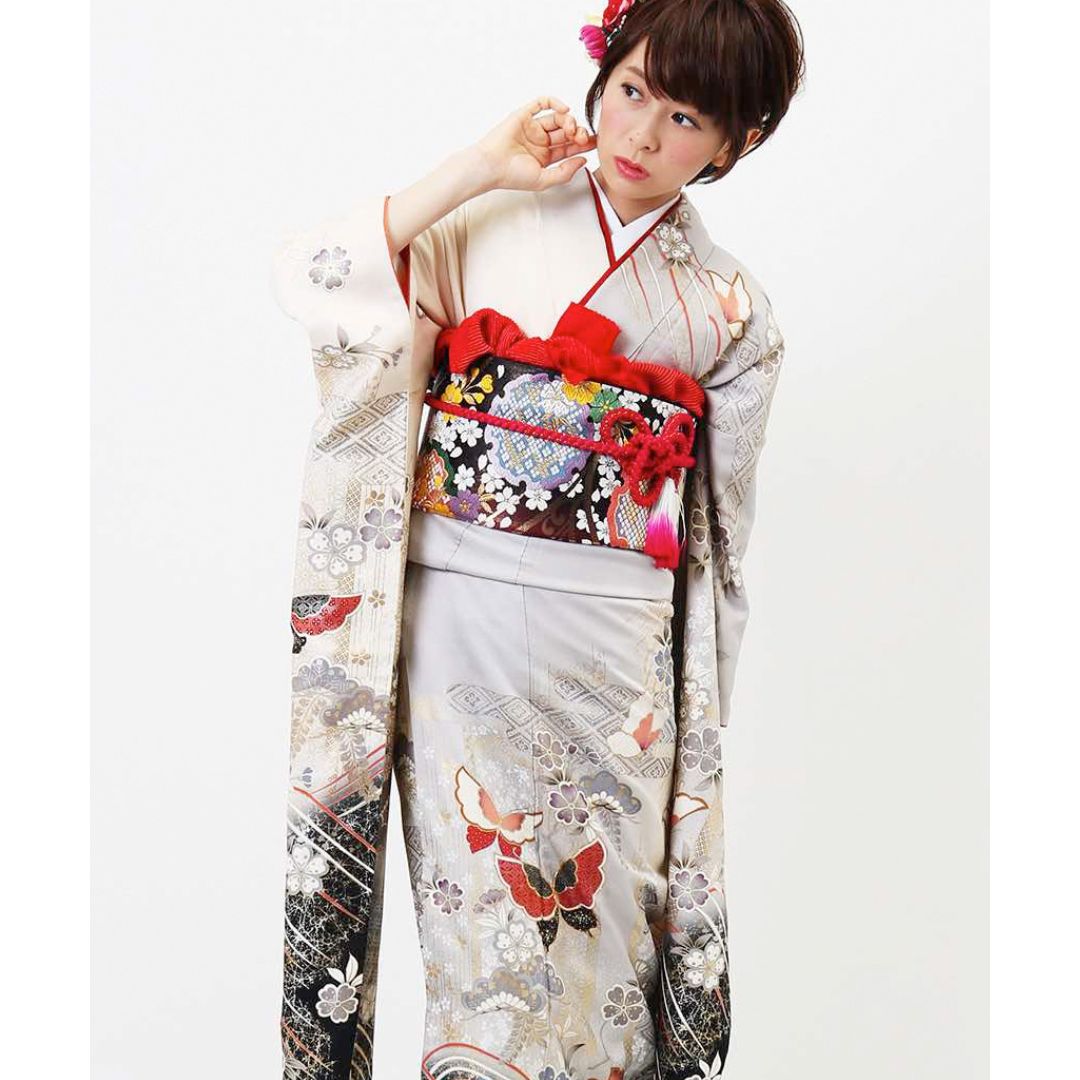 【対応身長150cm~165cm】【レトロ・アンティーク風】【正絹】成人式レンタル振袖フルセット-056 花柄 レトロ クール系 古典 白系 グレー系 蝶 松 桜 流水 清楚