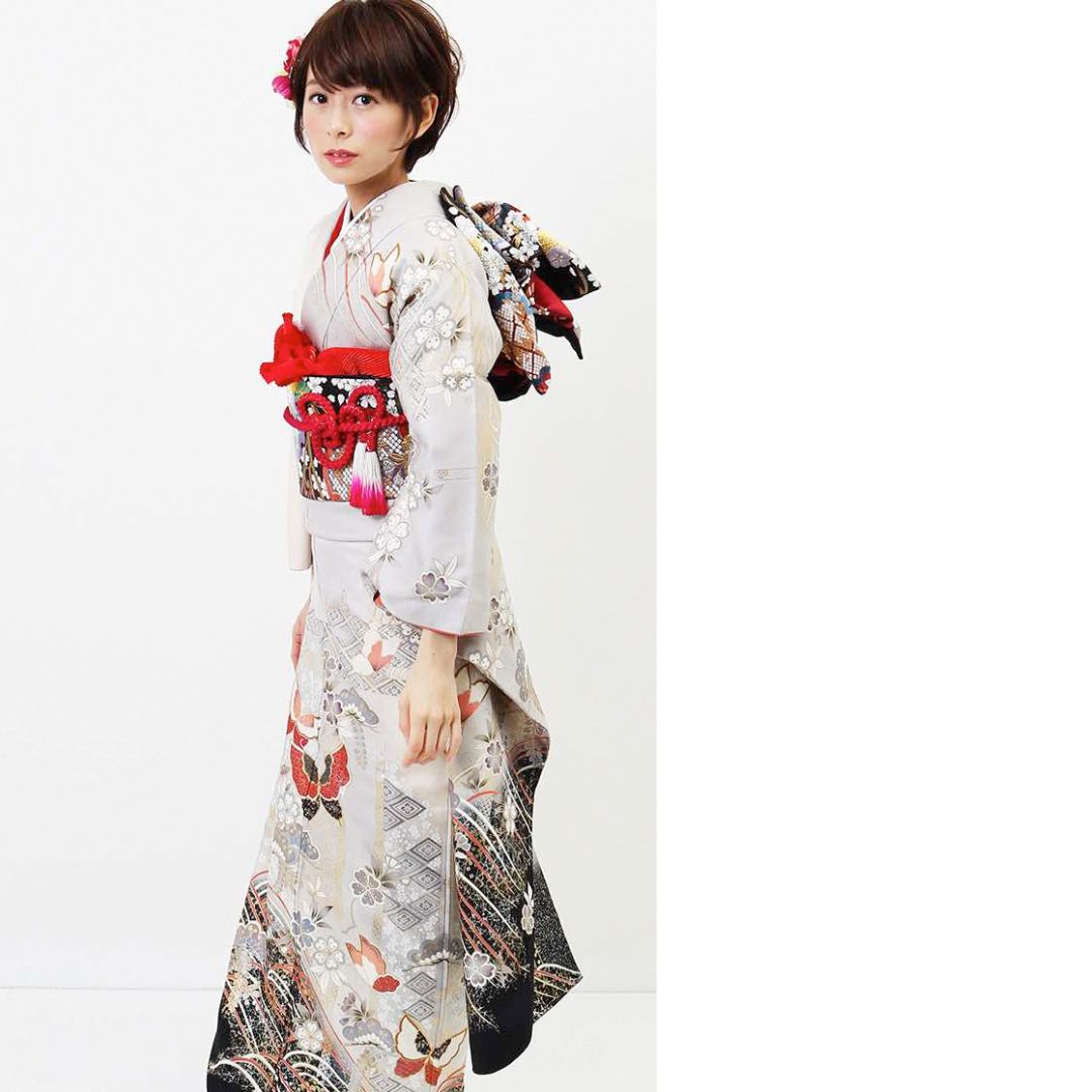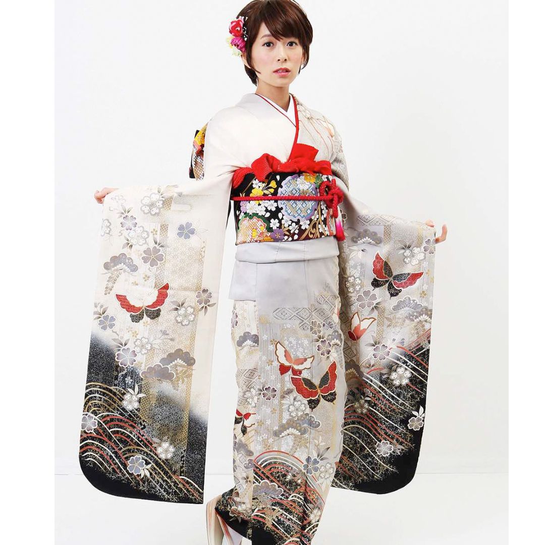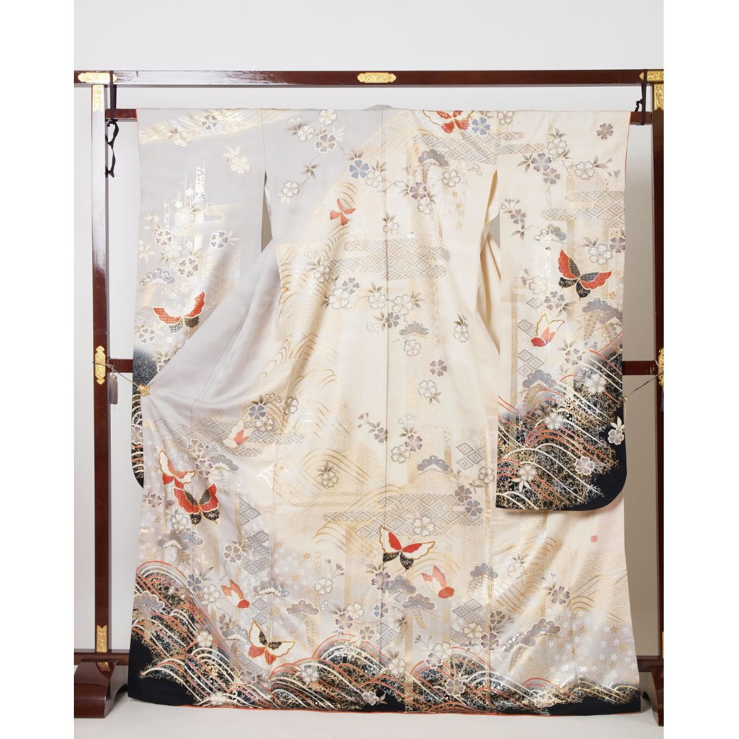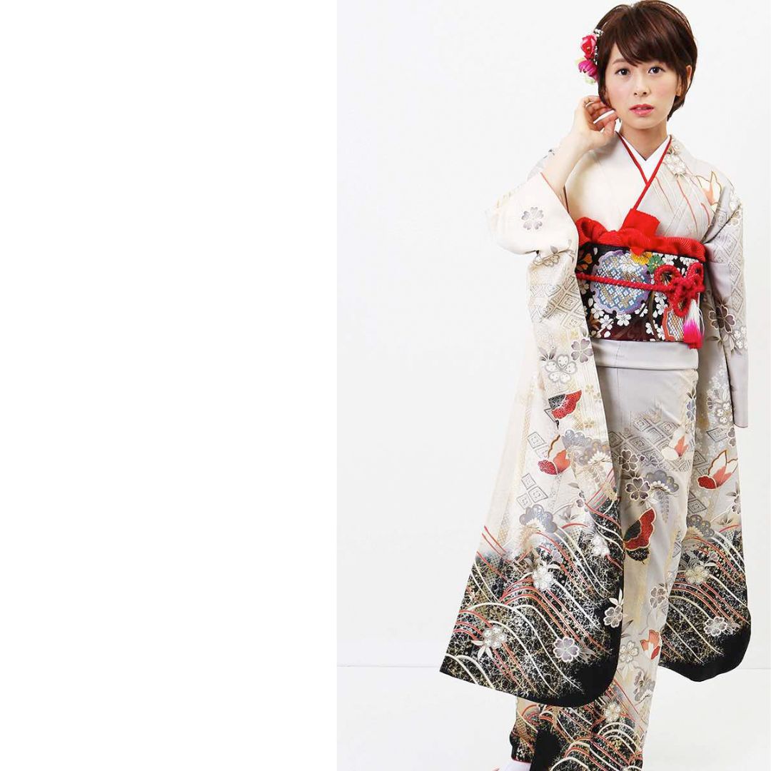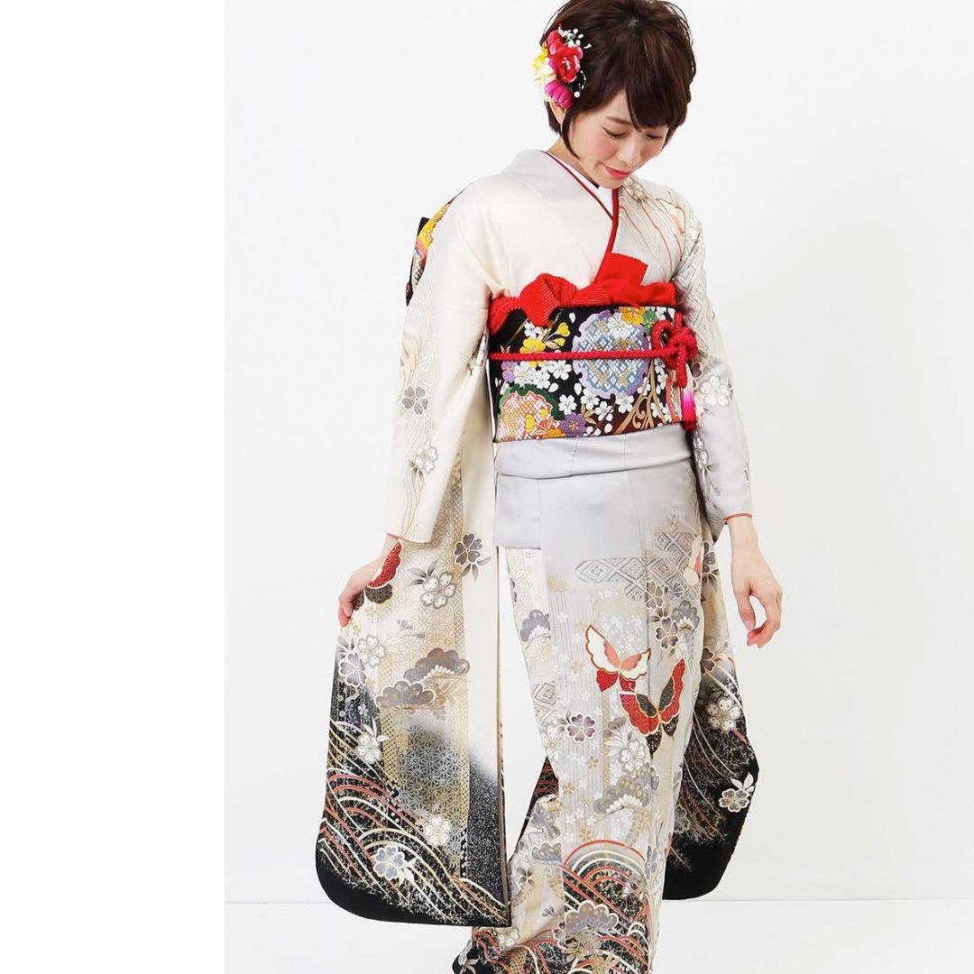 【対応身長150cm~165cm】【レトロ・アンティーク風】【正絹】成人式レンタル振袖フルセット-056 花柄 レトロ クール系 古典 白系 グレー系 蝶 松 桜 流水 清楚