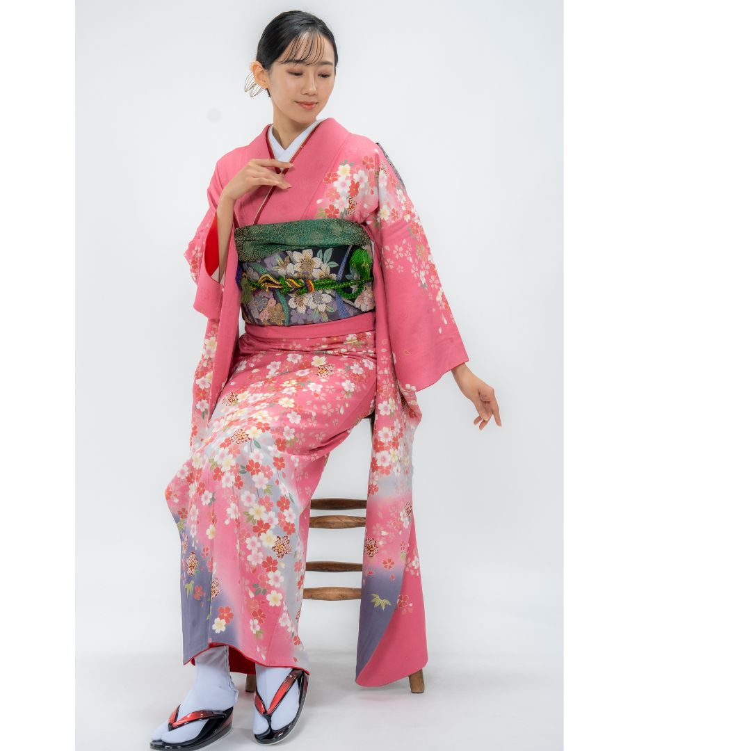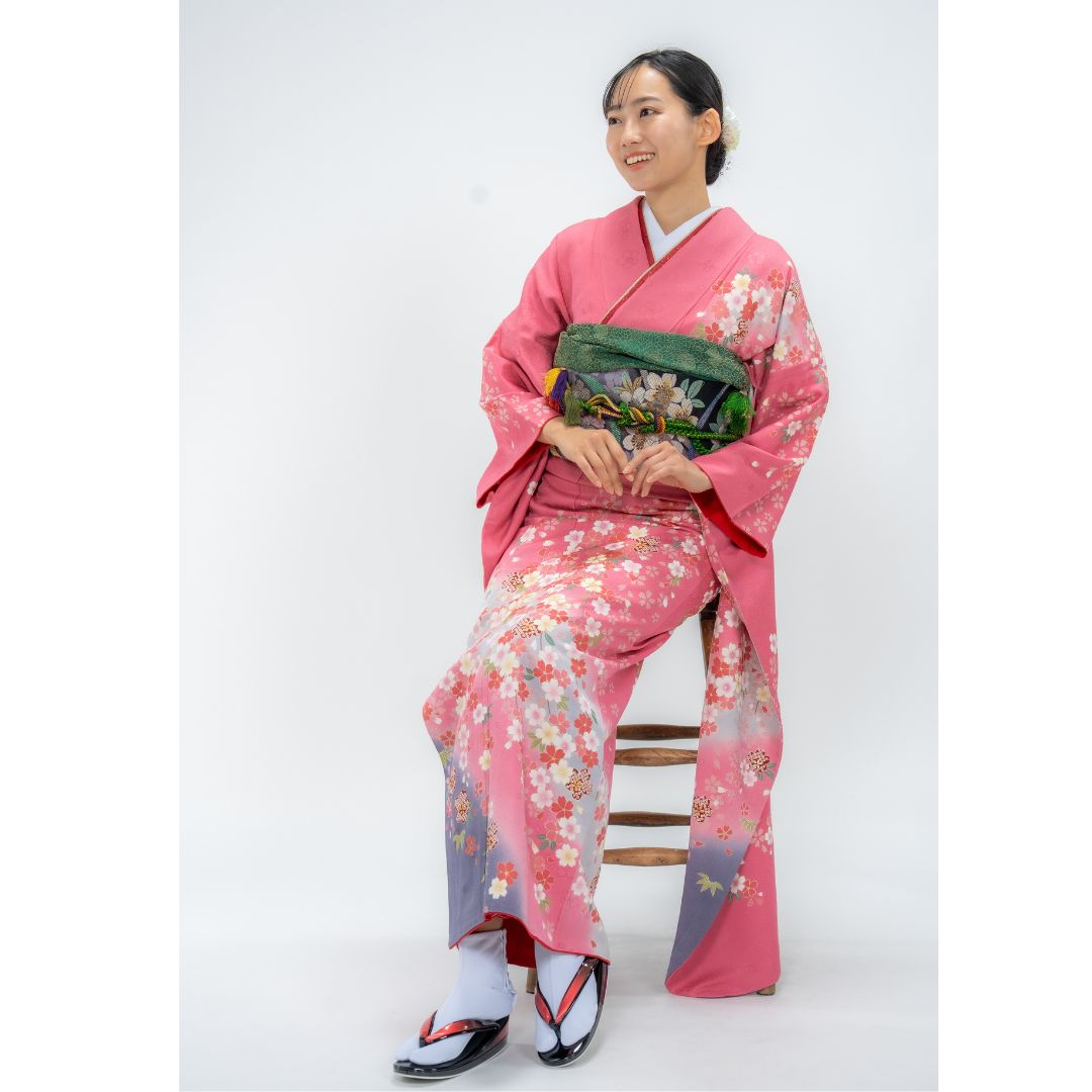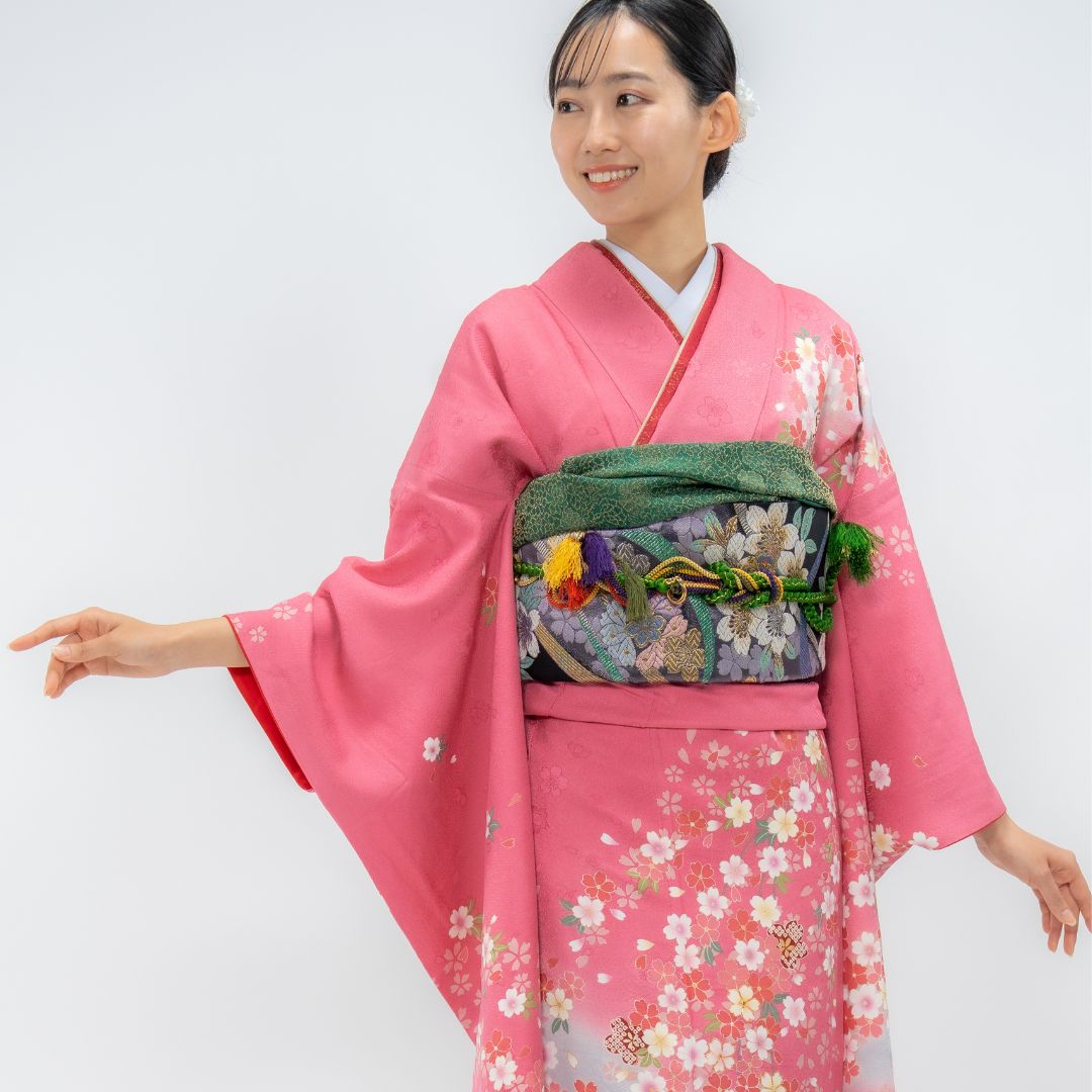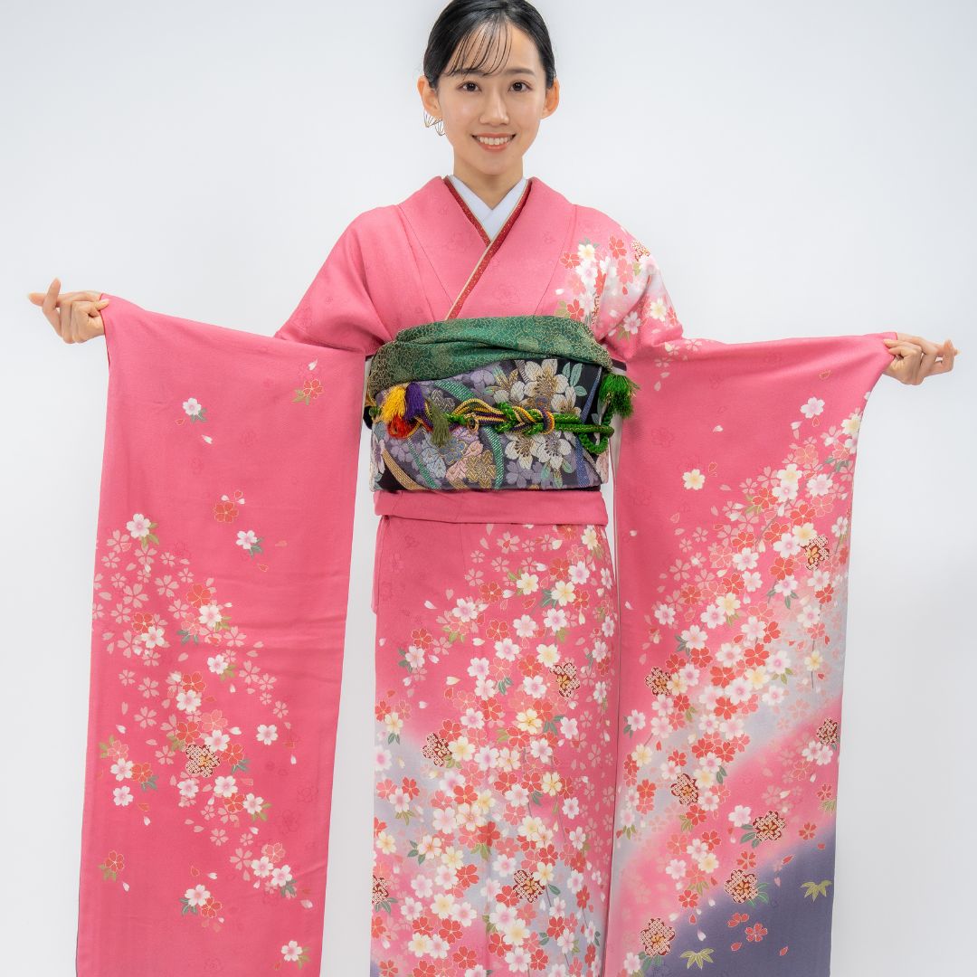 【対応身長150cm~165cm】【ポップ・キュート】【正絹】成人式レンタル振袖フルセット-082 花柄 定番 ポップキュート ピンク系 グレー系 桜 松 鹿の子