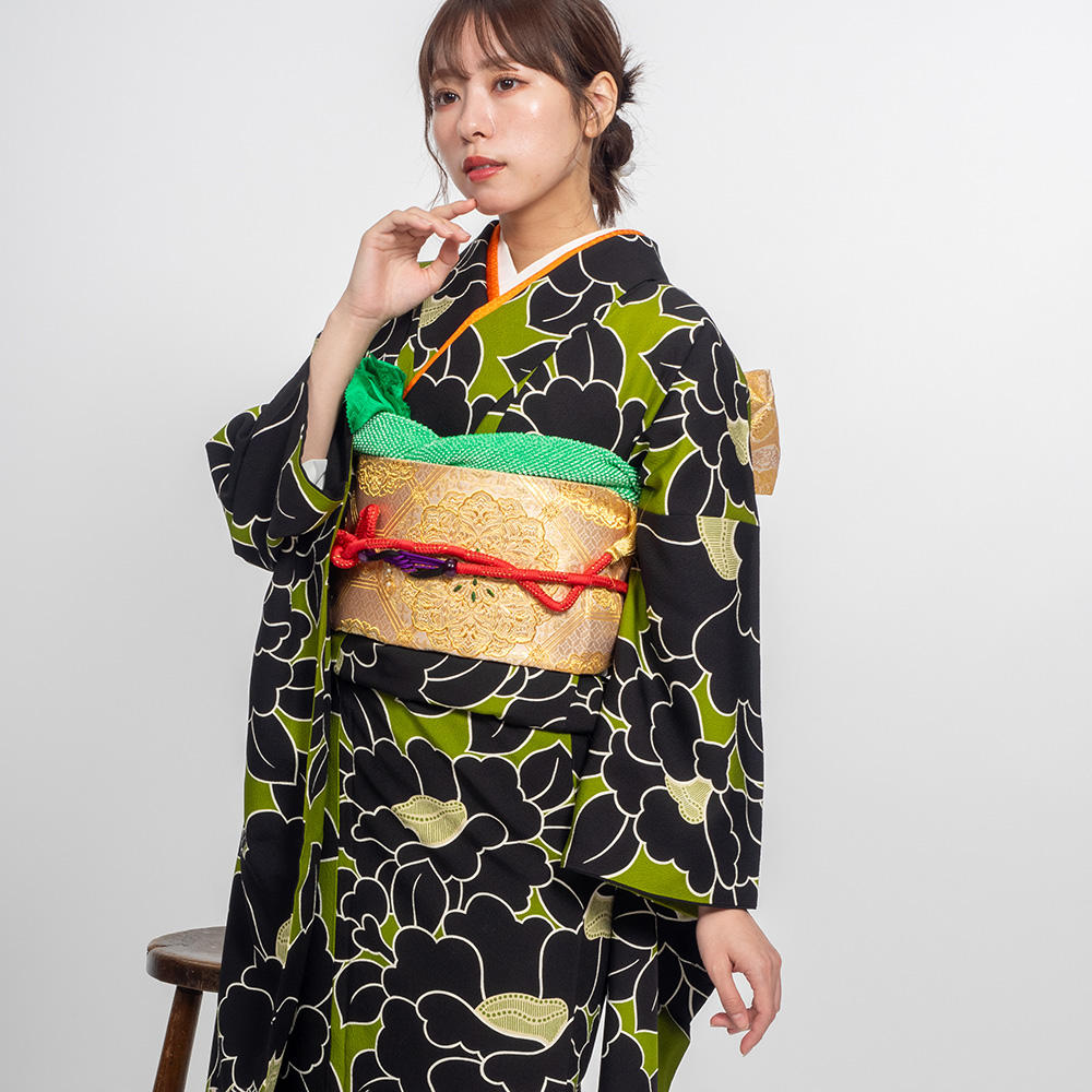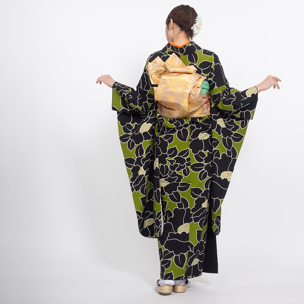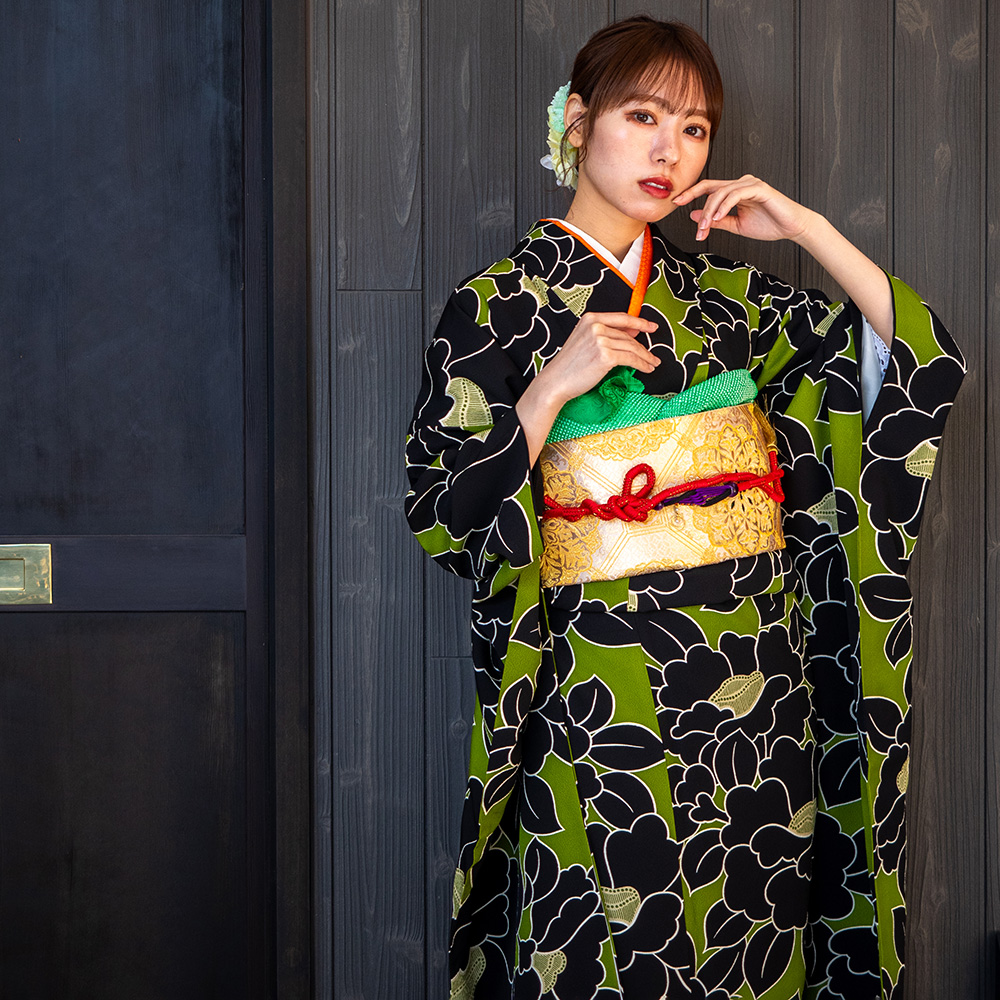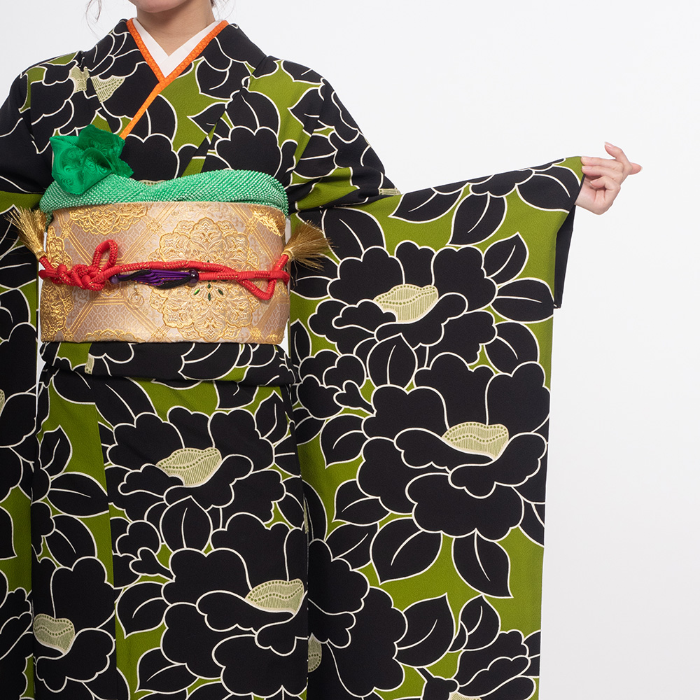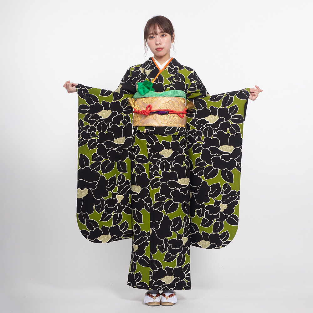 【対応身長160cm~175cm】【レトロ・アンティーク風】【正絹】成人式レンタル振袖フルセット-1000 花柄 椿 キミドリ 緑 黒