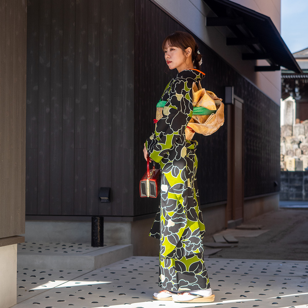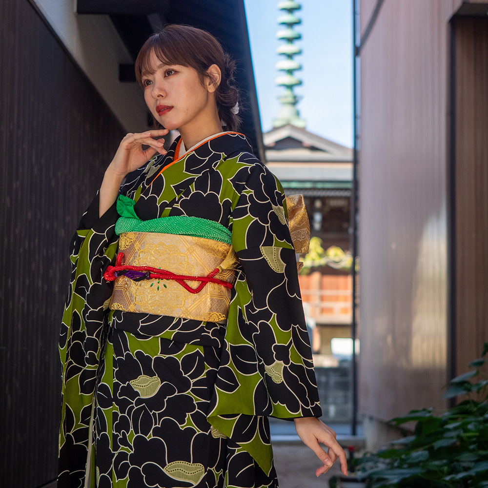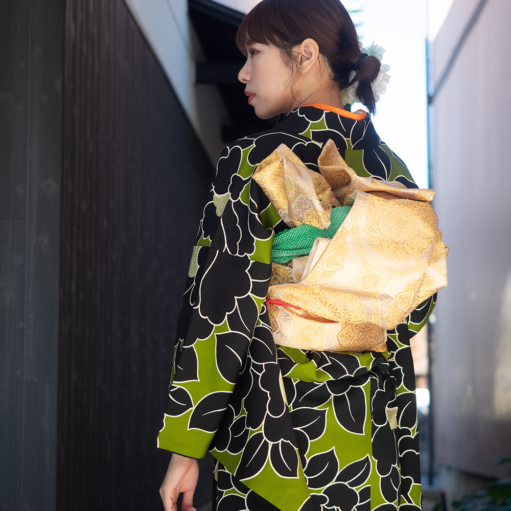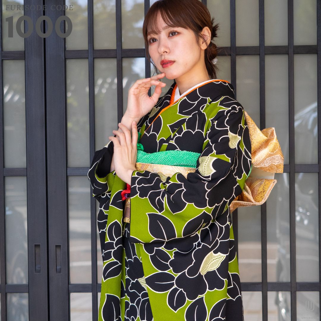 【対応身長160cm~175cm】【レトロ・アンティーク風】【正絹】成人式レンタル振袖フルセット-1000 花柄 椿 キミドリ 緑 黒