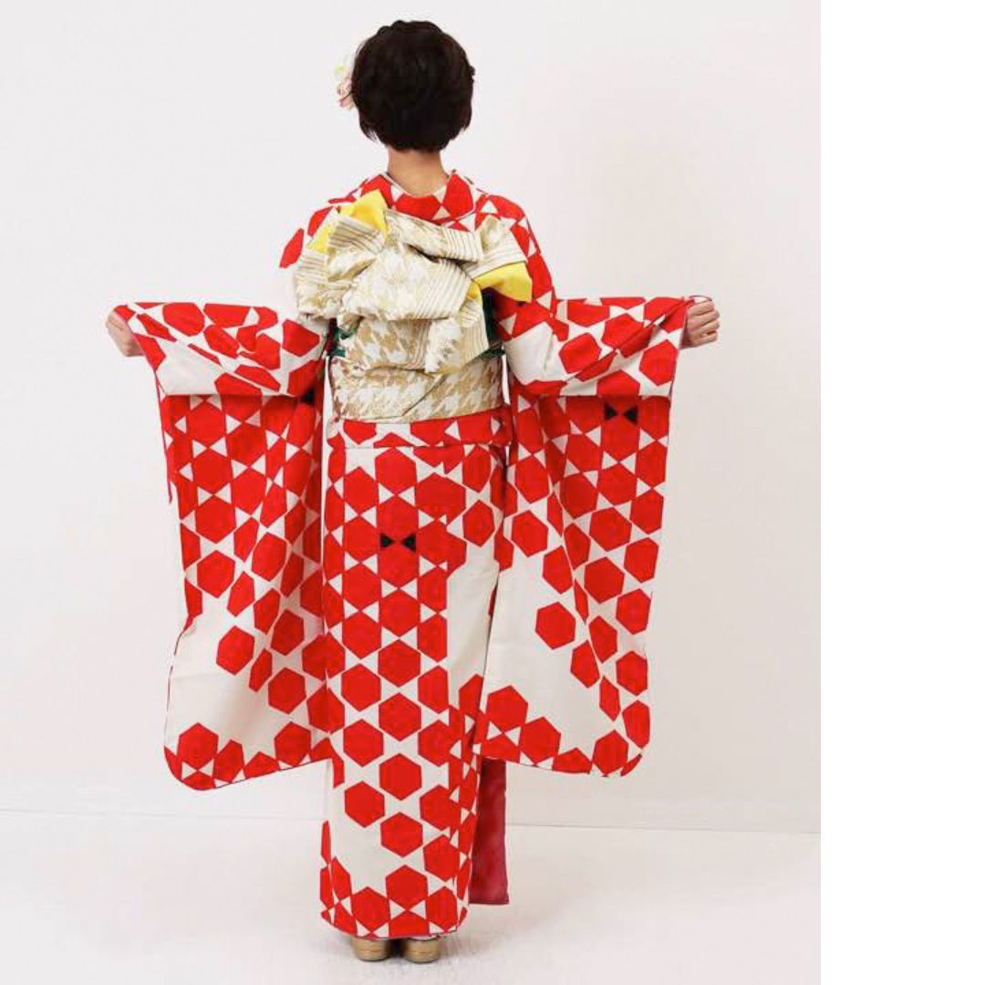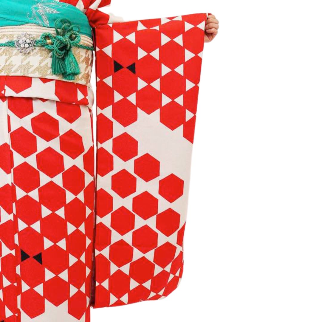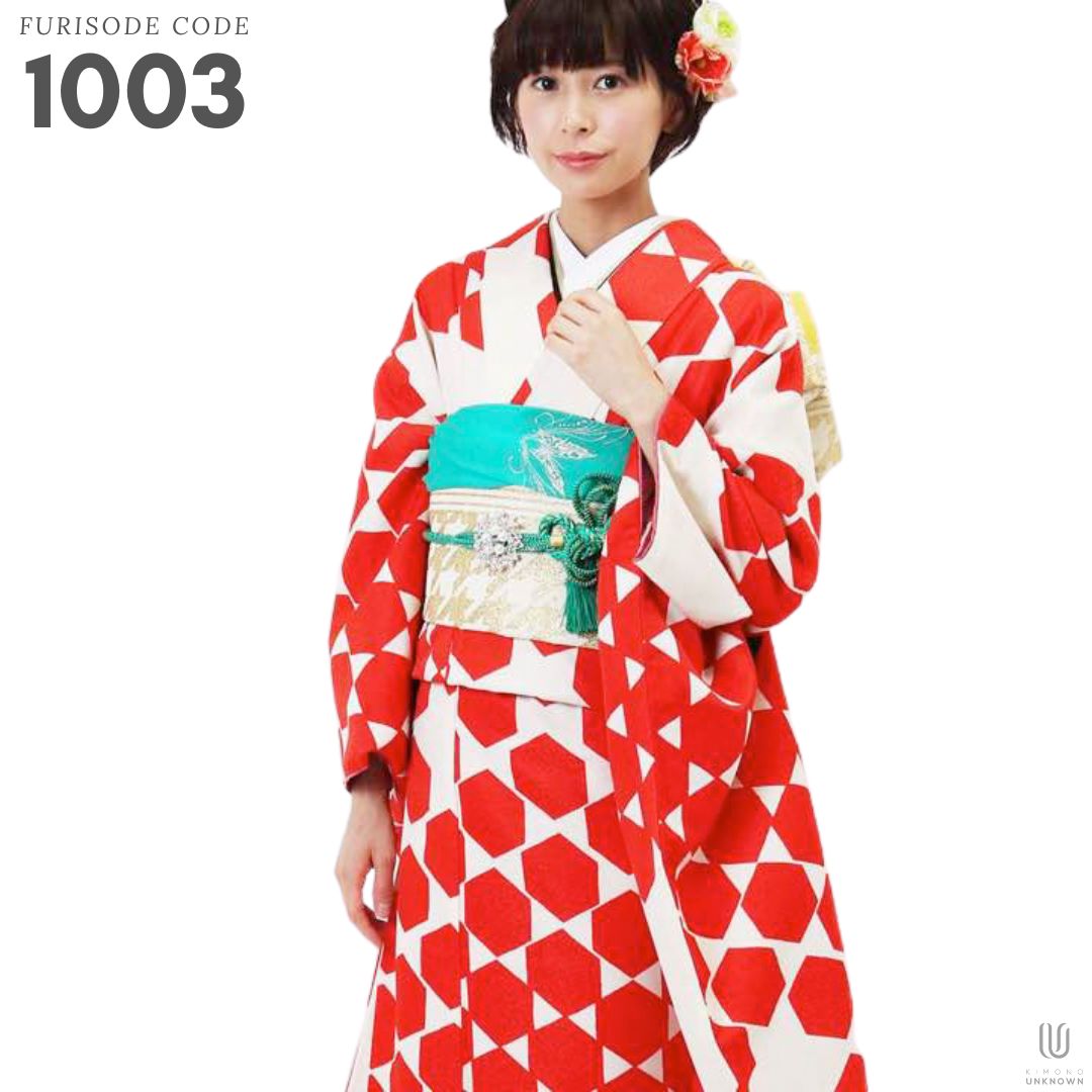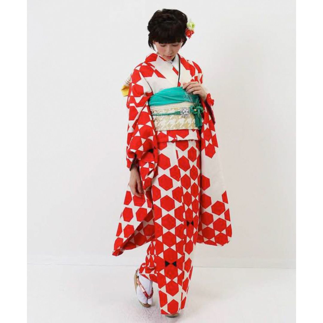 【対応身長155cm~170cm】【ポップ・キュート】【合繊】成人式レンタル振袖フルセット-1003 ヘキサゴン 白地 赤