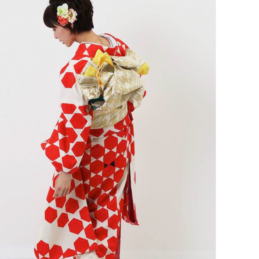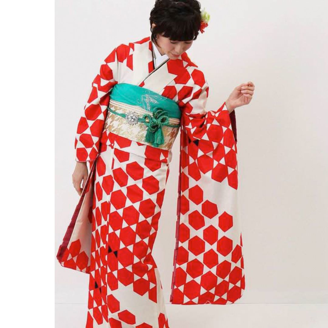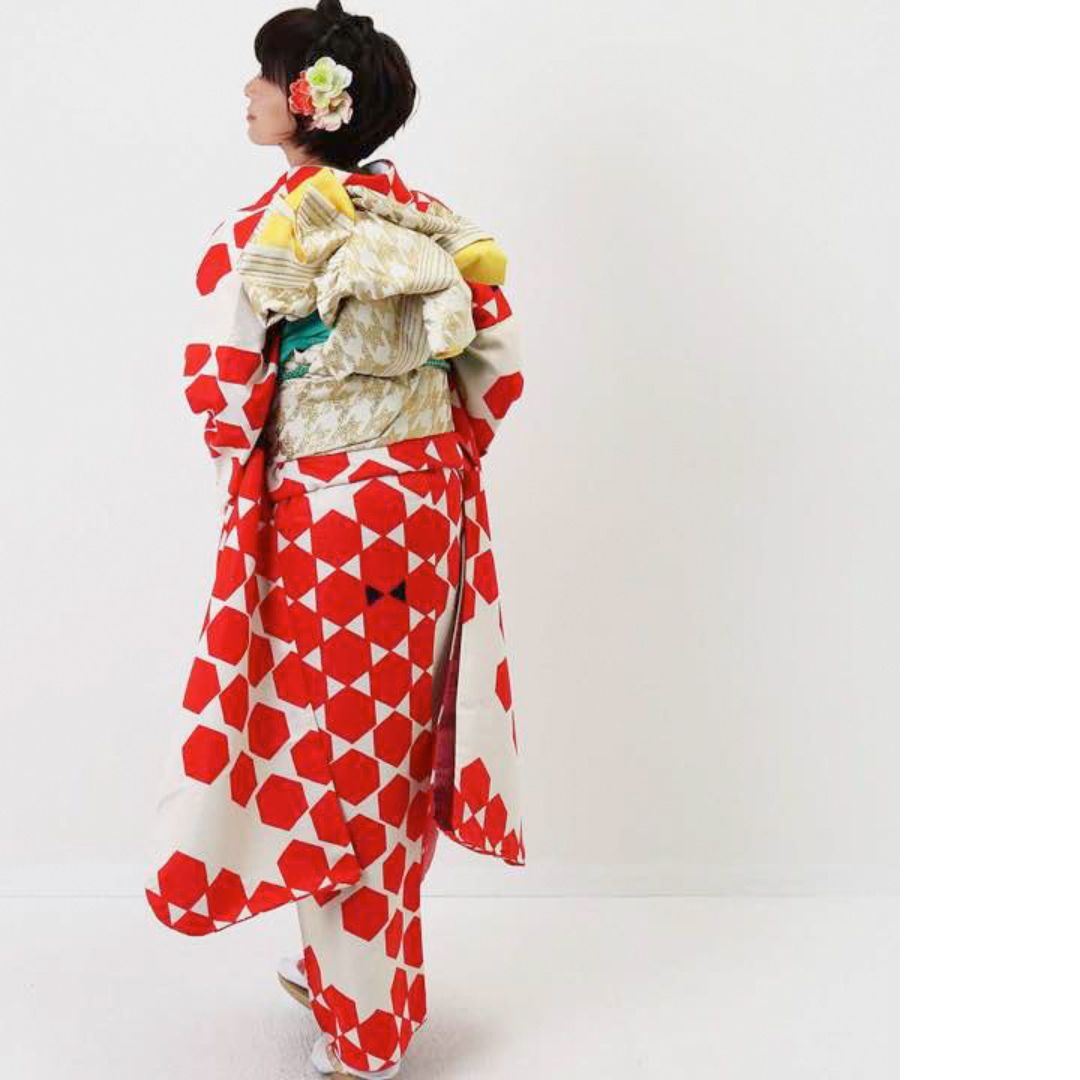 【対応身長155cm~170cm】【ポップ・キュート】【合繊】成人式レンタル振袖フルセット-1003 ヘキサゴン 白地 赤