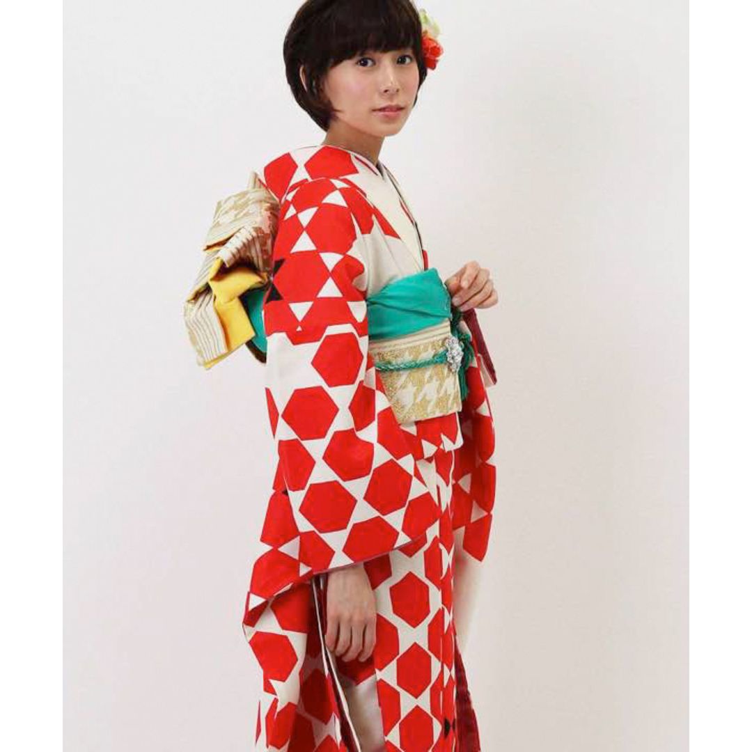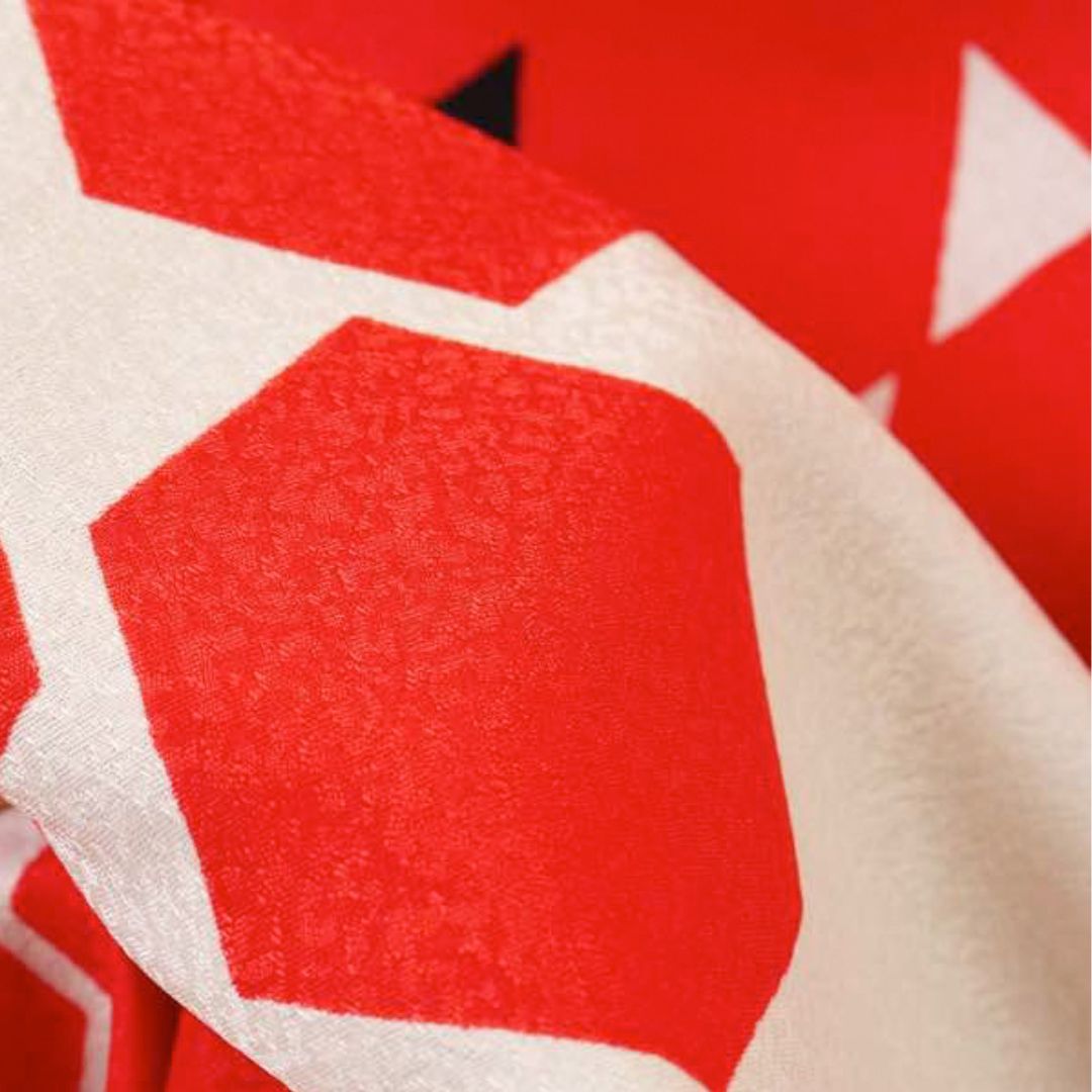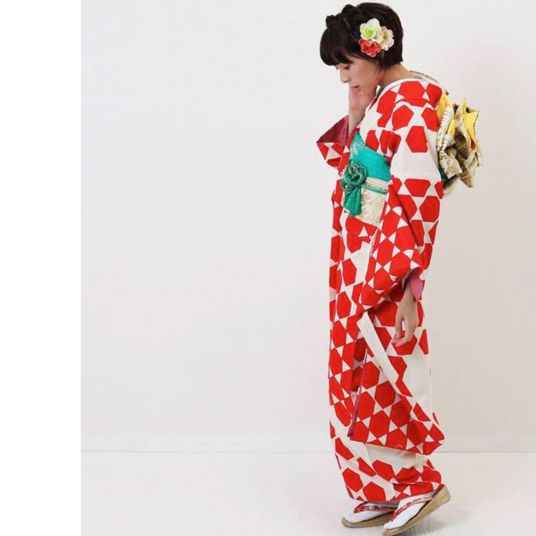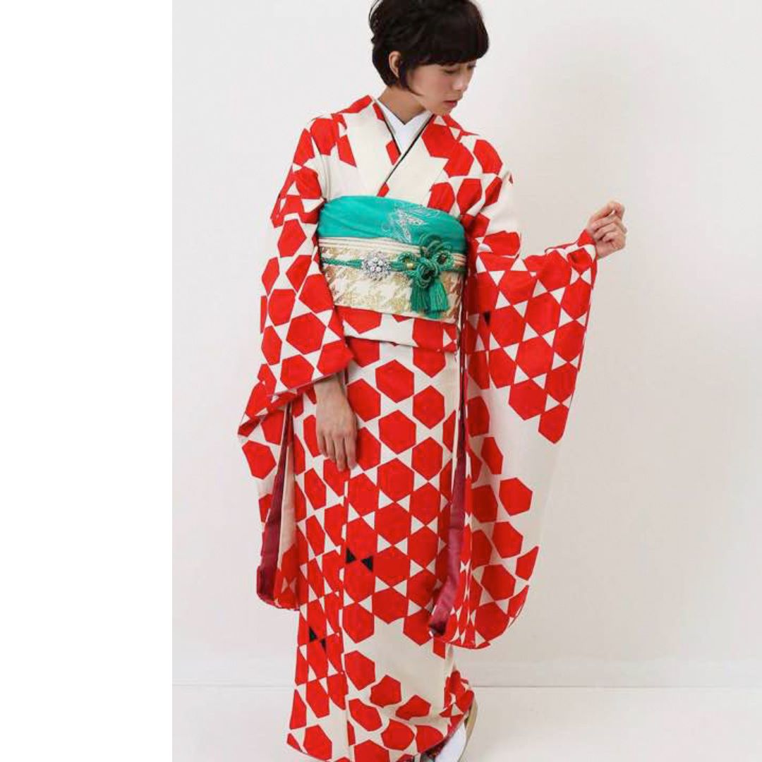 【対応身長155cm~170cm】【ポップ・キュート】【合繊】成人式レンタル振袖フルセット-1003 ヘキサゴン 白地 赤