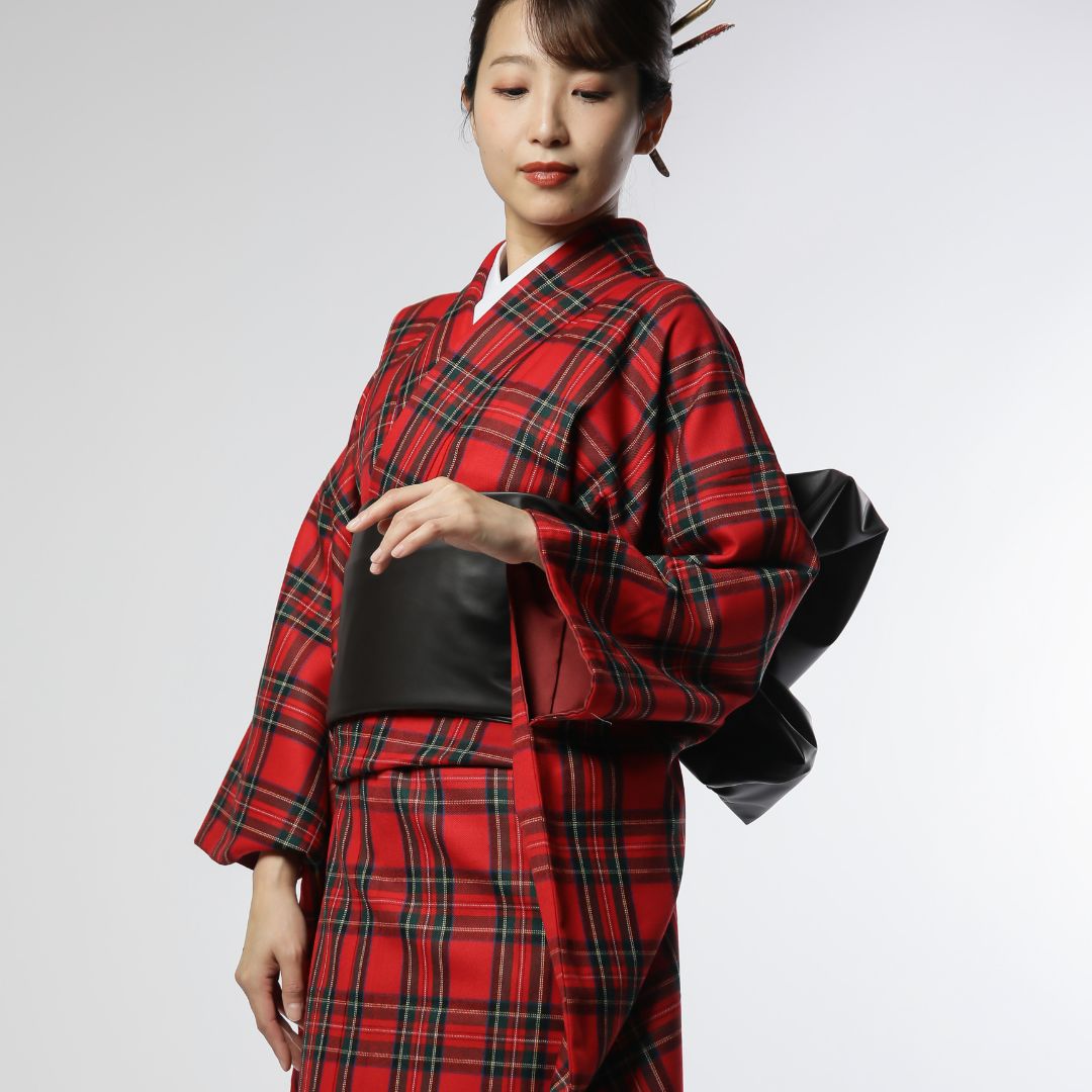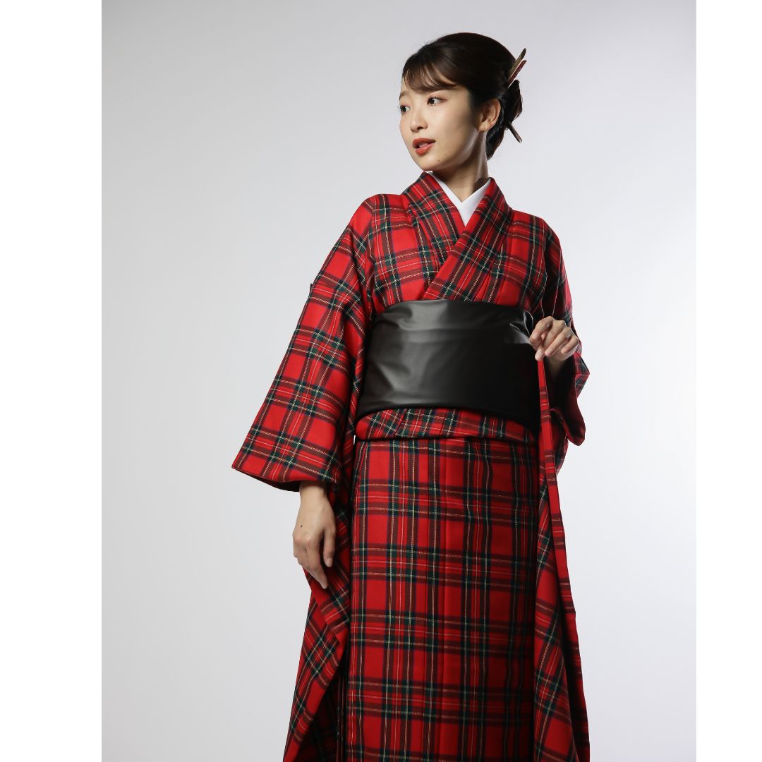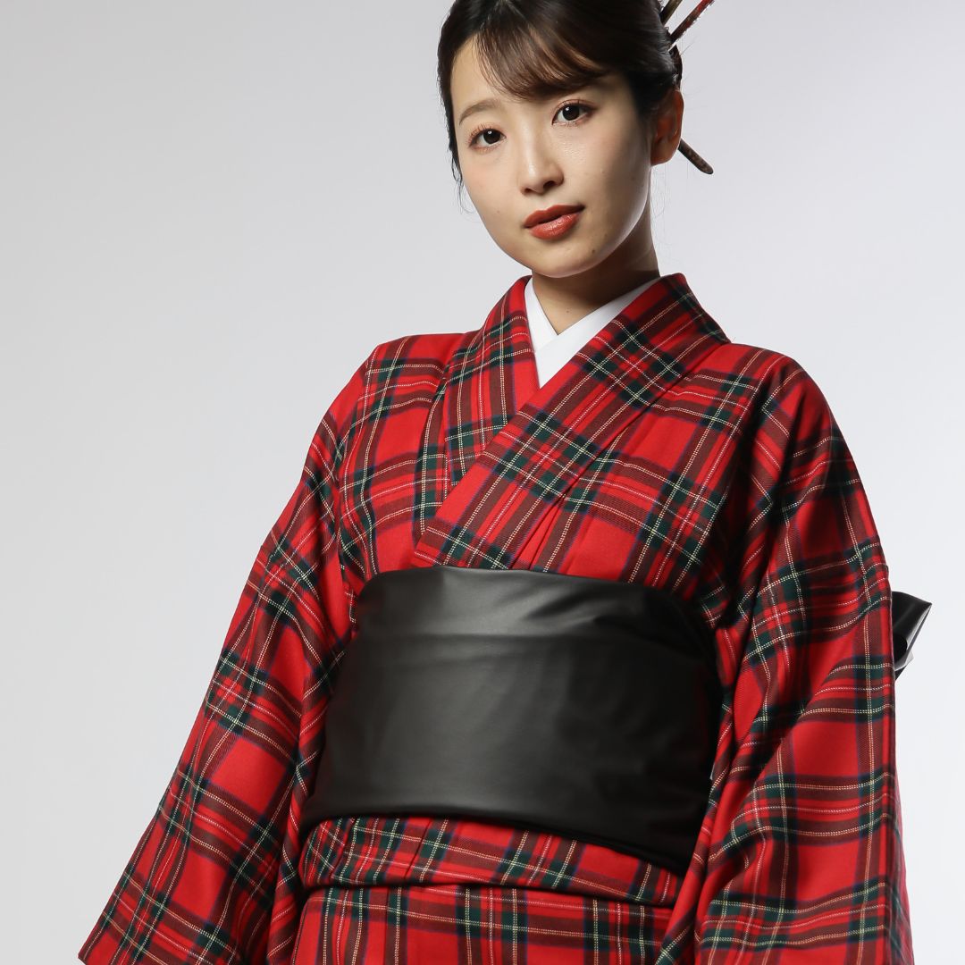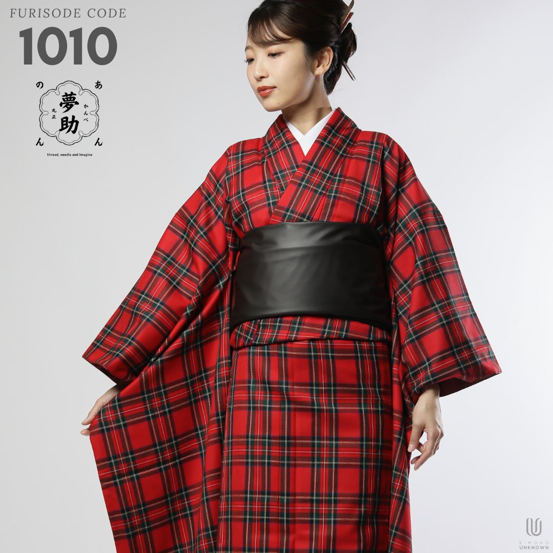 【対応身長160cm~175cm】【クール・モダン】【ウール】成人式レンタル振袖フルセット-1010 夢助 チェック柄 赤 黒 フェイクレザー帯