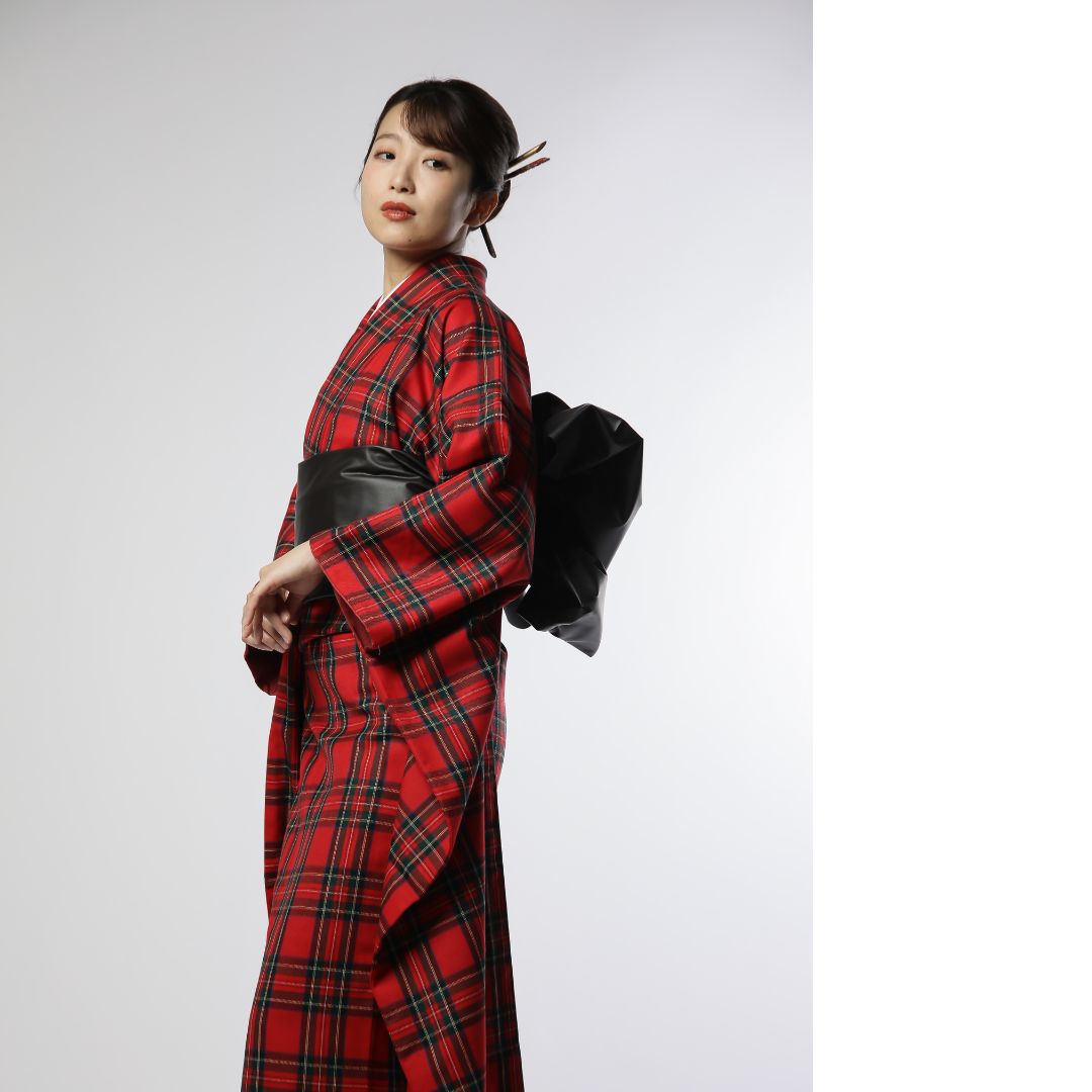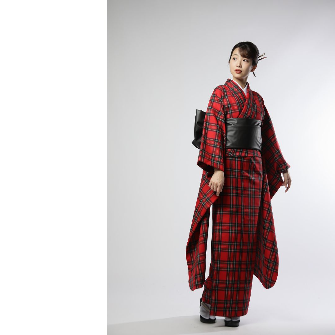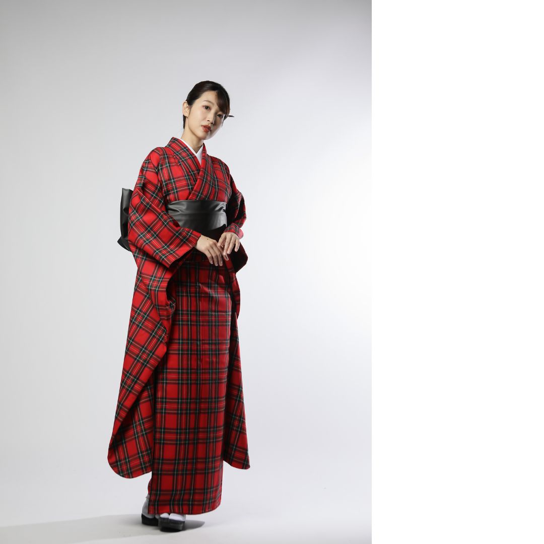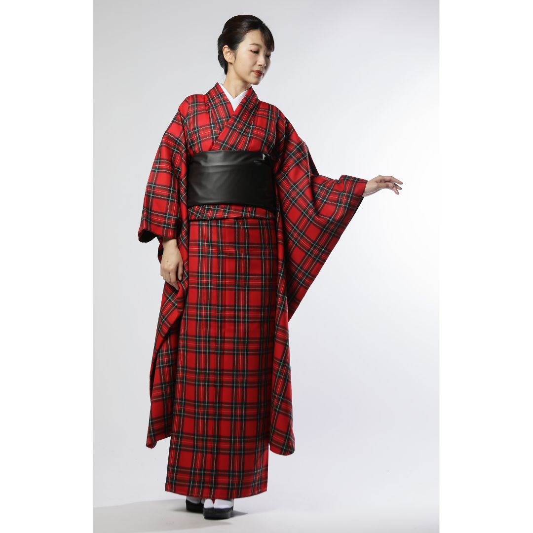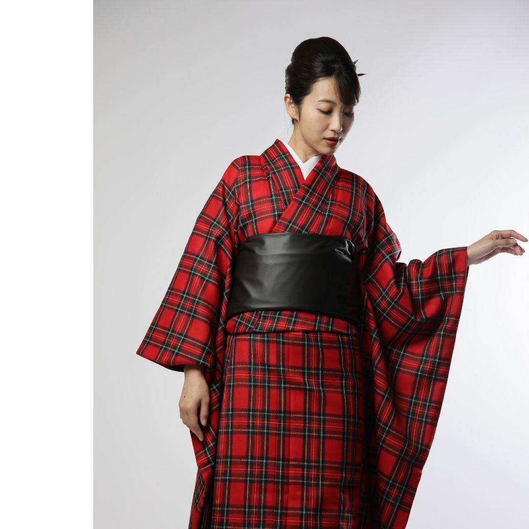 【対応身長160cm~175cm】【クール・モダン】【ウール】成人式レンタル振袖フルセット-1010 夢助 チェック柄 赤 黒 フェイクレザー帯