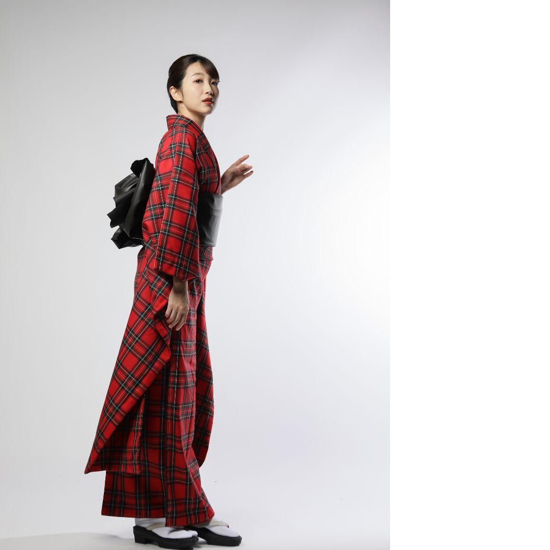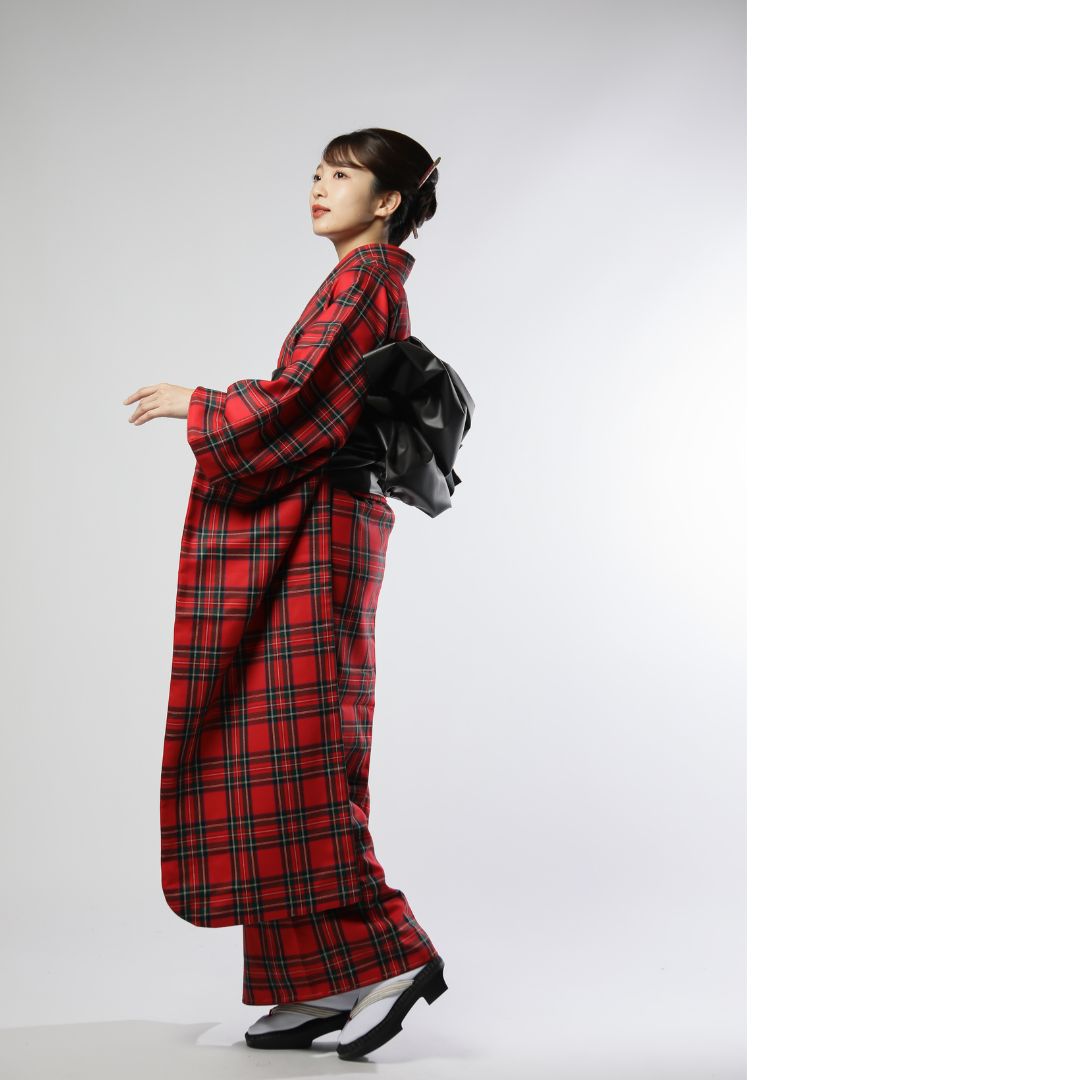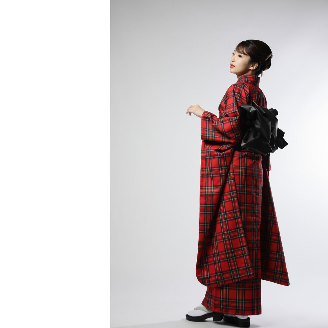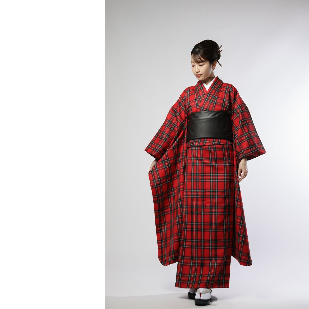 【対応身長160cm~175cm】【クール・モダン】【ウール】成人式レンタル振袖フルセット-1010 夢助 チェック柄 赤 黒 フェイクレザー帯