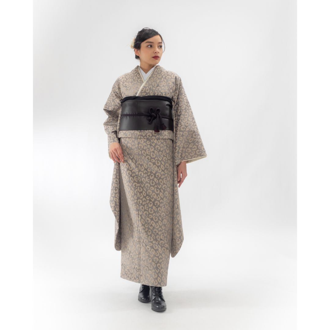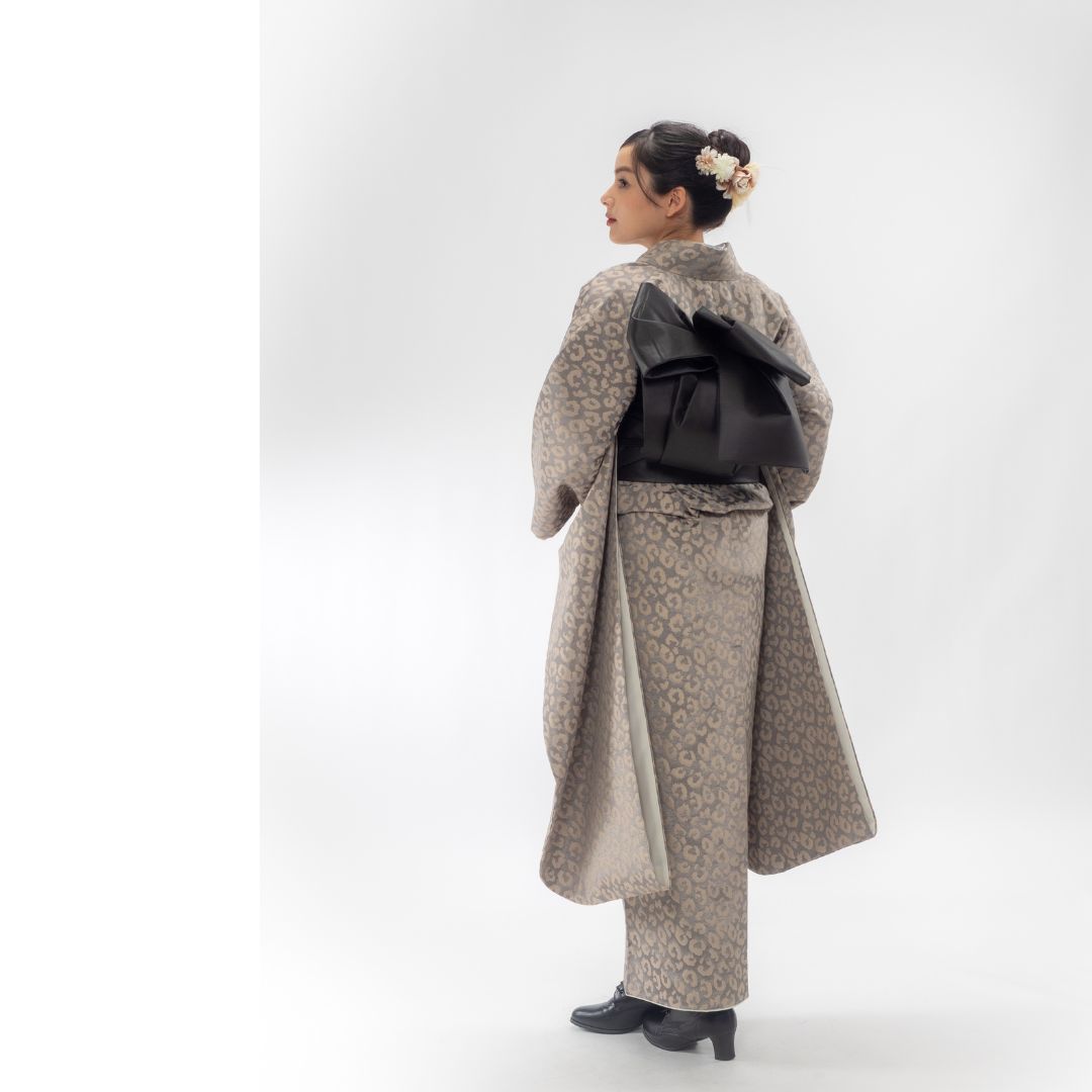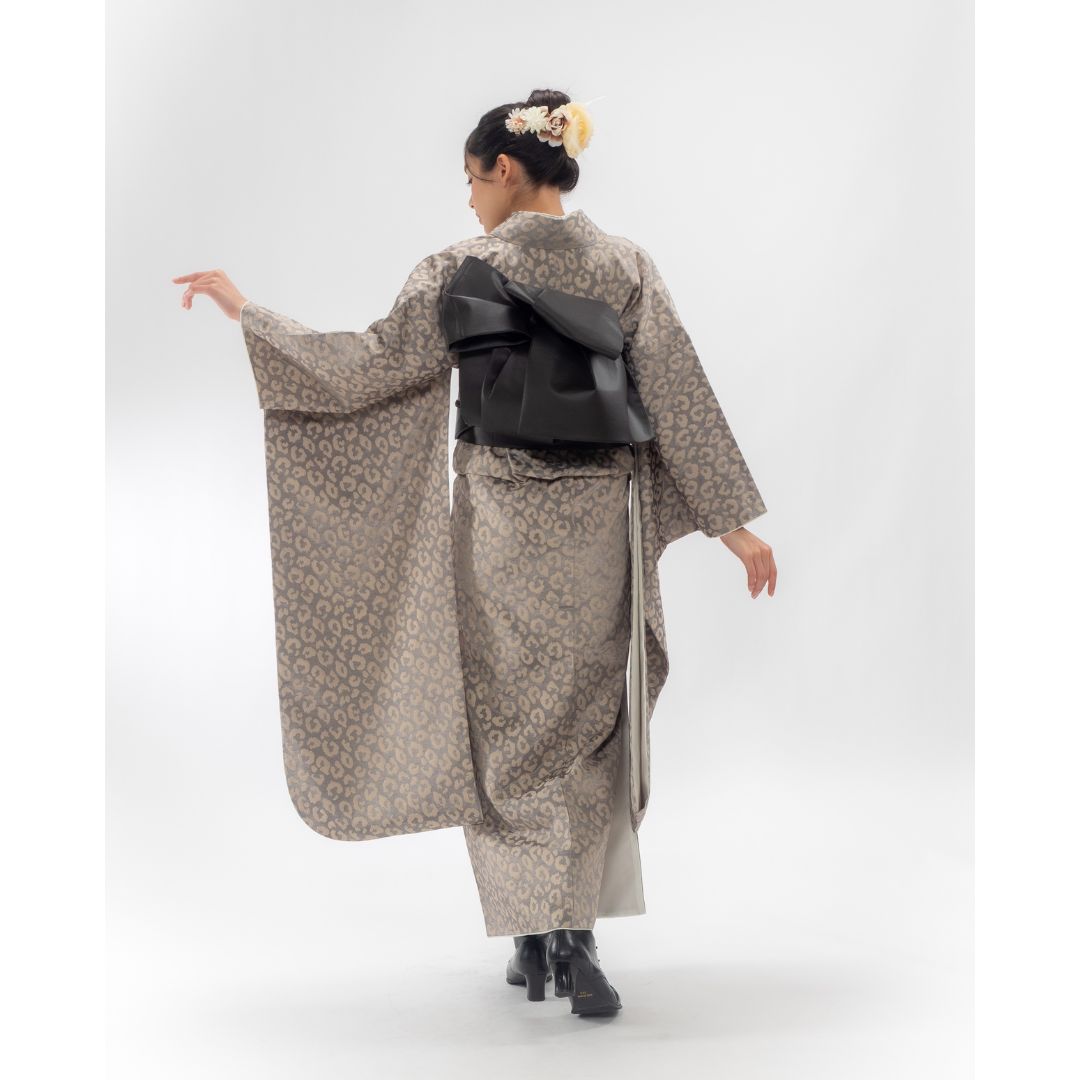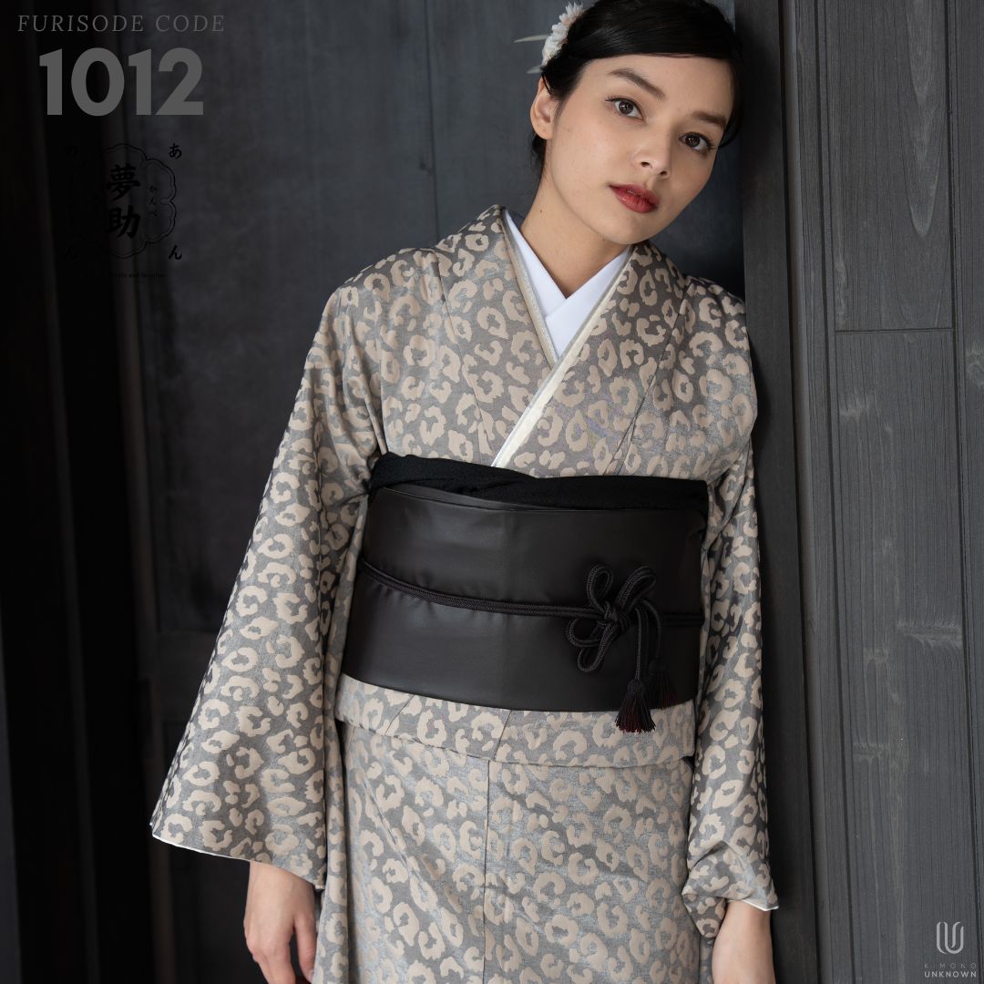 【対応身長160cm~175cm】【ポップ・キュート】成人式レンタル振袖フルセット-1012 夢助 豹柄振袖 ベージュ 夢助フェイクレザー帯 黒