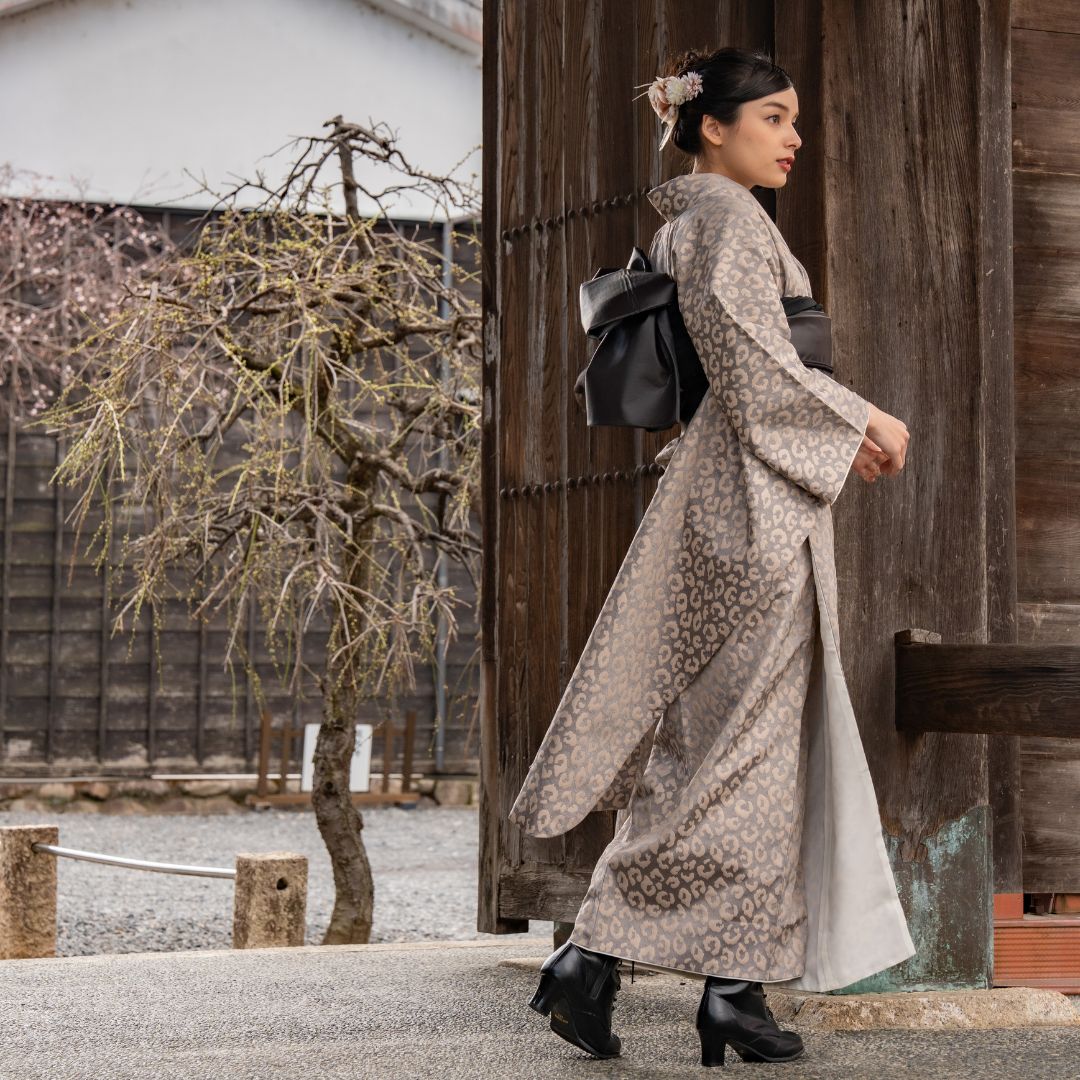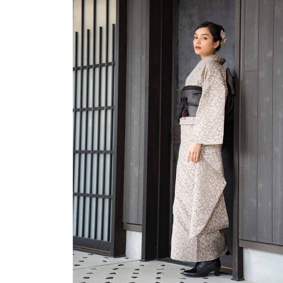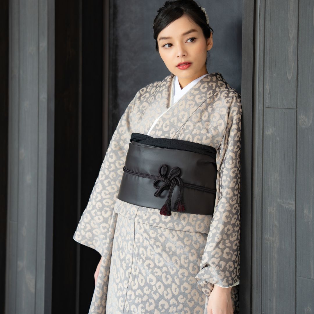 【対応身長160cm~175cm】【ポップ・キュート】成人式レンタル振袖フルセット-1012 夢助 豹柄振袖 ベージュ 夢助フェイクレザー帯 黒