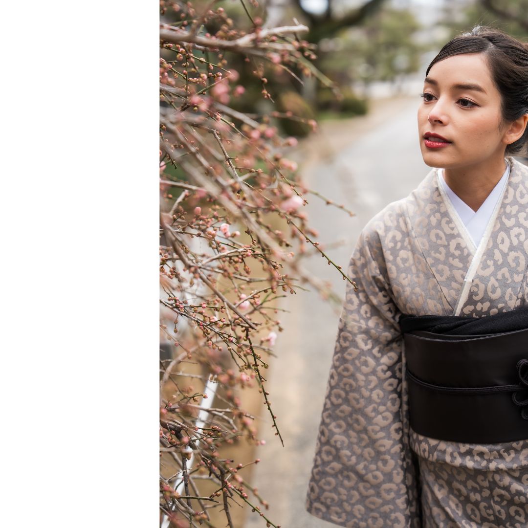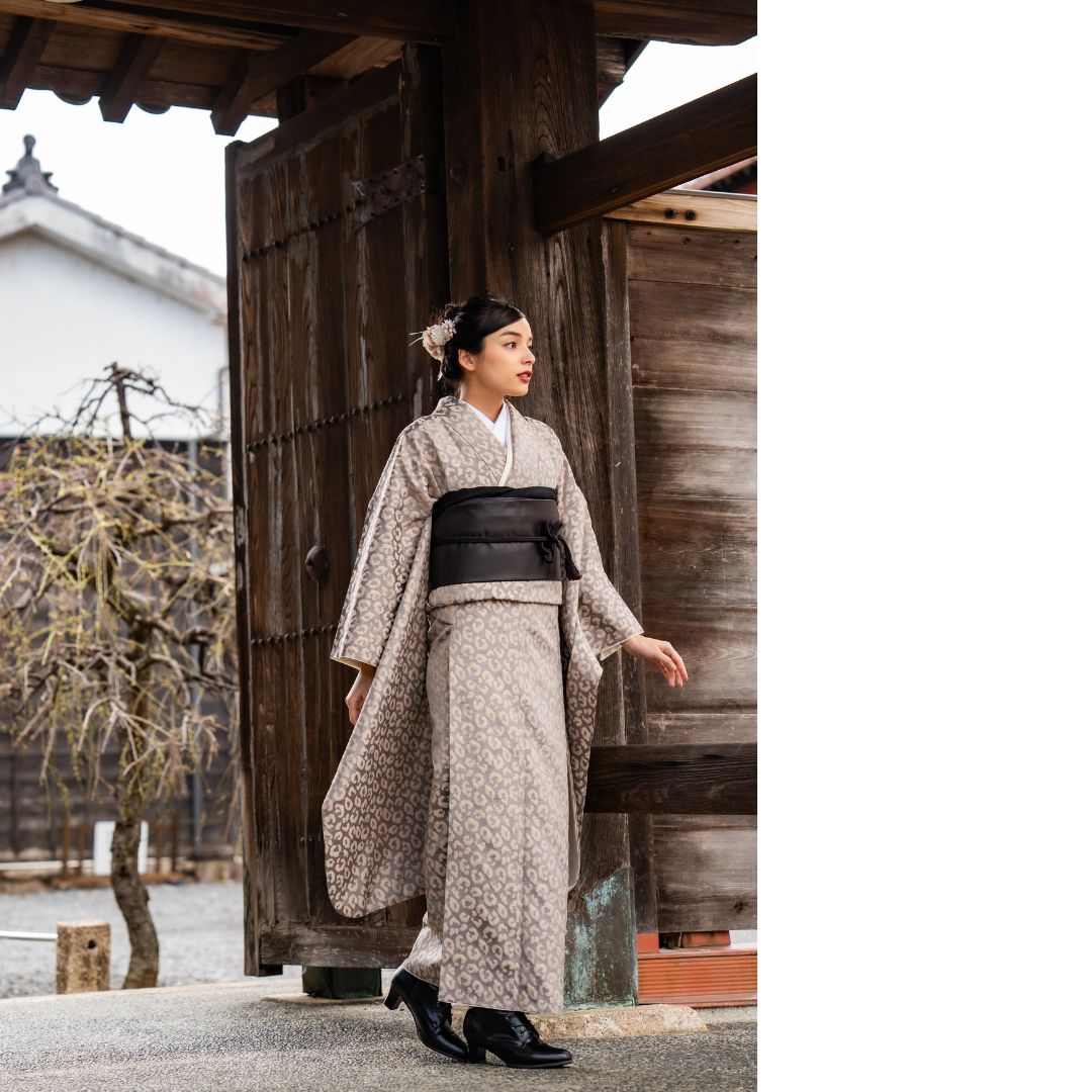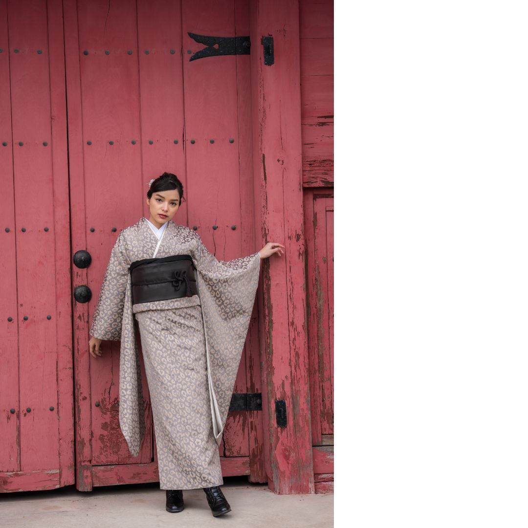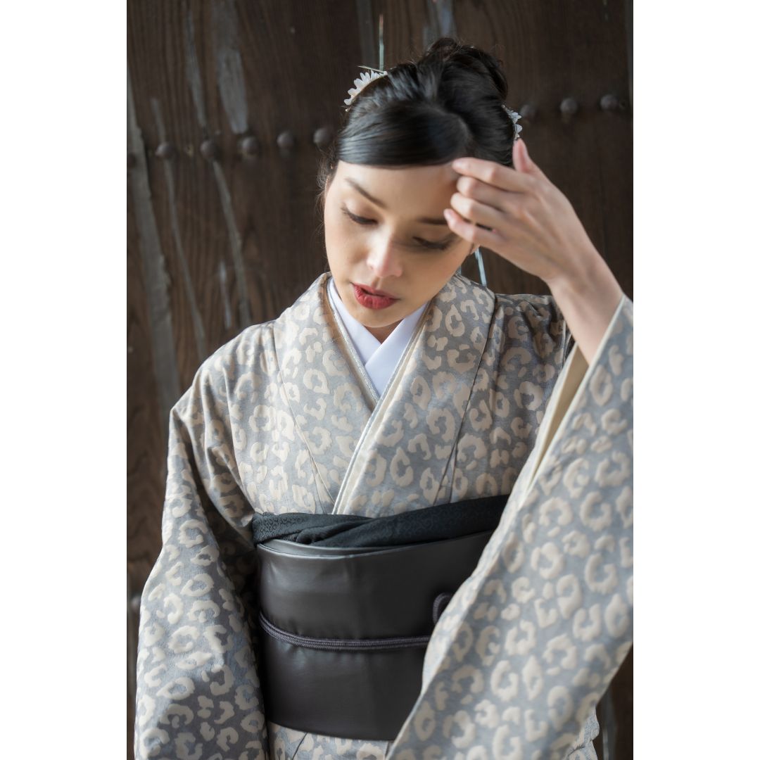 【対応身長160cm~175cm】【ポップ・キュート】成人式レンタル振袖フルセット-1012 夢助 豹柄振袖 ベージュ 夢助フェイクレザー帯 黒