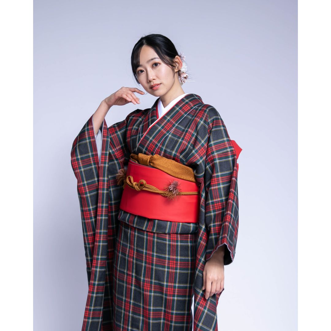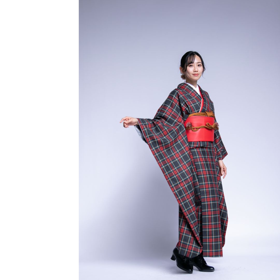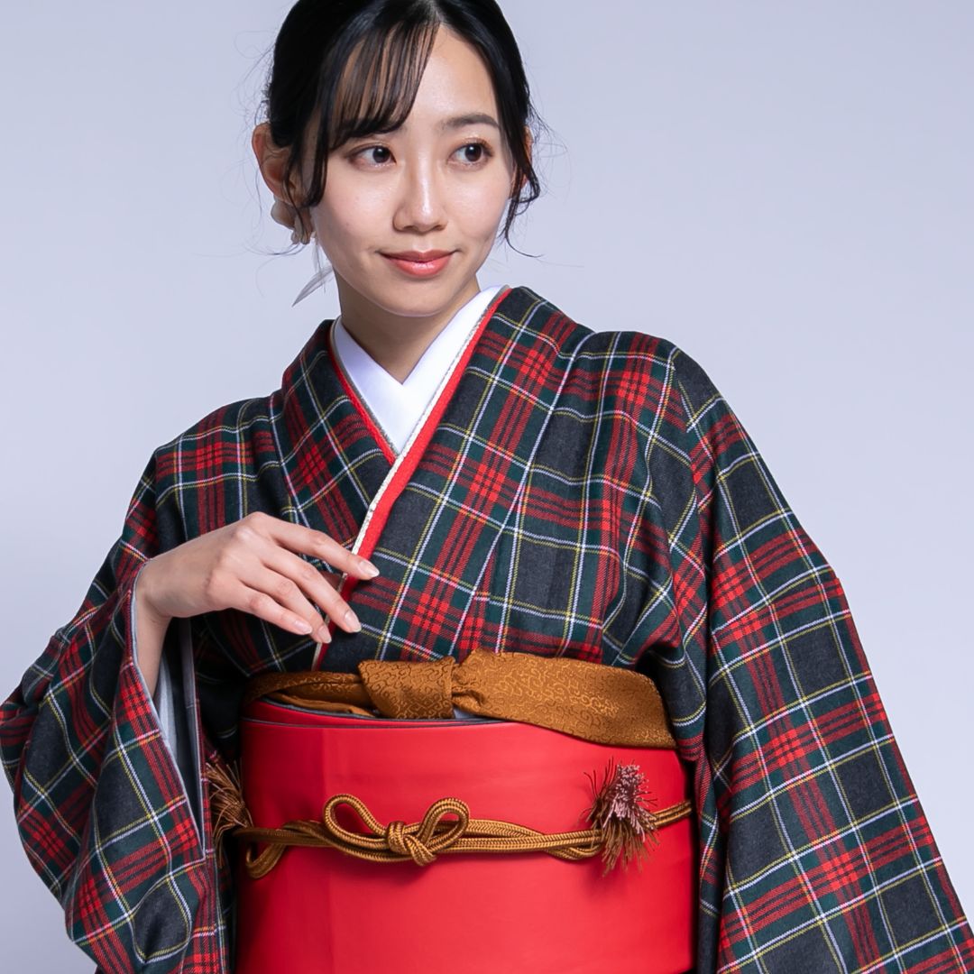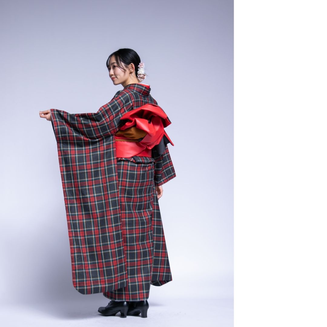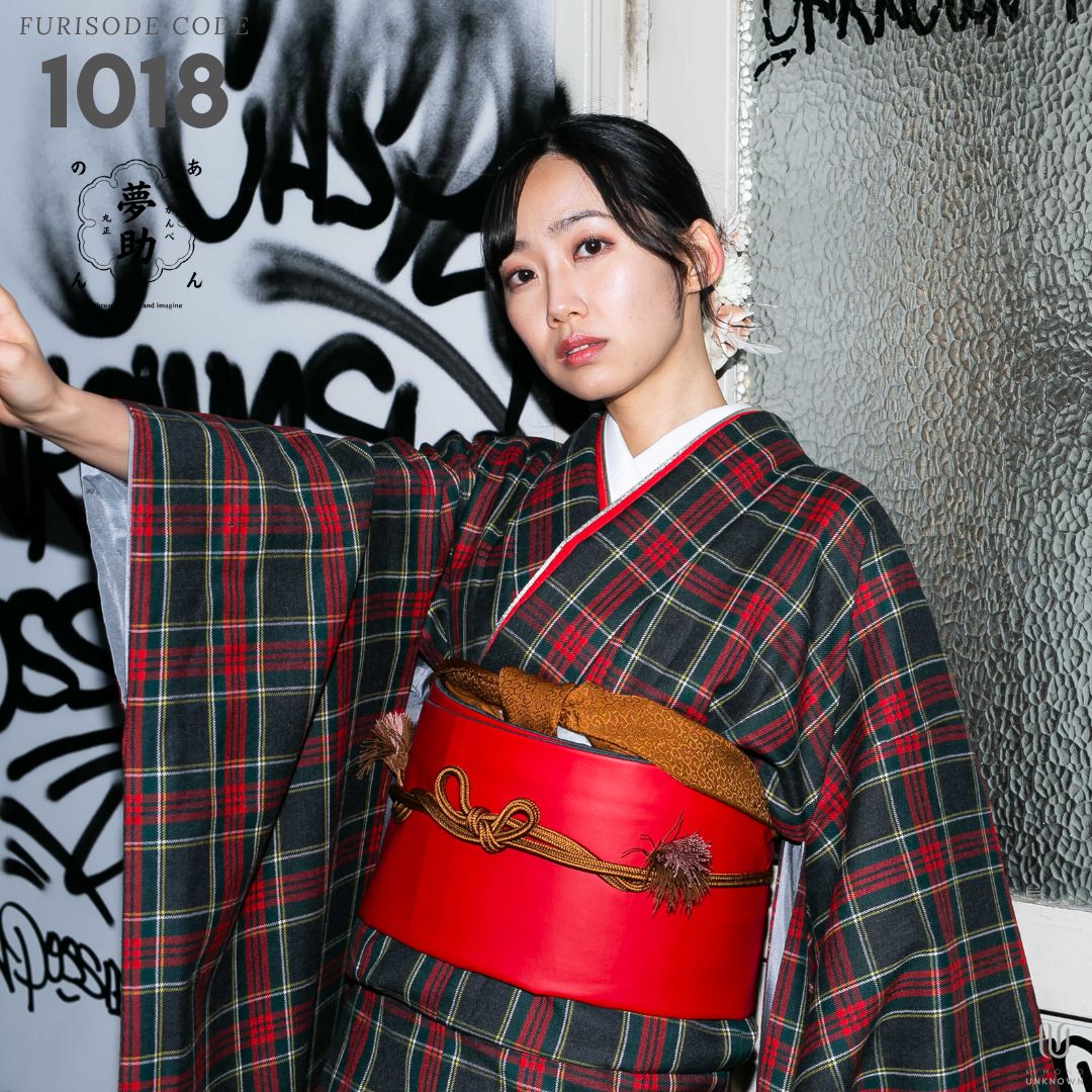 【対応身長160cm~175cm】【ポップ・キュート】【ウール】成人式レンタル振袖フルセット-1018 夢助 チェック柄 黒 赤 夢助フェイクレザー帯 赤