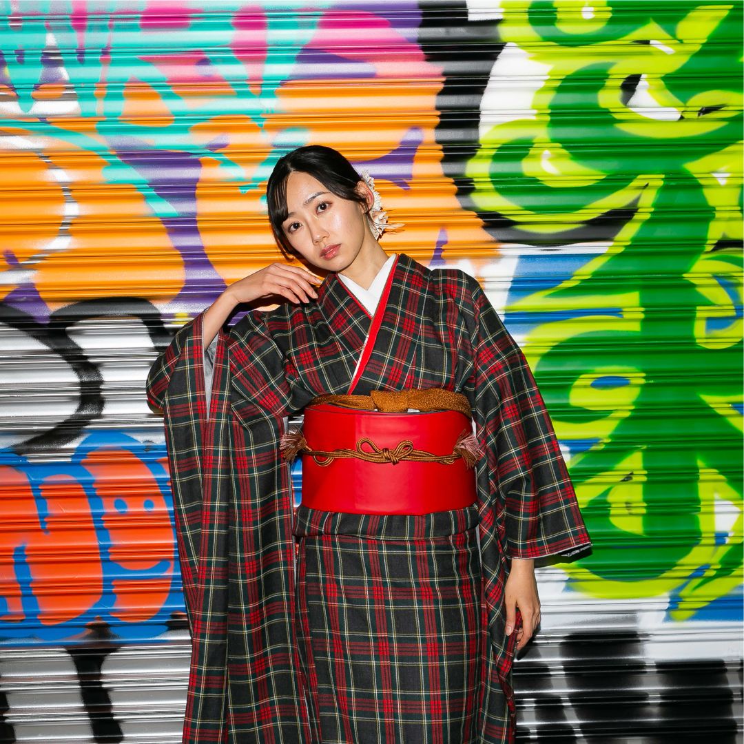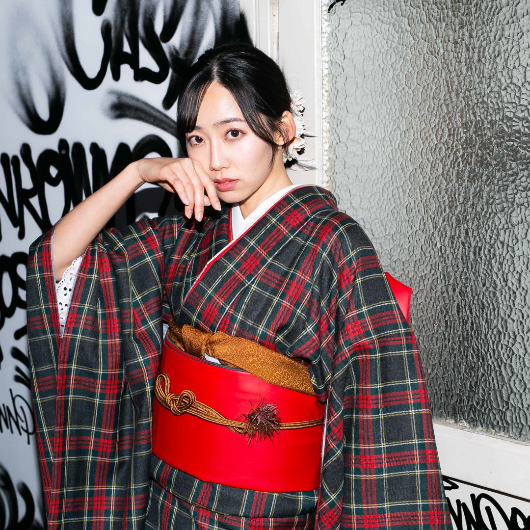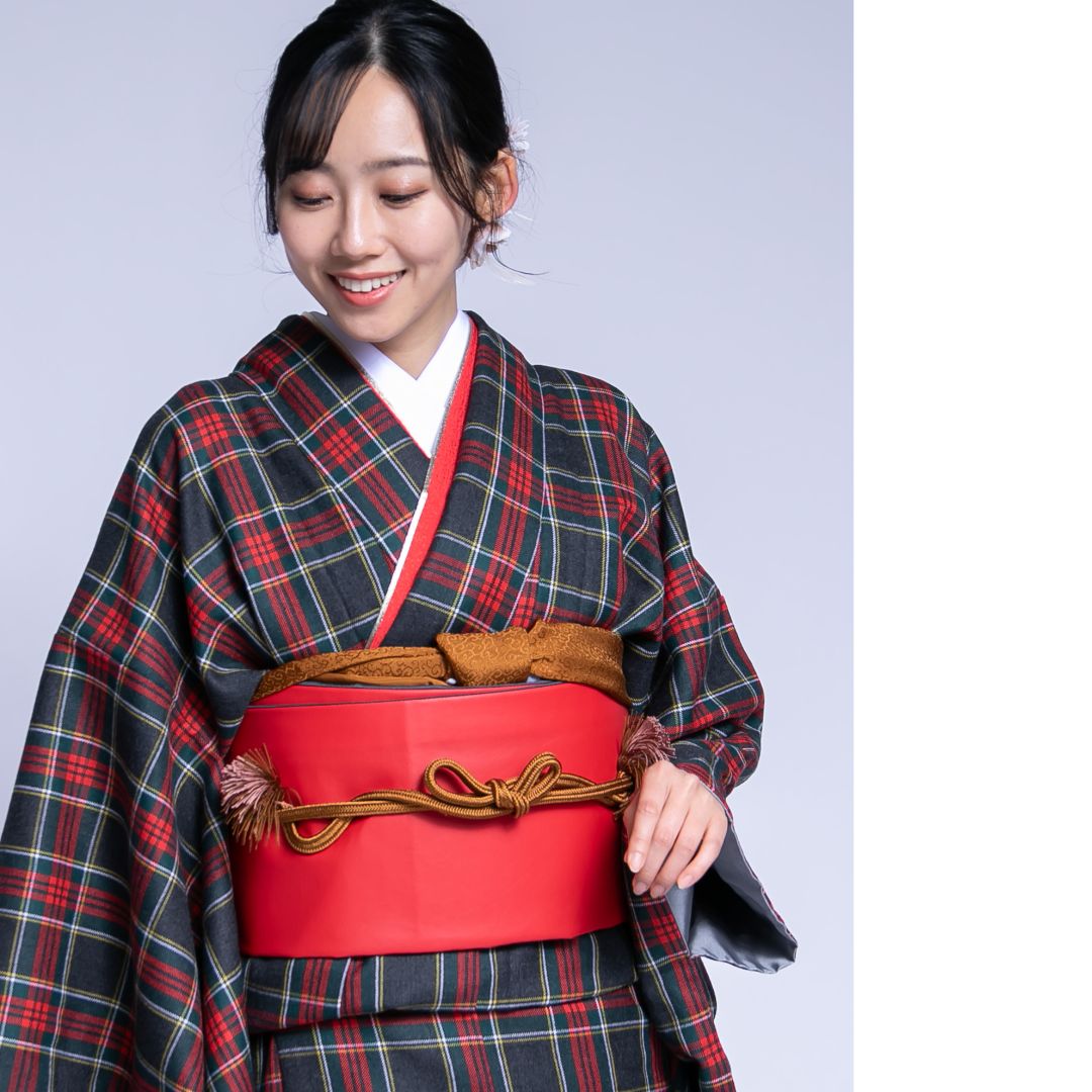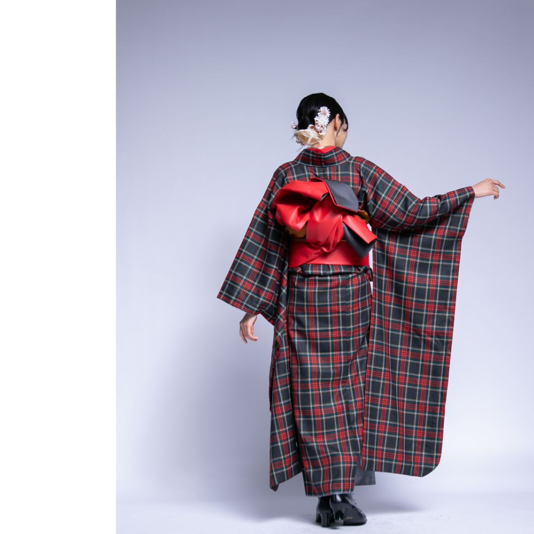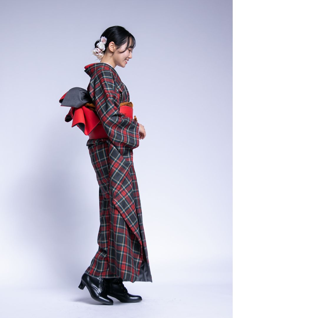 【対応身長160cm~175cm】【ポップ・キュート】【ウール】成人式レンタル振袖フルセット-1018 夢助 チェック柄 黒 赤 夢助フェイクレザー帯 赤
