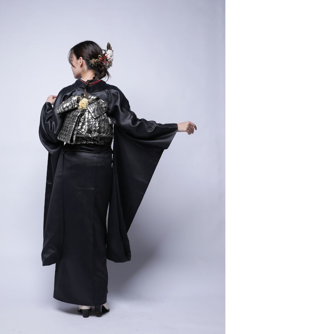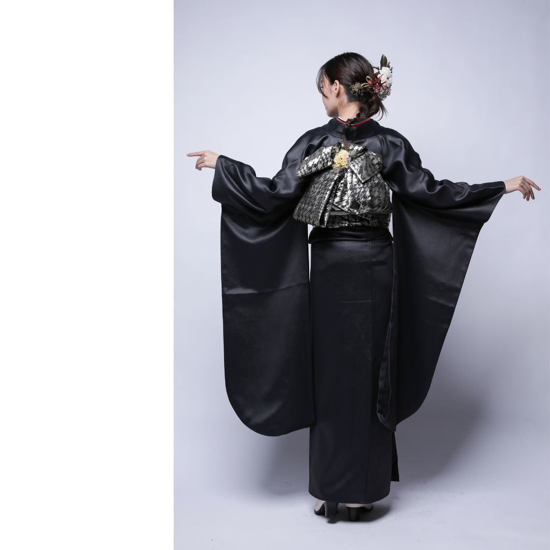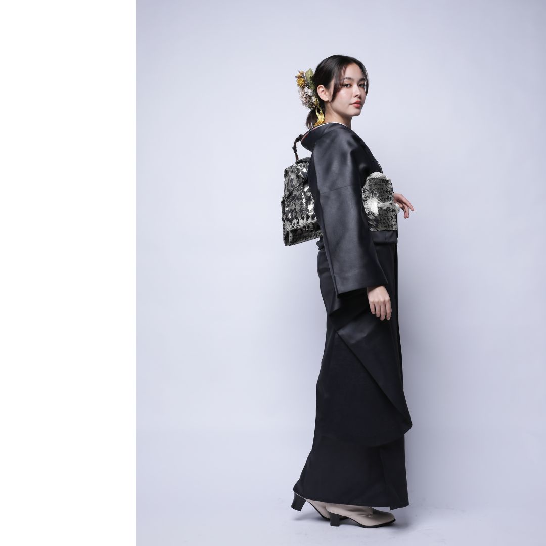 【対応身長160cm~175cm】【クール・モダン】成人式レンタル振袖フルセット-1022 フェイクレザー 無地振袖 黒 ブラック 夢助 箔帯 銀 黒