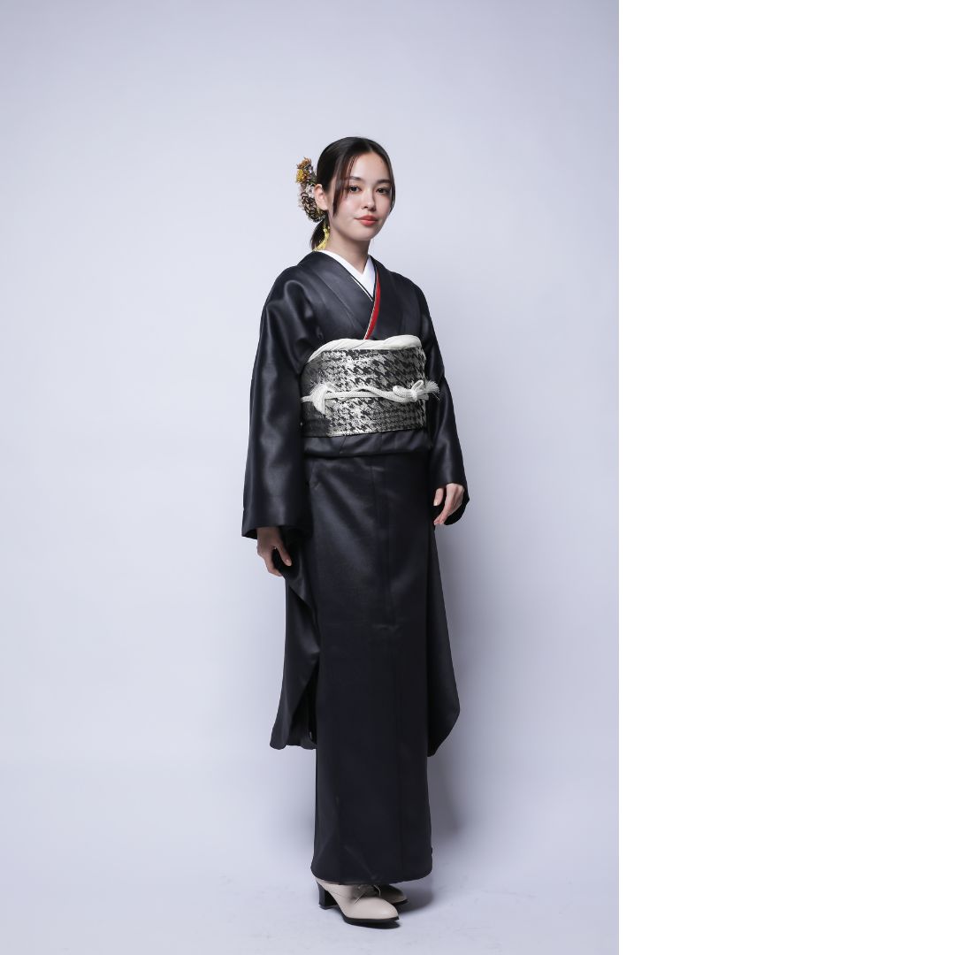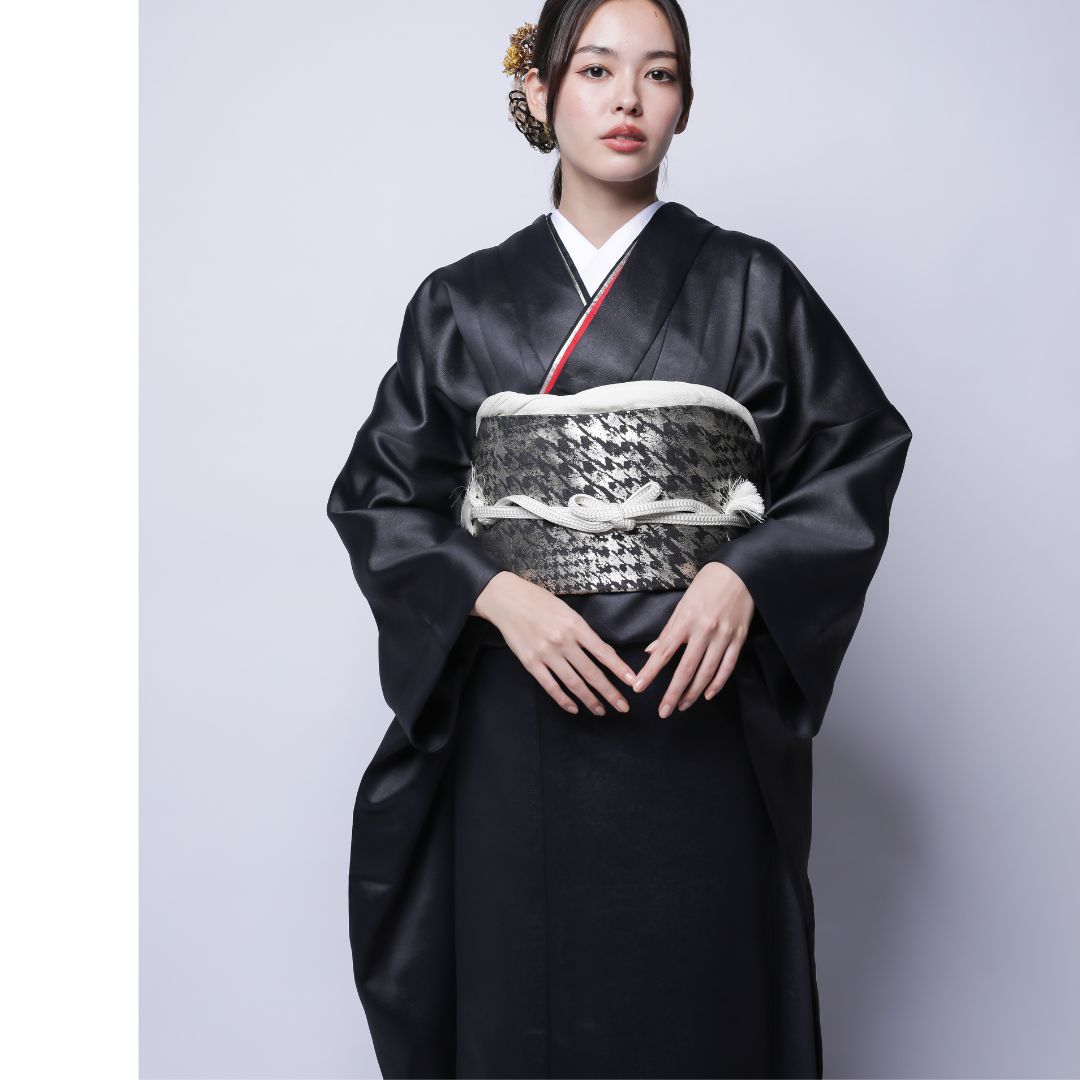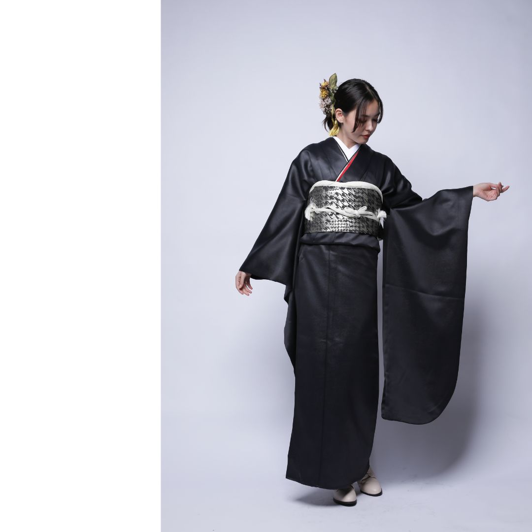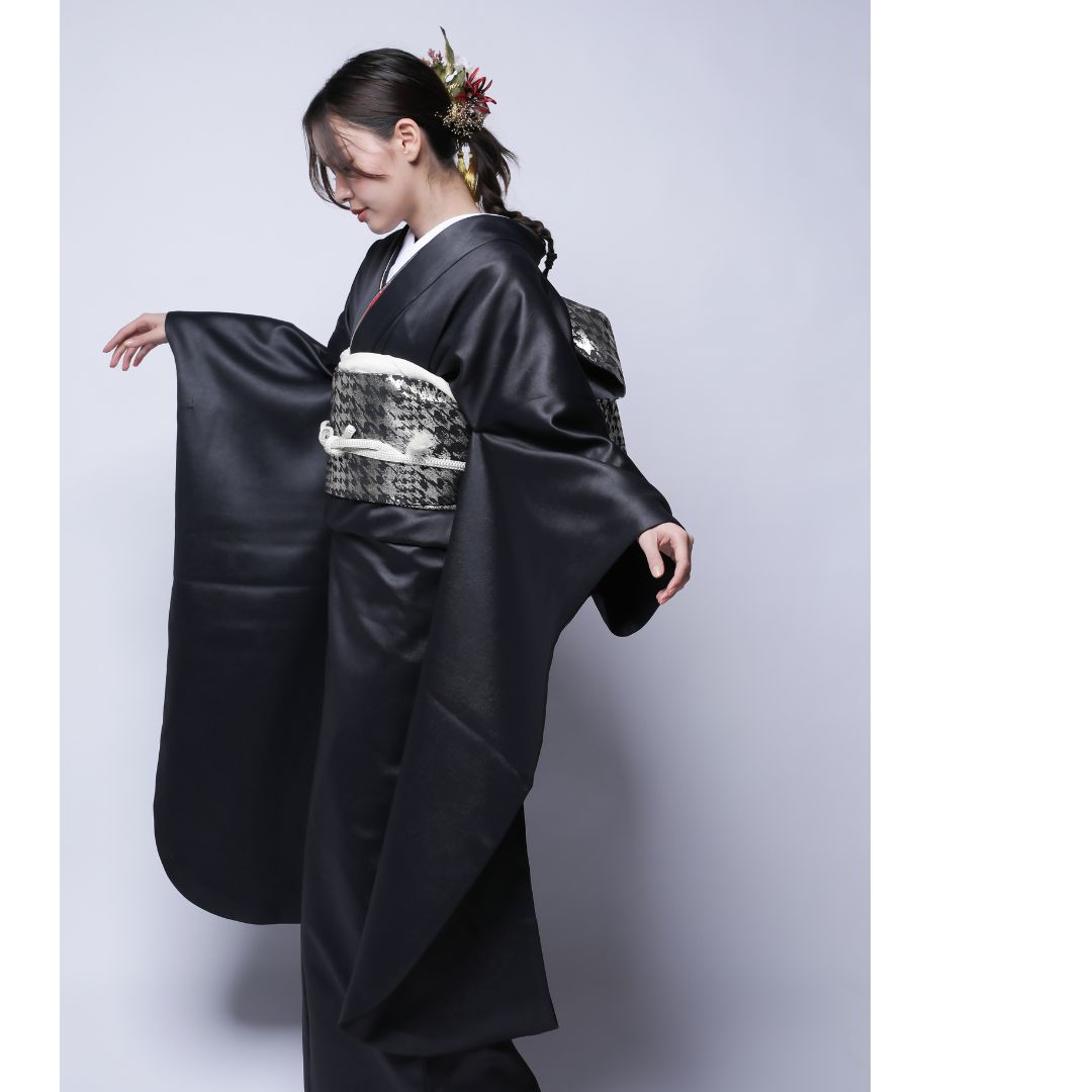 【対応身長160cm~175cm】【クール・モダン】成人式レンタル振袖フルセット-1022 フェイクレザー 無地振袖 黒 ブラック 夢助 箔帯 銀 黒