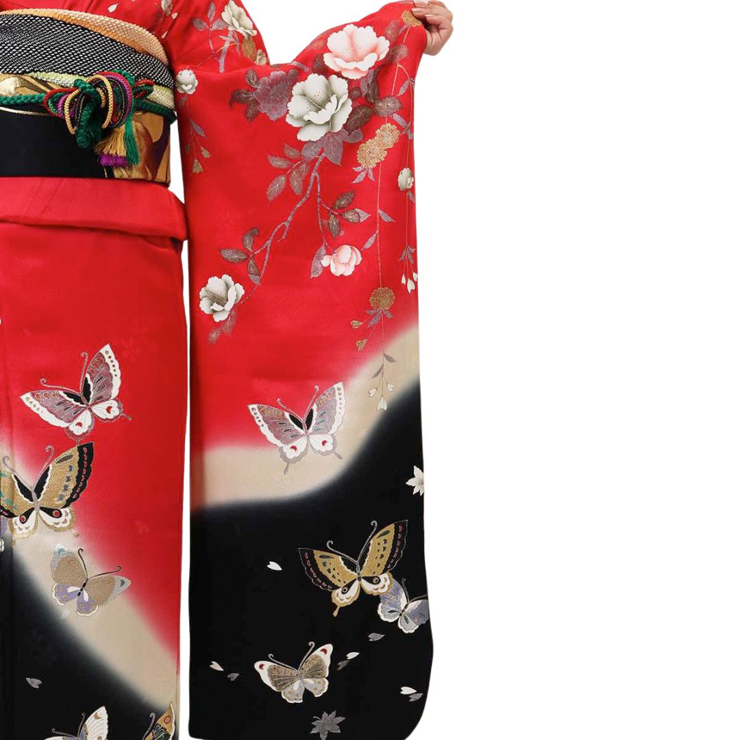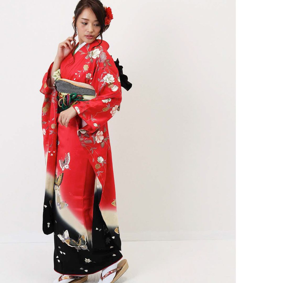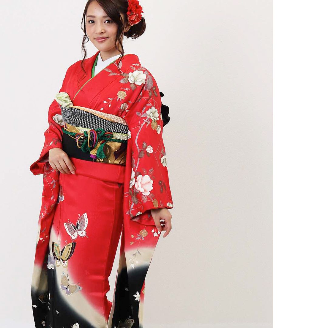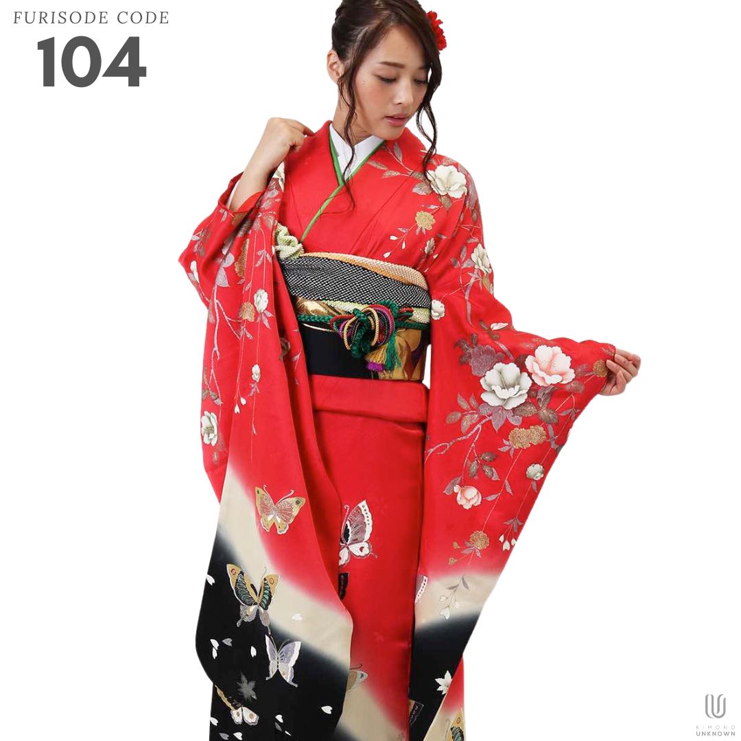 【対応身長150cm~165cm】【ポップ・キュート】【正絹】成人式レンタル振袖フルセット-104 花柄 定番 レトロ ポップキュート 赤系 黒系 蝶 洋花