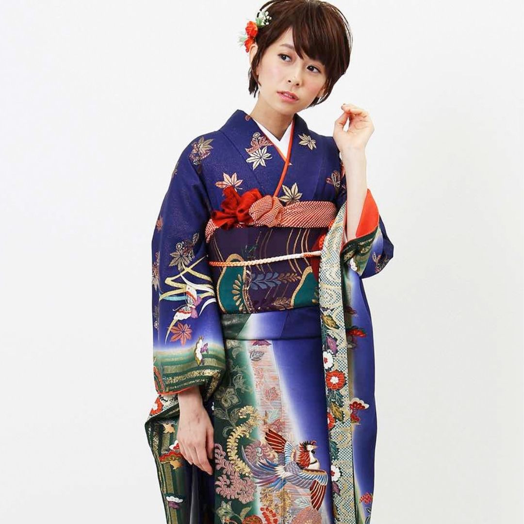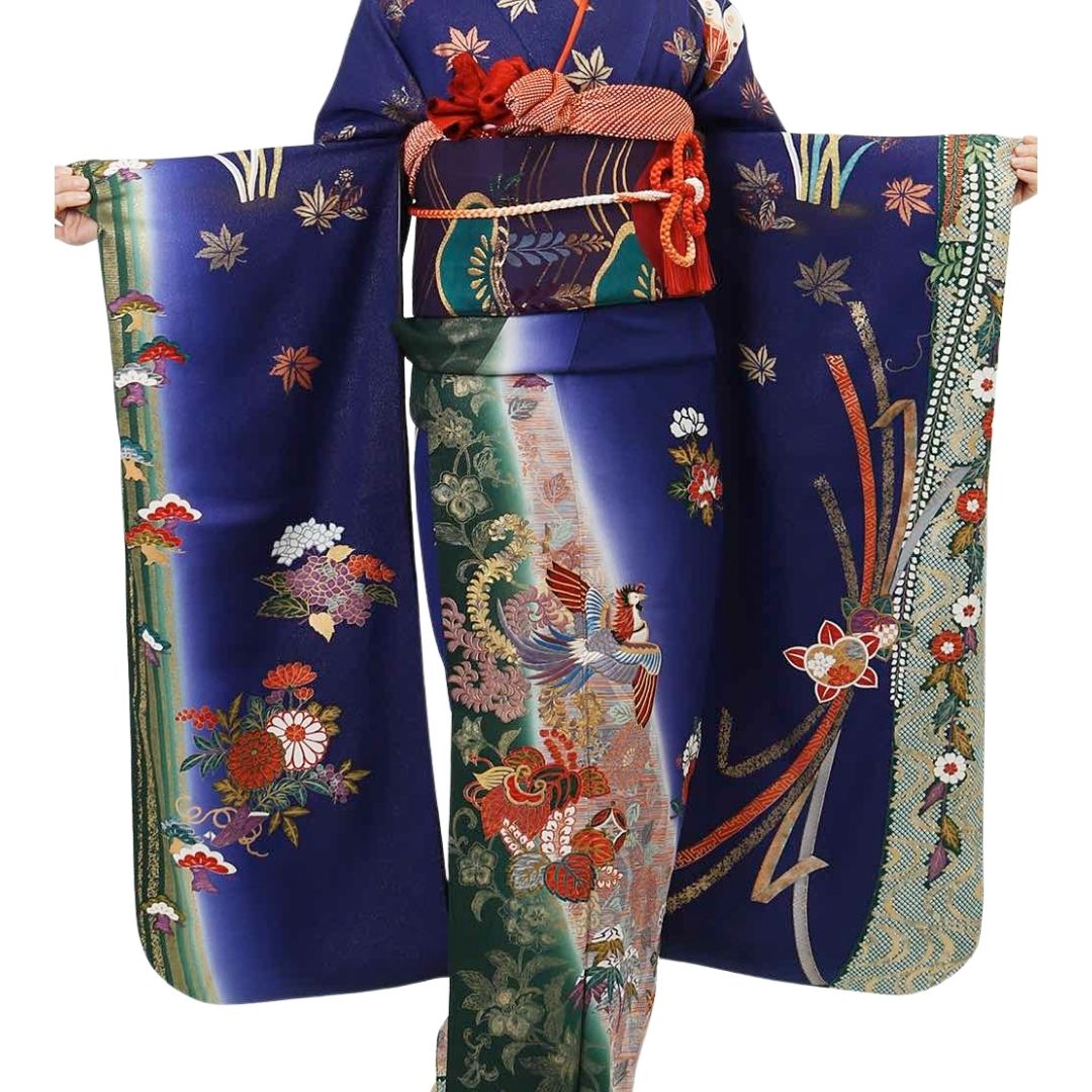 【対応身長150cm~165cm】【レトロ・アンティーク】【正絹】成人式レンタル振袖フルセット-129 花柄 レトロ クール系 古典 青系 鳳凰 桜 疋田 金彩