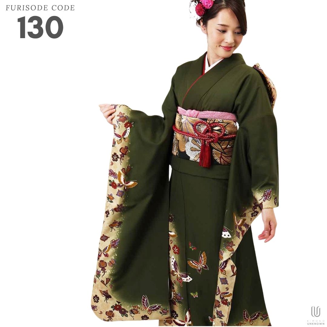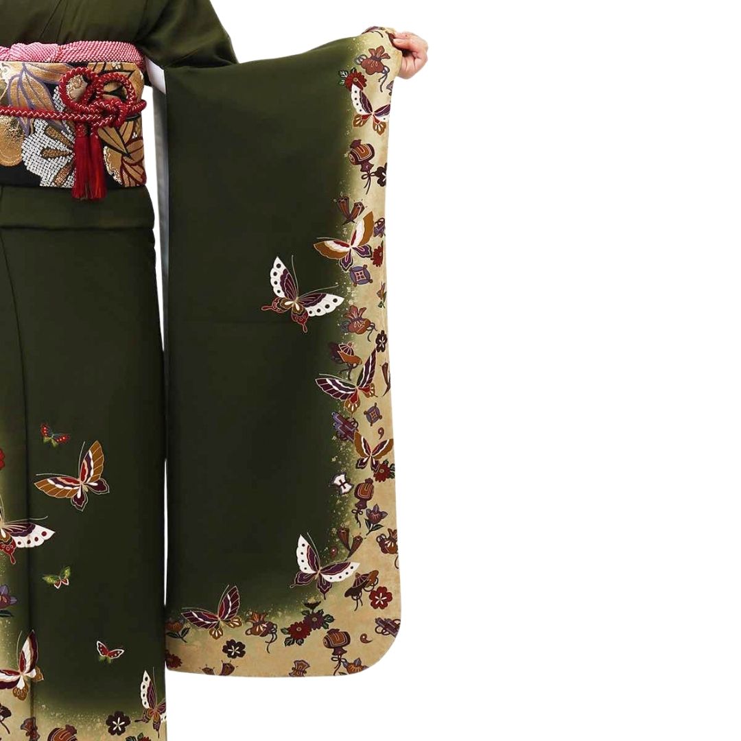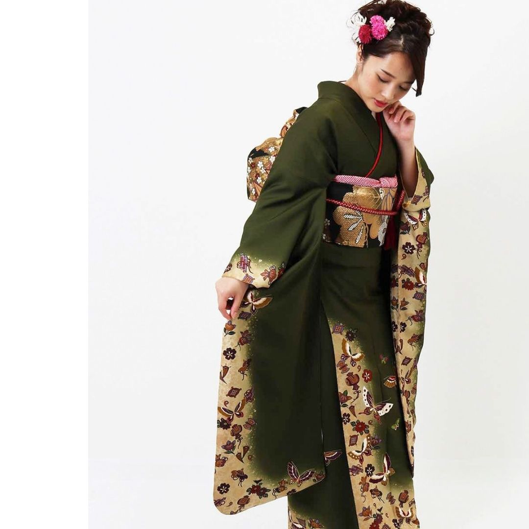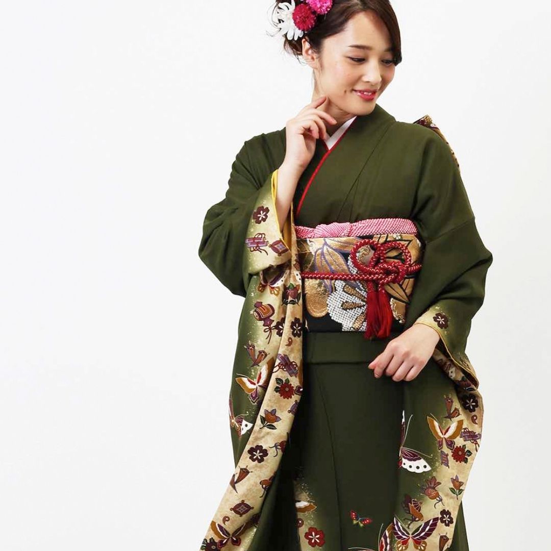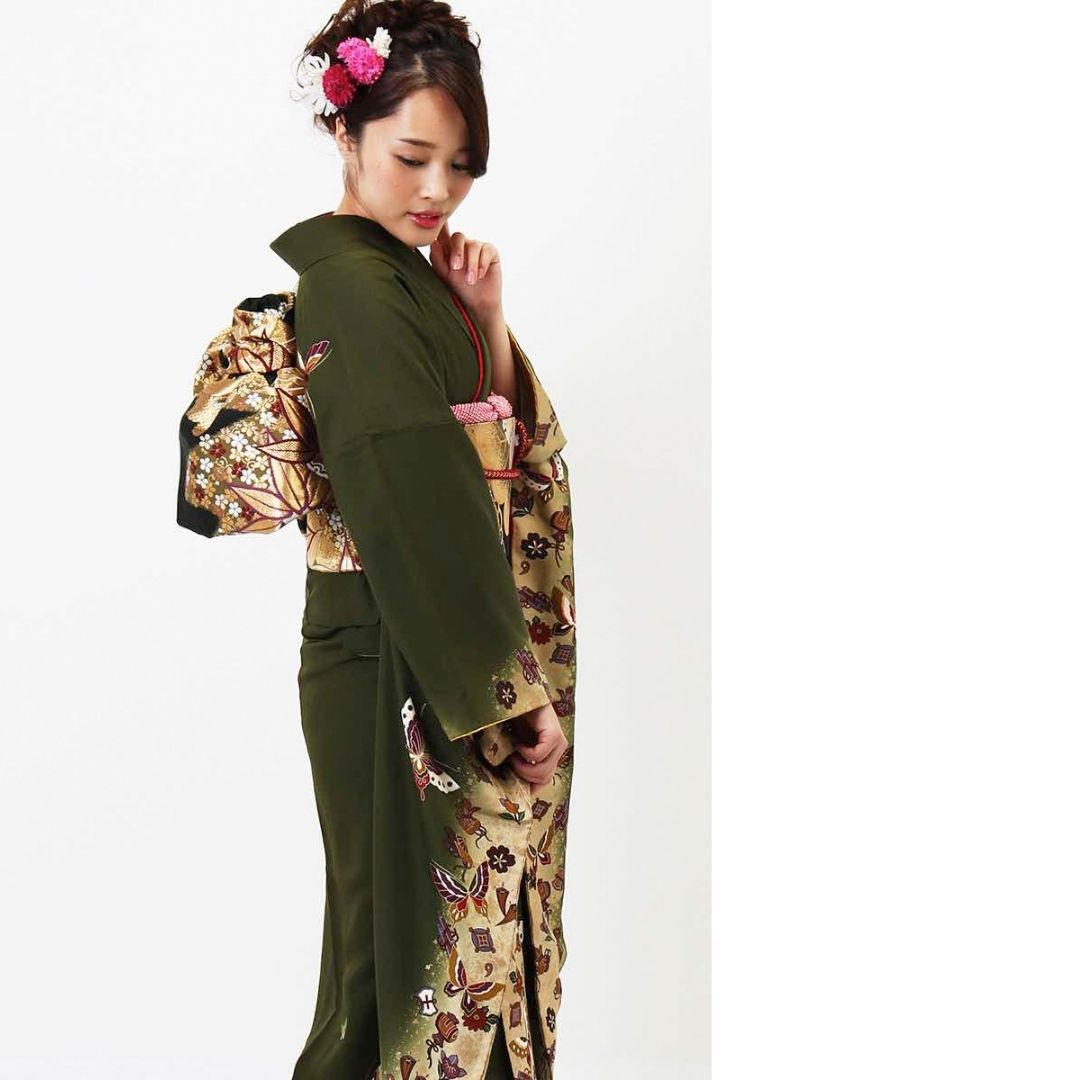 【対応身長160cm~175cm】【レトロ・アンティーク】【正絹】成人式レンタル振袖フルセット-130 花柄 レトロ クール系 ポップキュート 緑系 蝶 小槌 桜