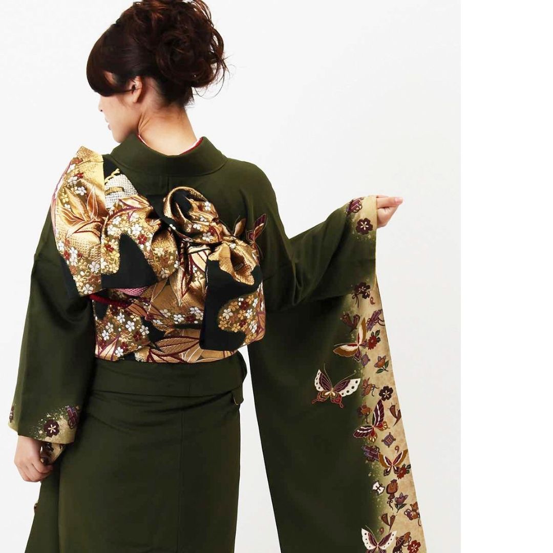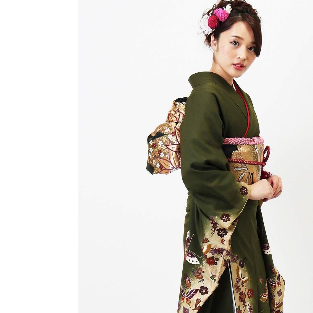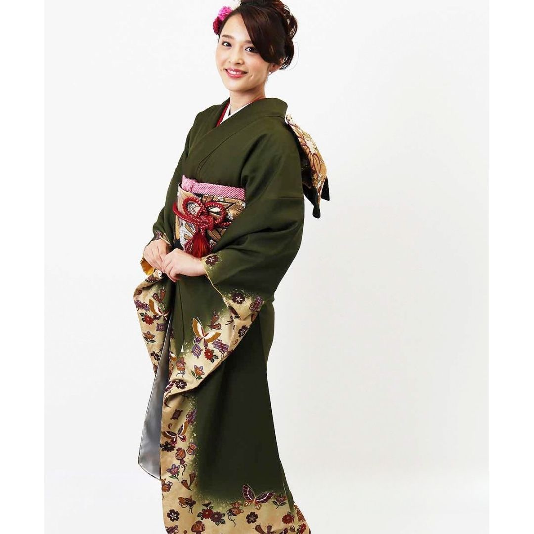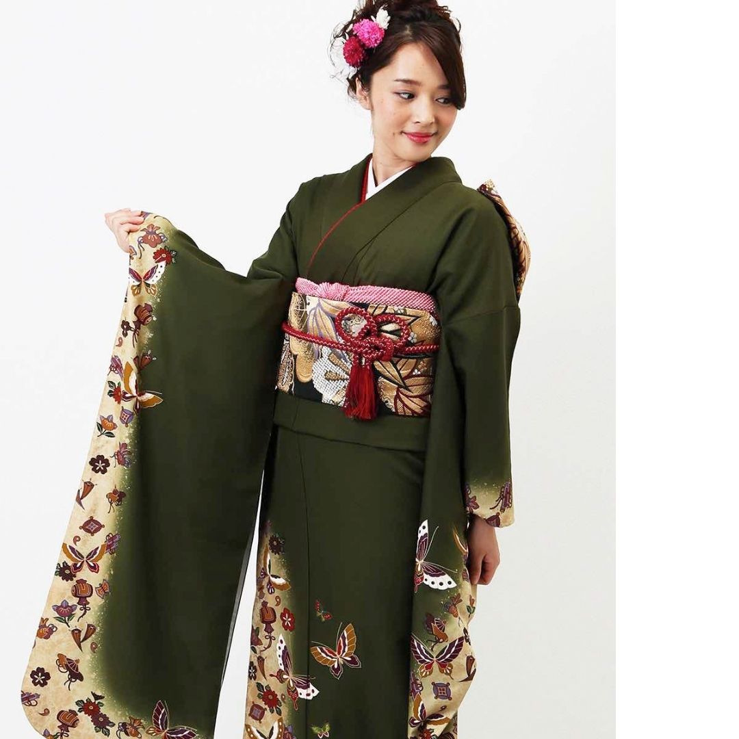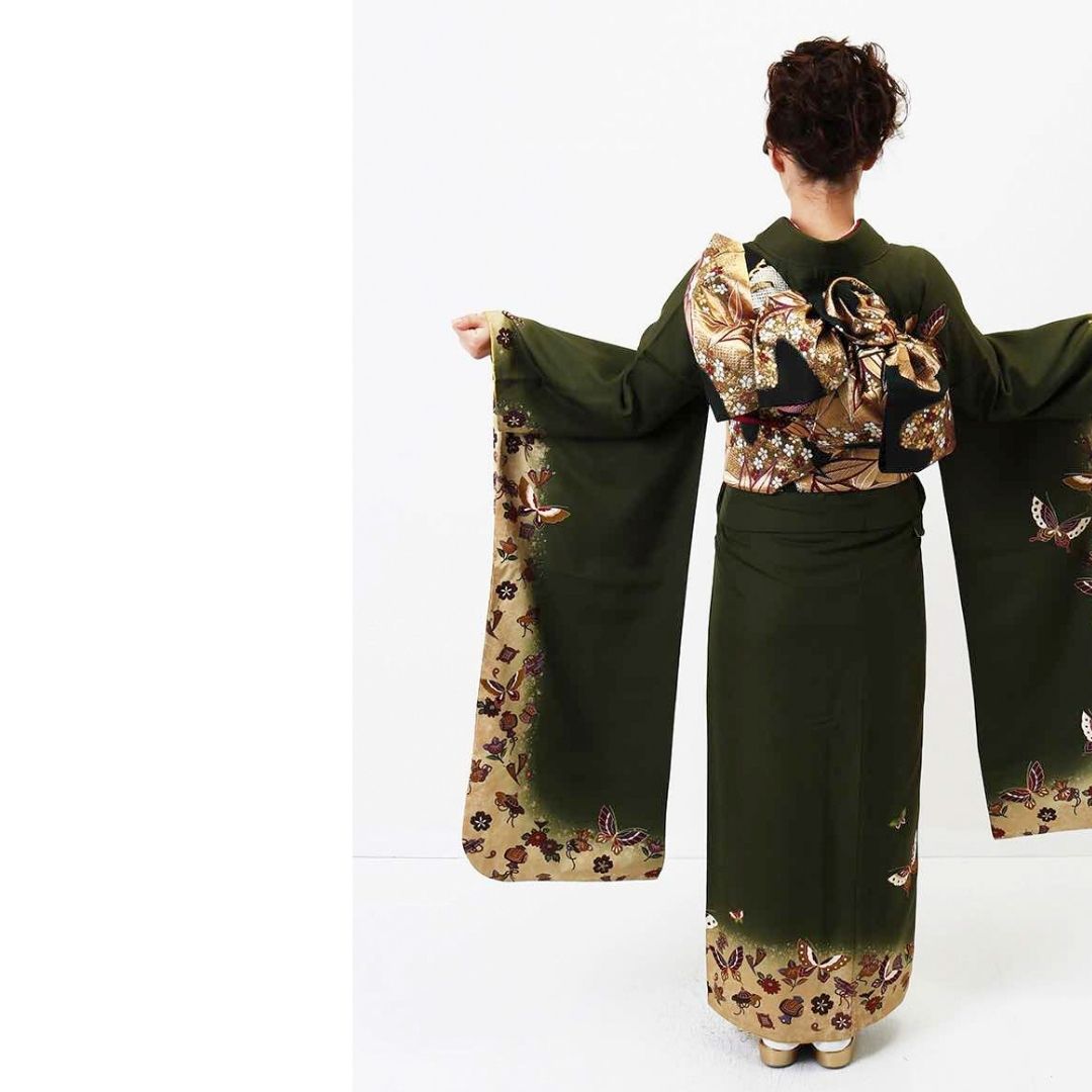 【対応身長160cm~175cm】【レトロ・アンティーク】【正絹】成人式レンタル振袖フルセット-130 花柄 レトロ クール系 ポップキュート 緑系 蝶 小槌 桜