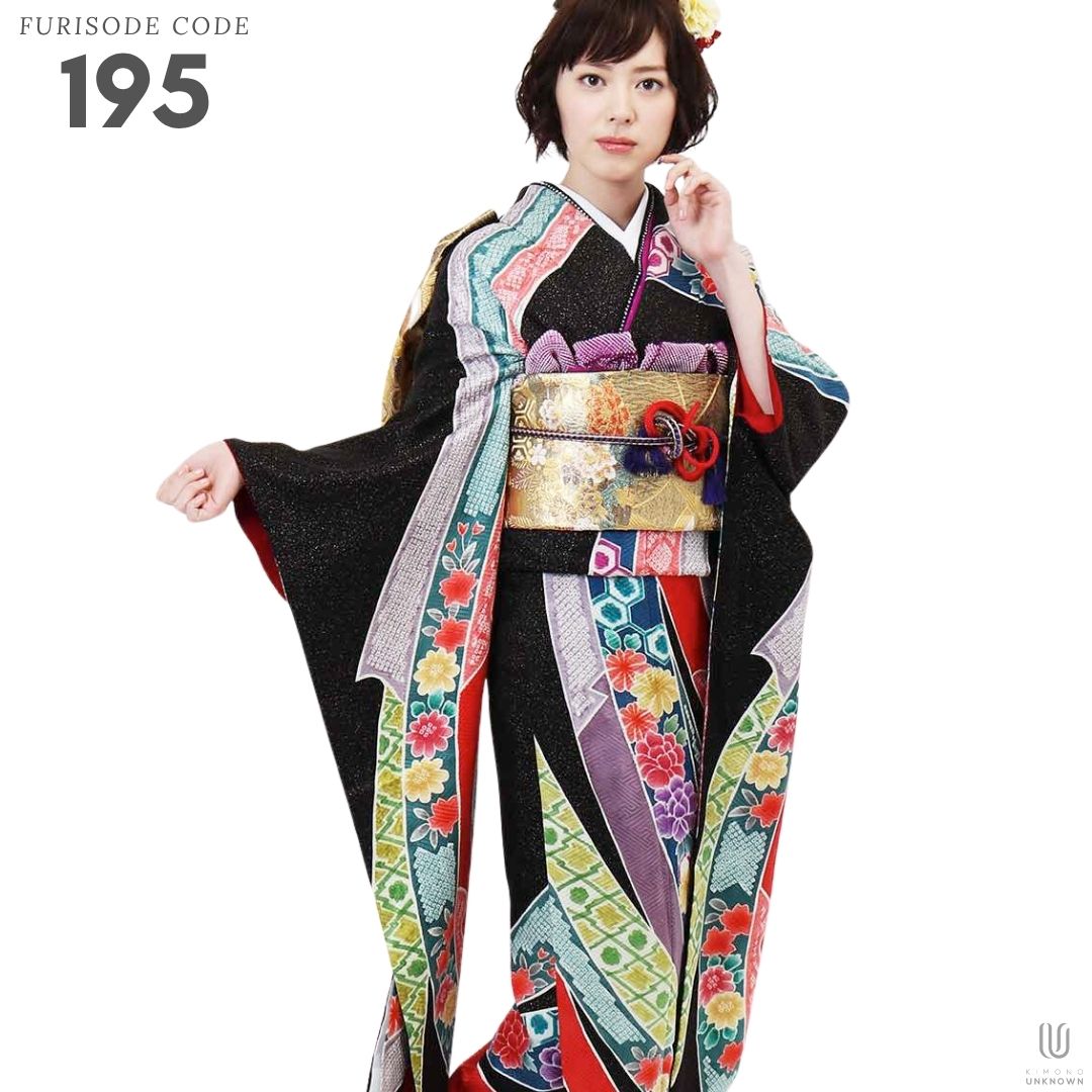 【対応身長155cm~170cm】【レトロ・アンティーク】【正絹】成人式レンタル振袖フルセット-195 花柄 レトロ クール系 古典 黒系 赤系 緑系 束ね熨斗 絞り柄 牡丹 豪華